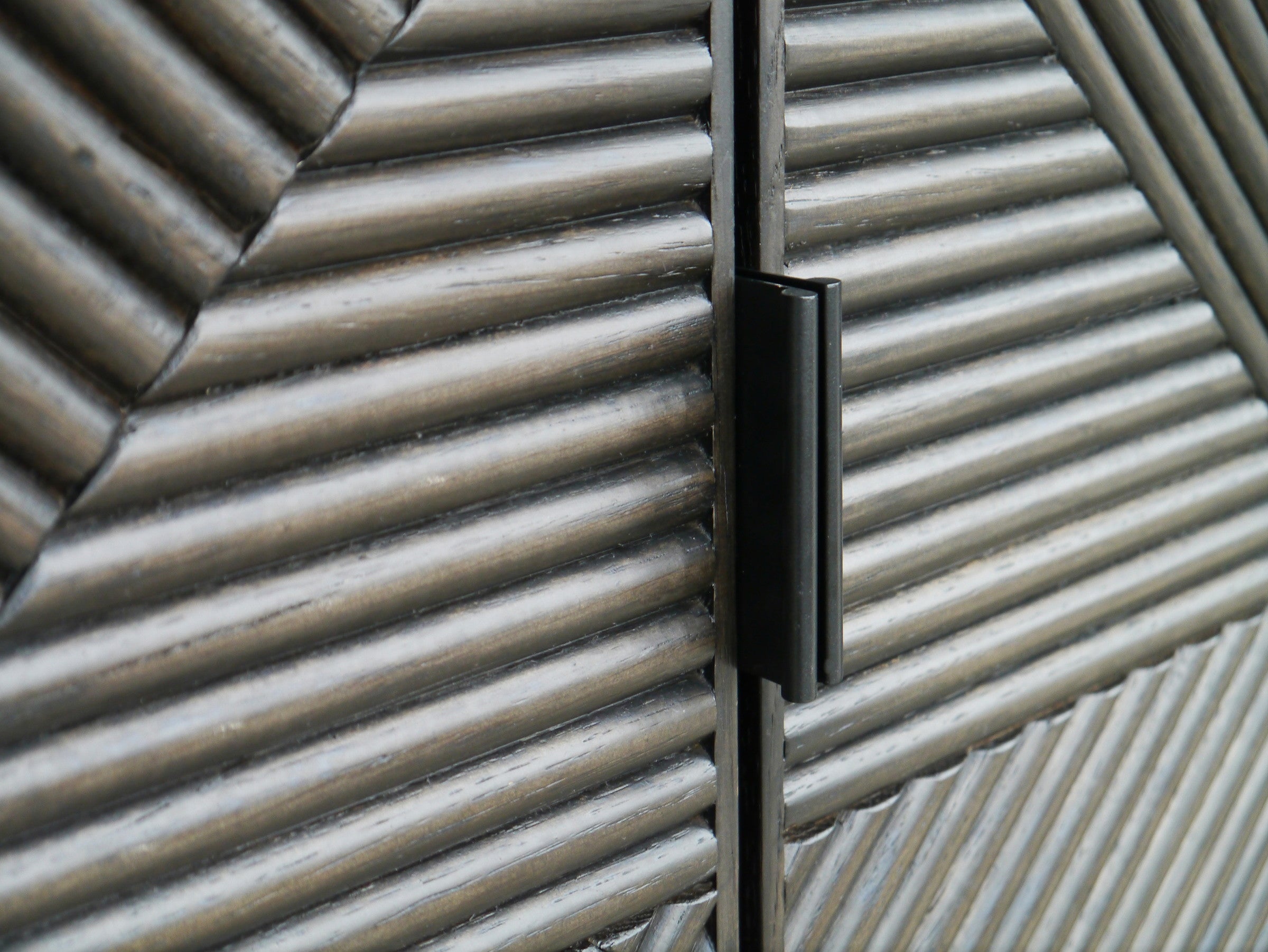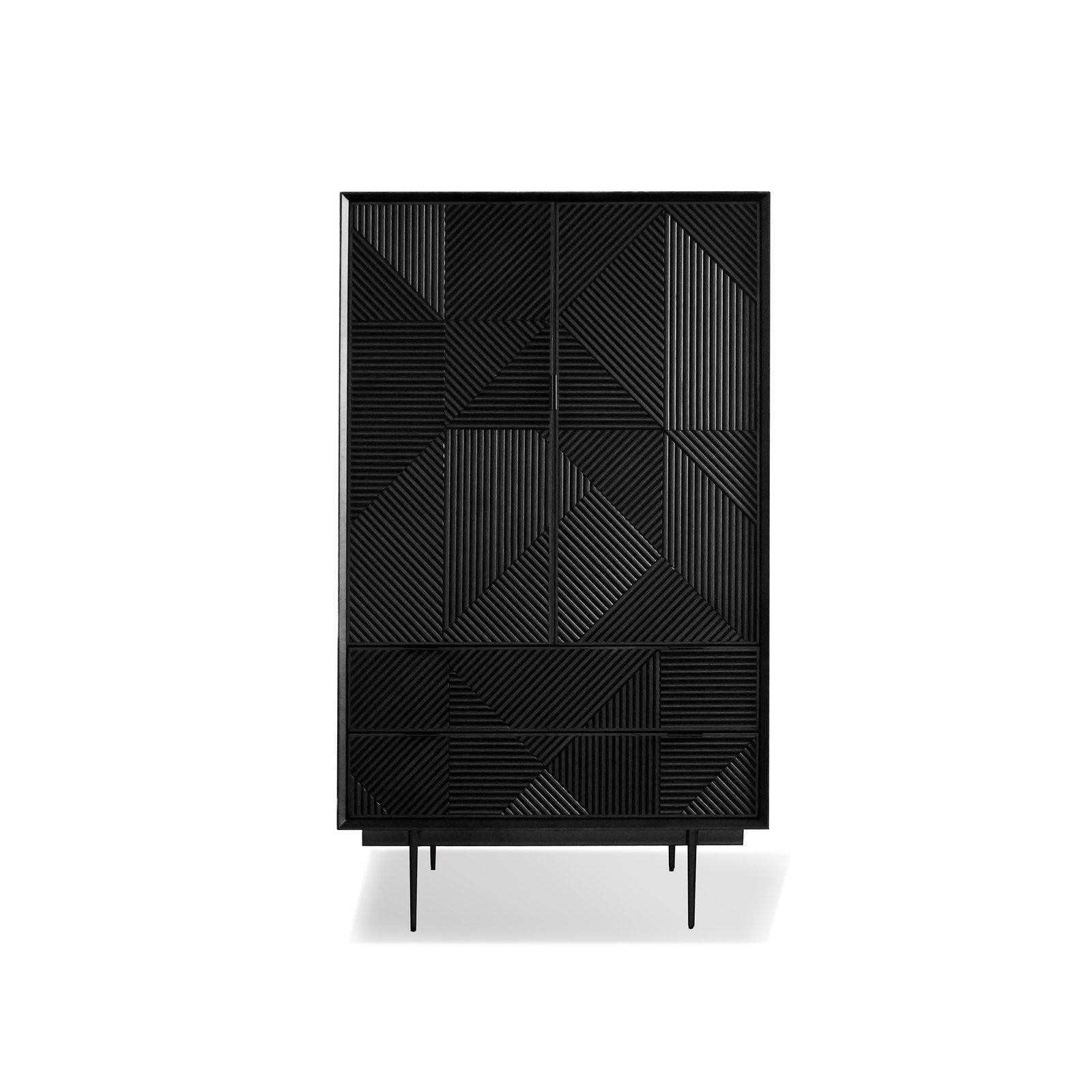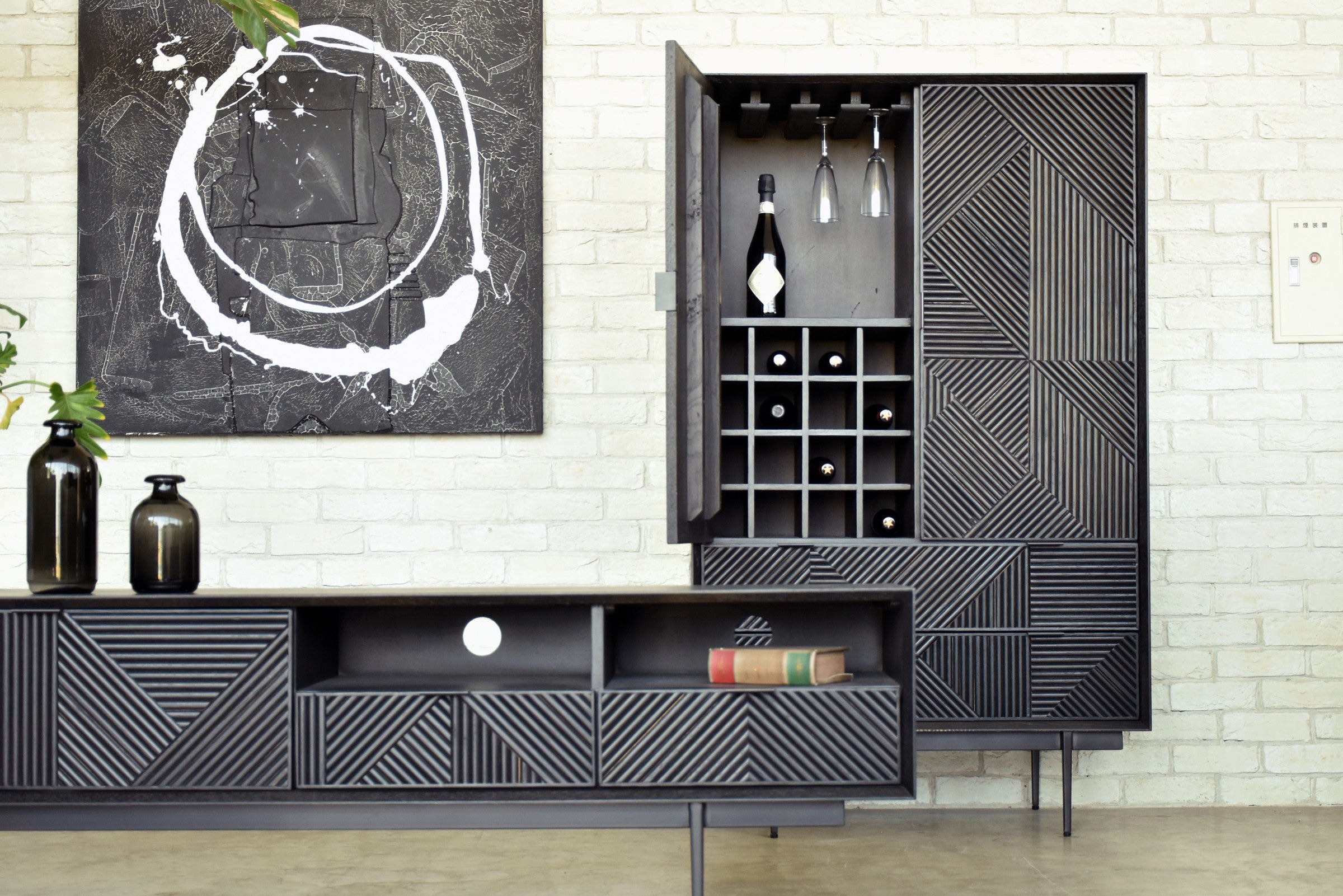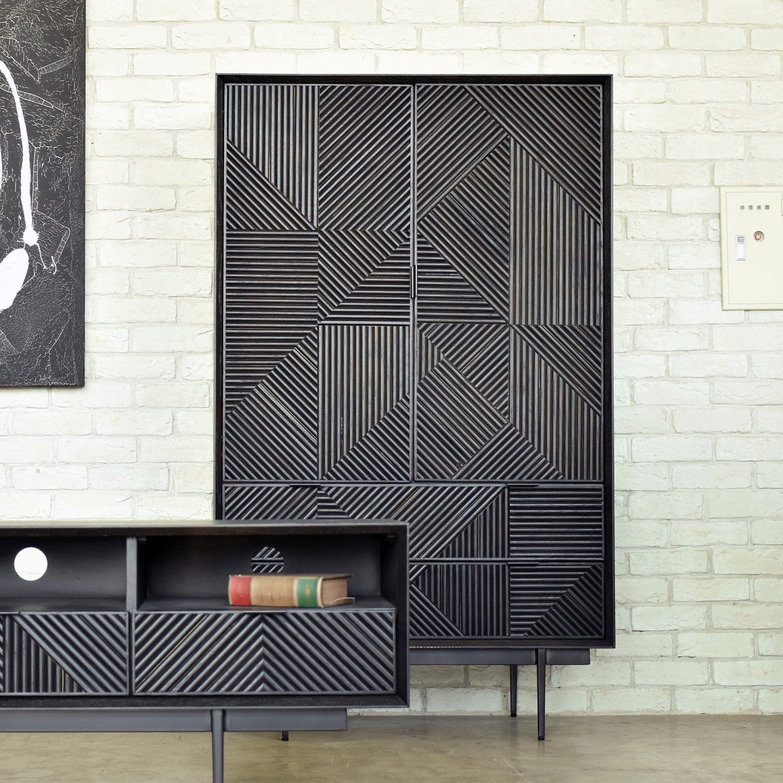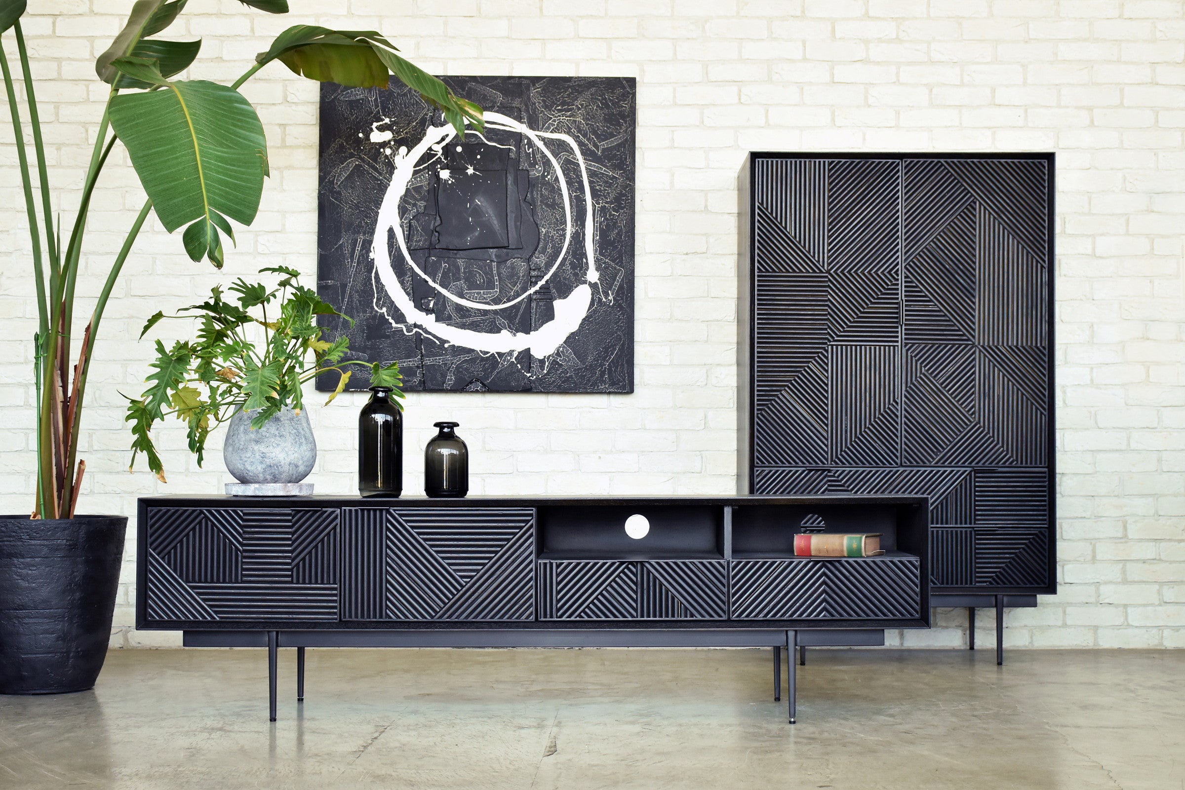 特徴的な前板と、細く繊細なスチール脚が特徴的なサイドボードです。マットブラック1色なのに見る角度、光の角度で表情が変わる、飽きの来ないデザインが特徴です。シックなデザインでもお部屋で存在感を発揮します。