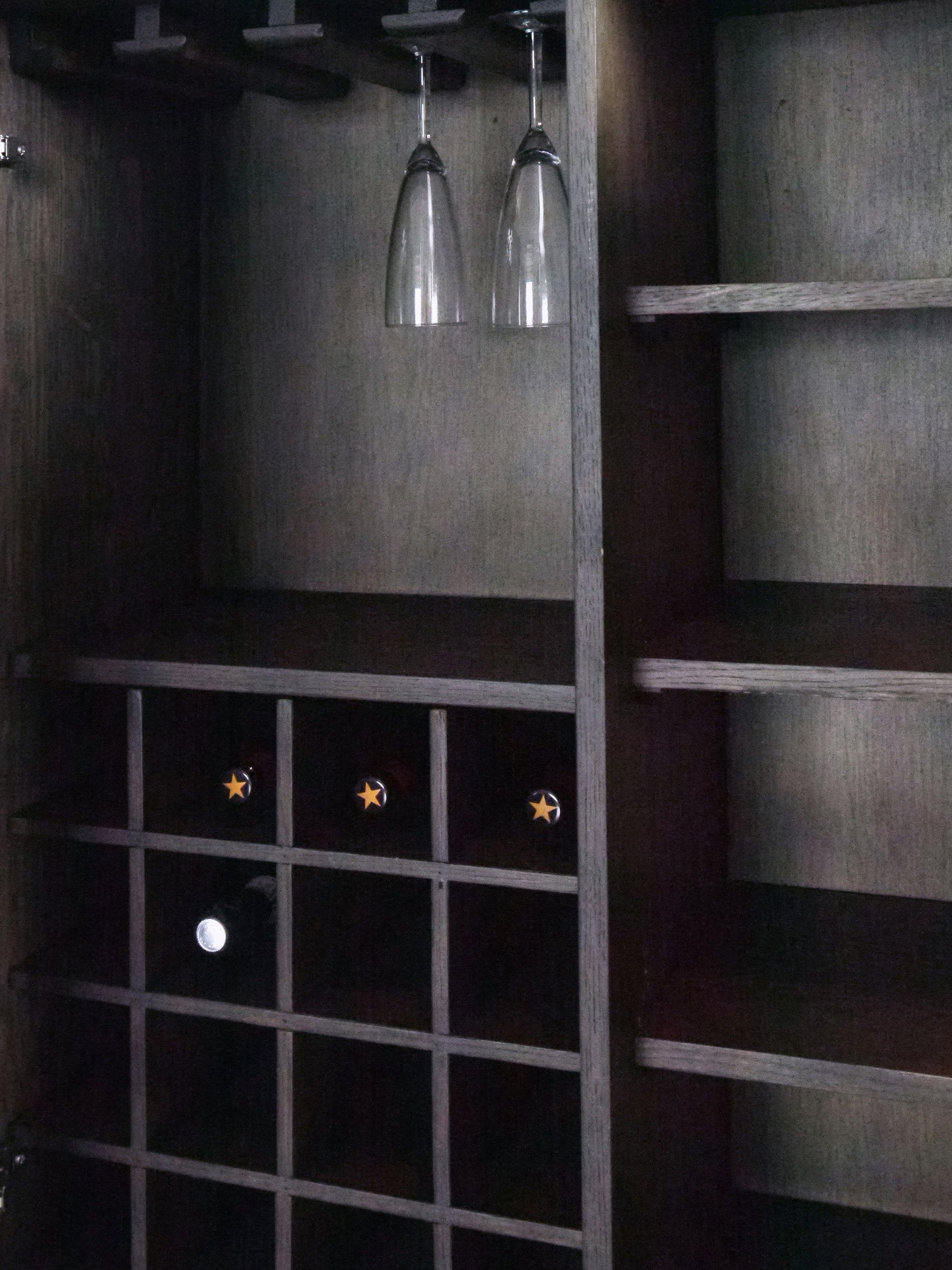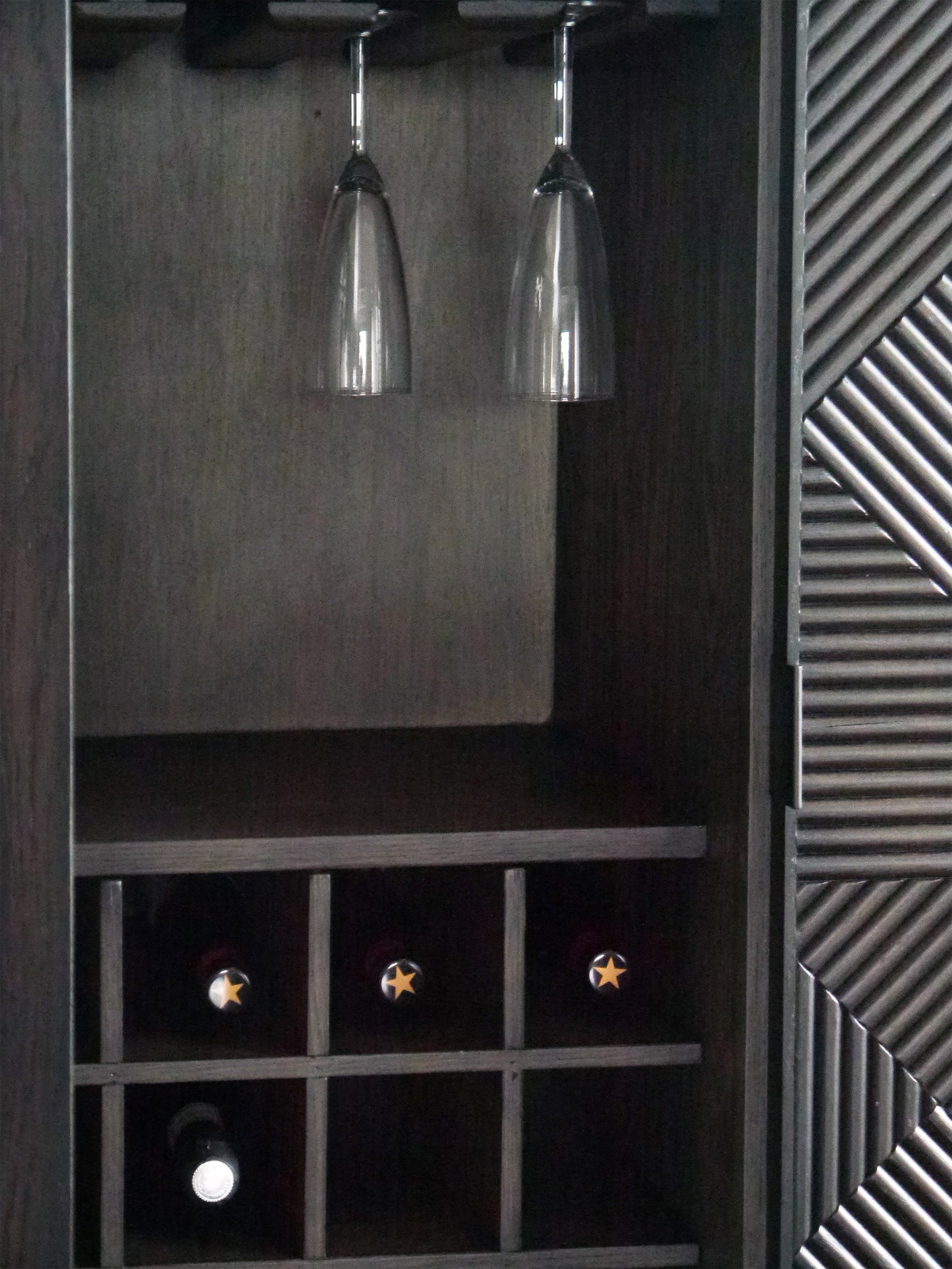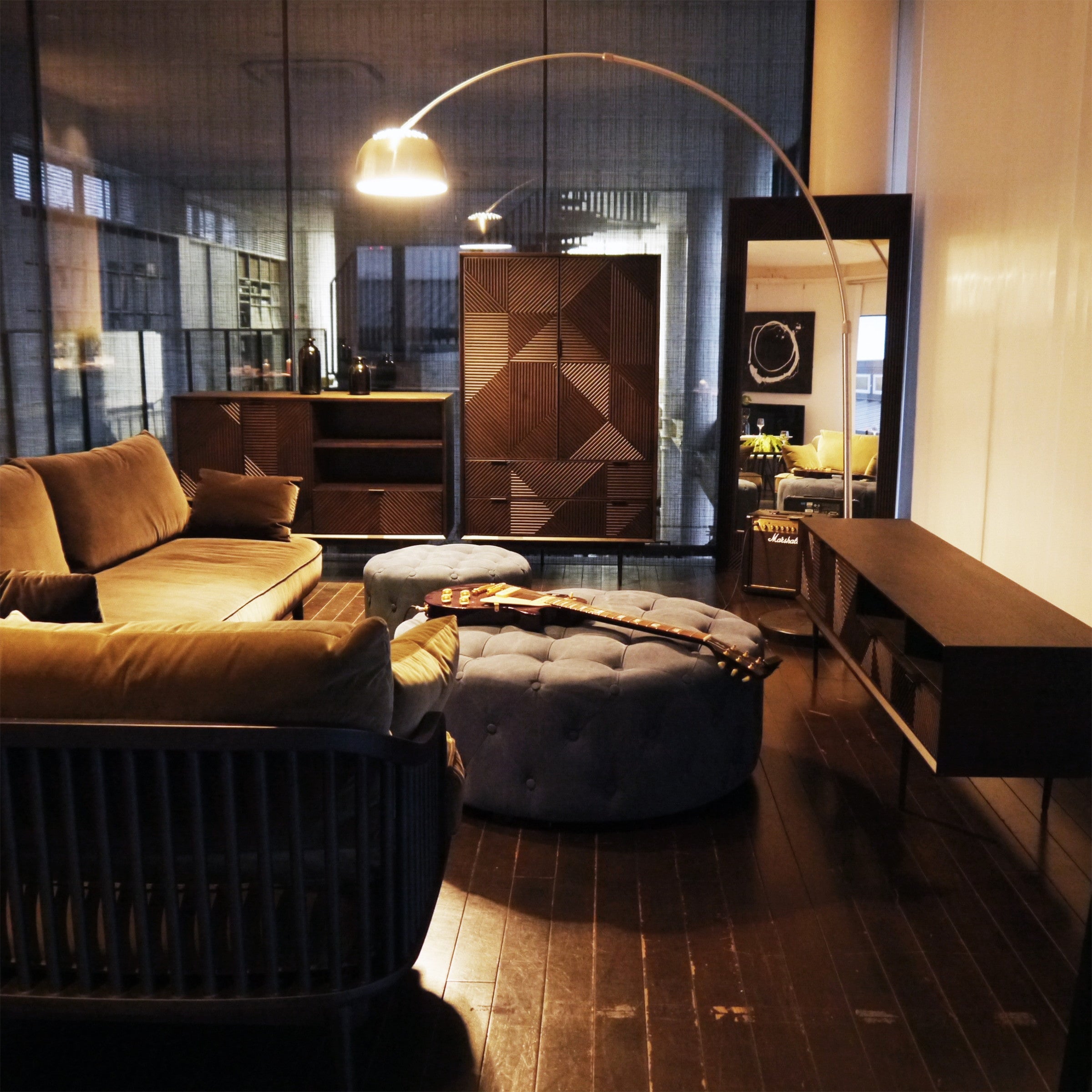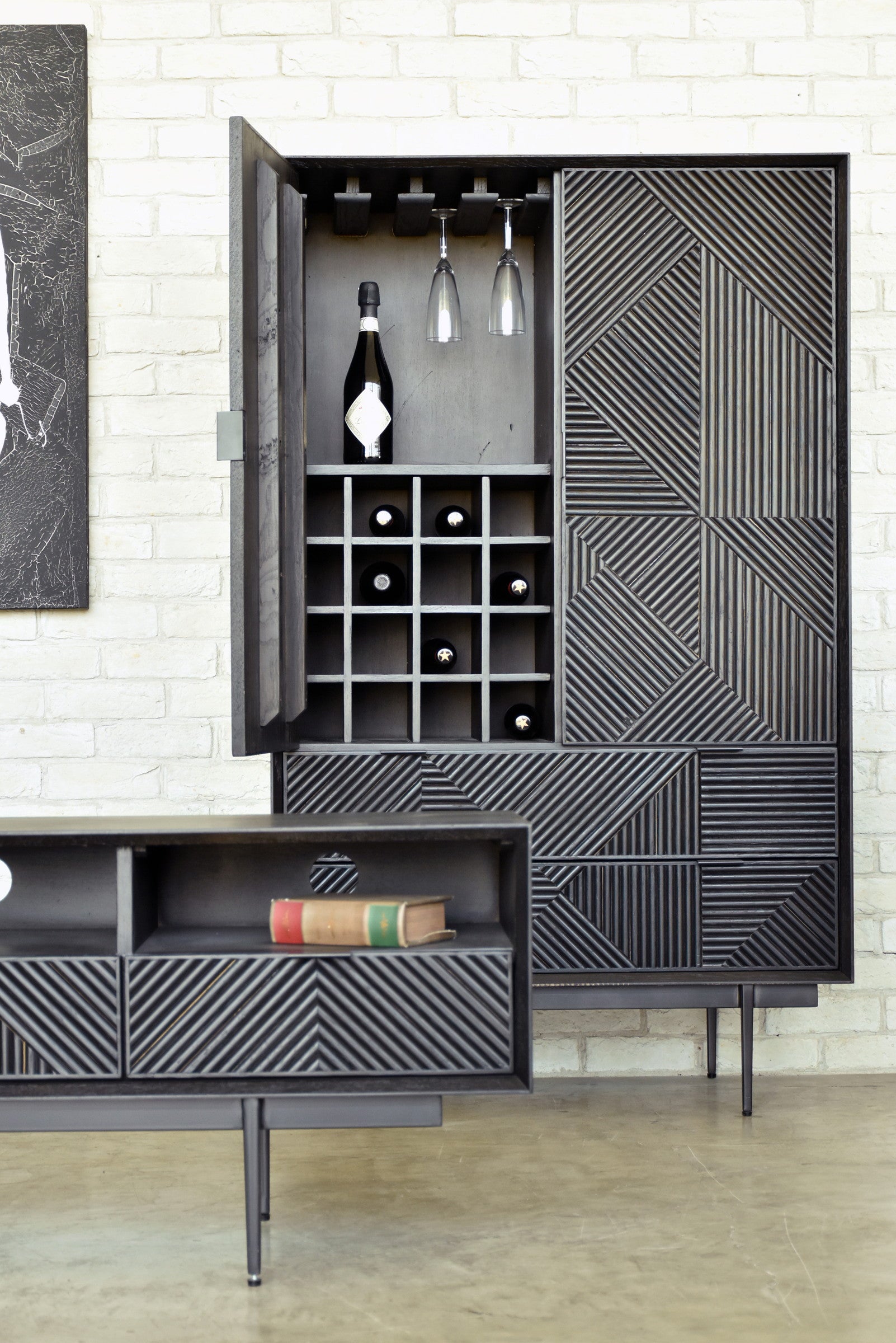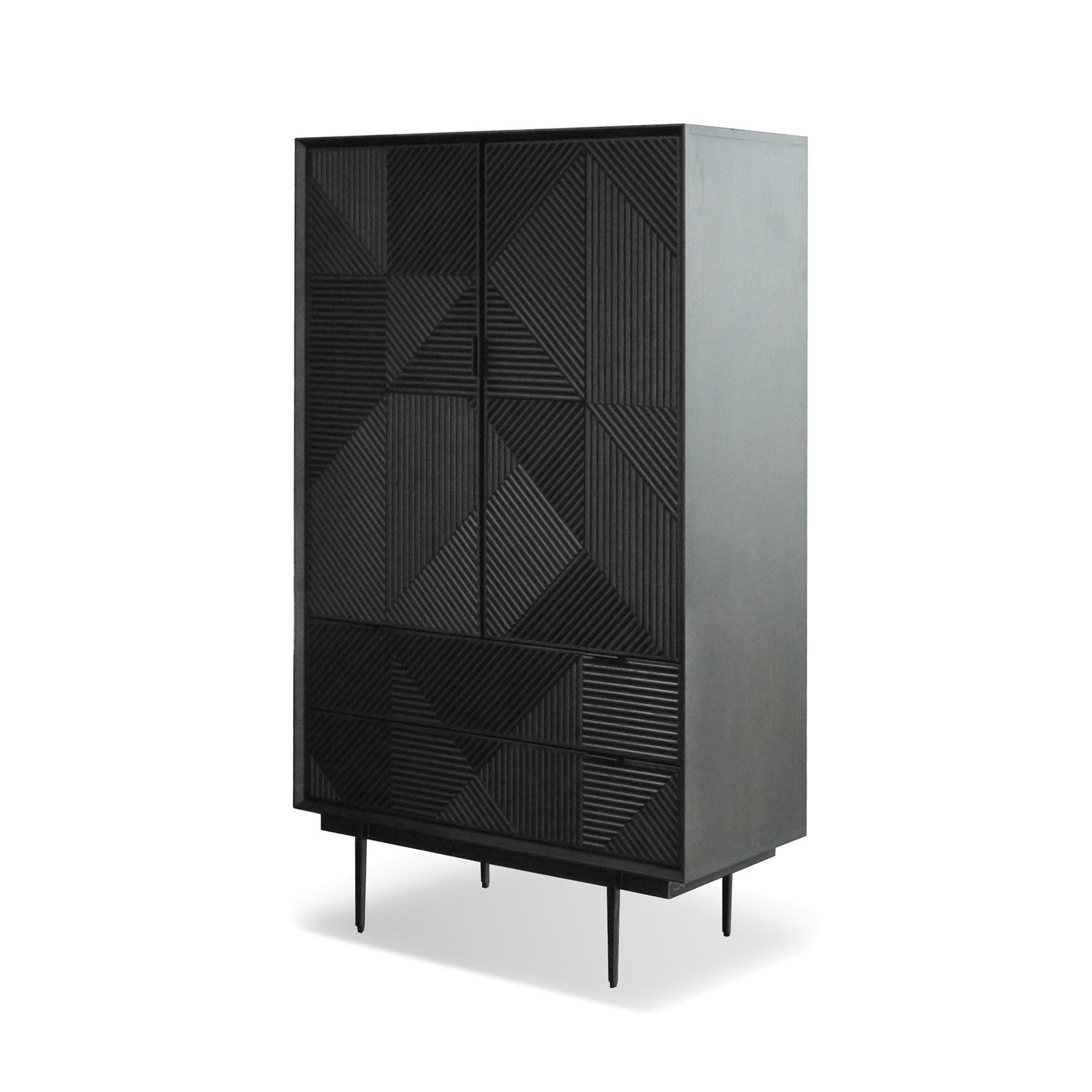 特徴的な前板と、細く繊細なスチール脚が特徴的なサイドボードです。マットブラック1色なのに見る角度、光の角度で表情が変わる、飽きの来ないデザインが特徴です。シックなデザインでもお部屋で存在感を発揮します。