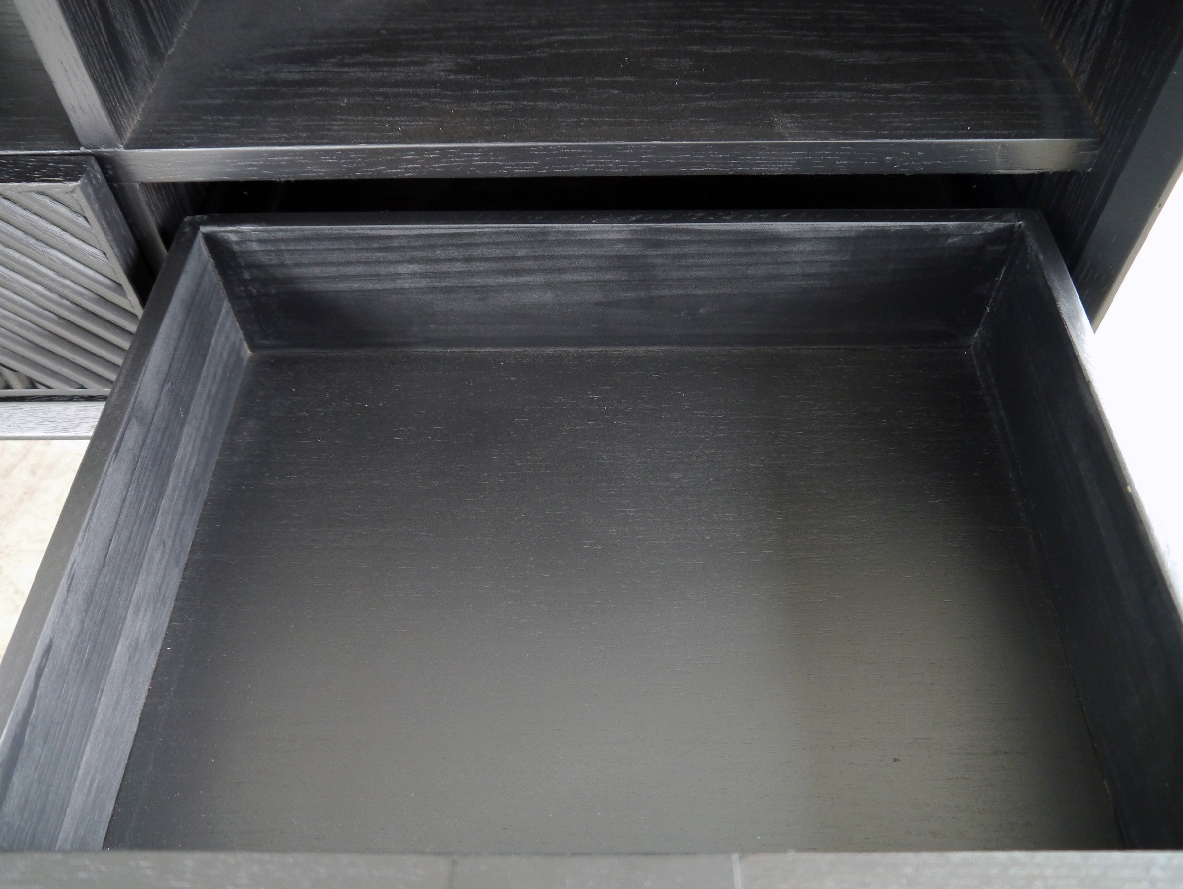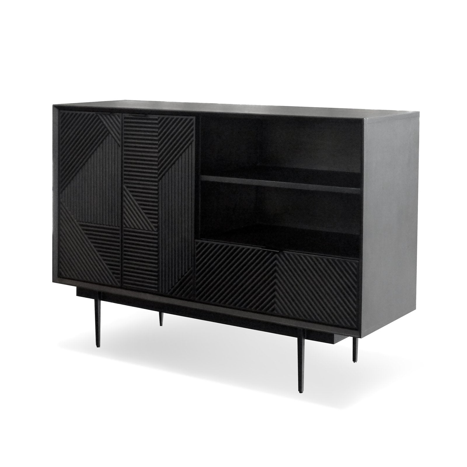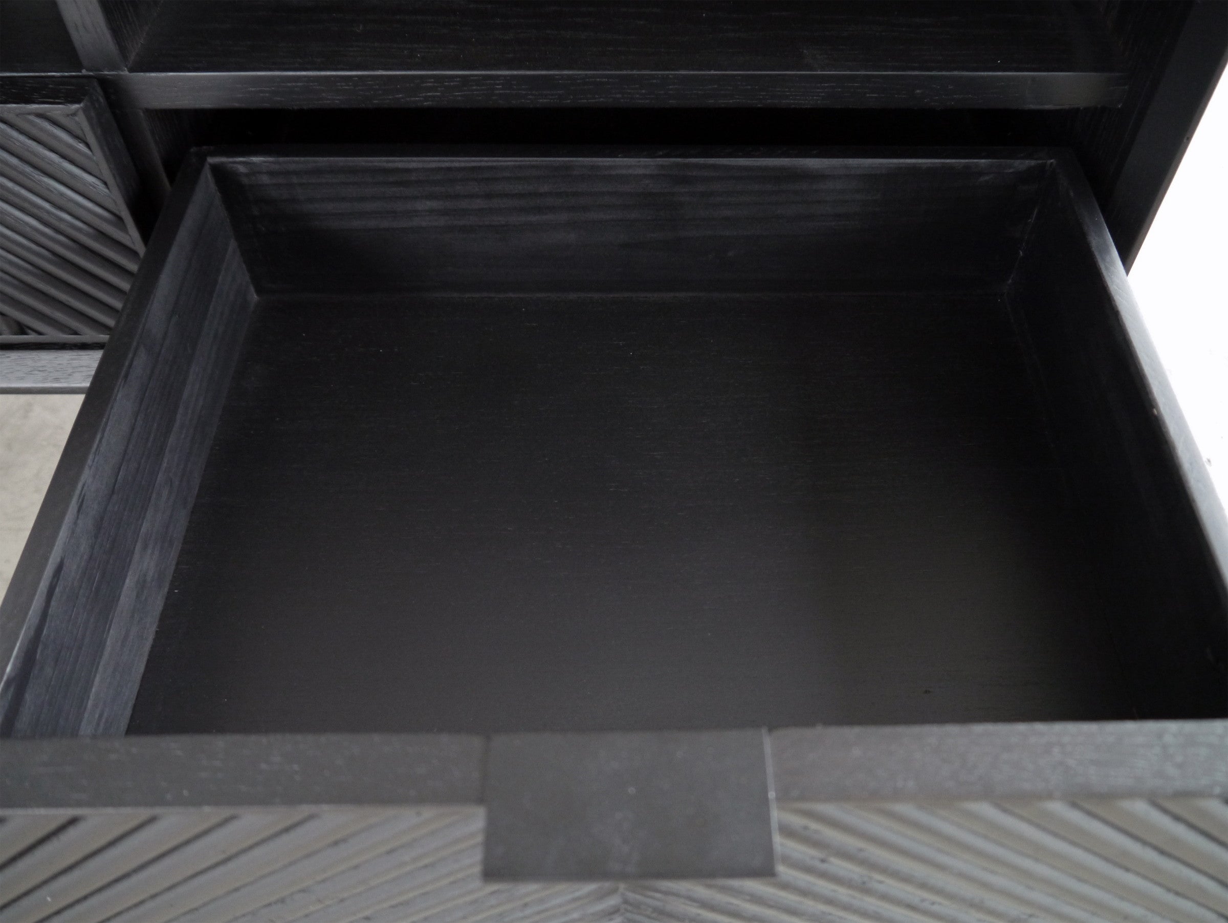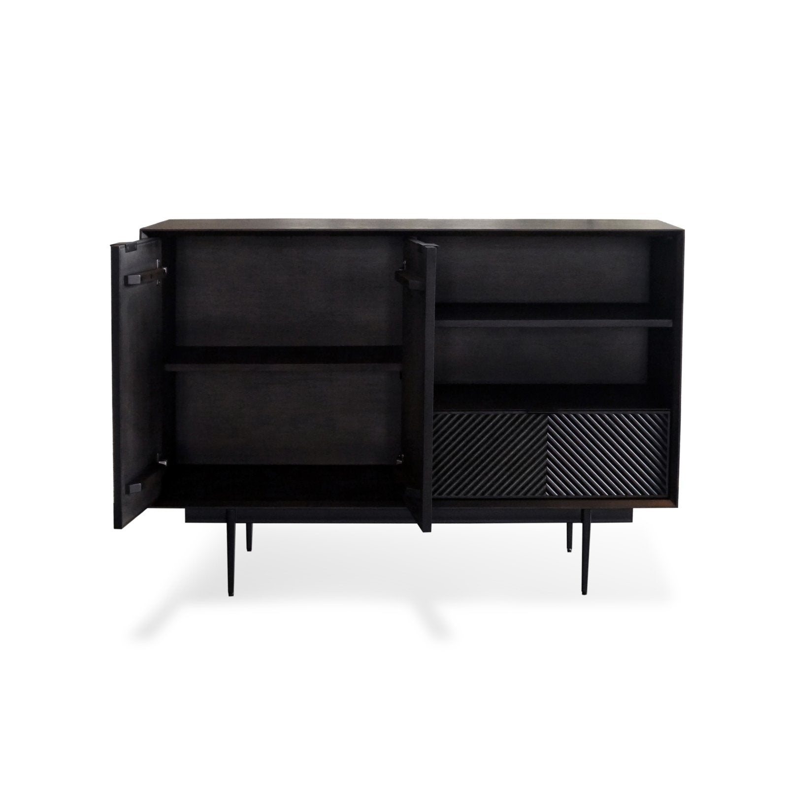 特徴的な前板と、細く繊細なスチール脚が特徴的なサイドボードです。マットブラック1色なのに見る角度、光の角度で表情が変わる、飽きの来ないデザインが特徴です。シックなデザインでもお部屋で存在感を発揮します。