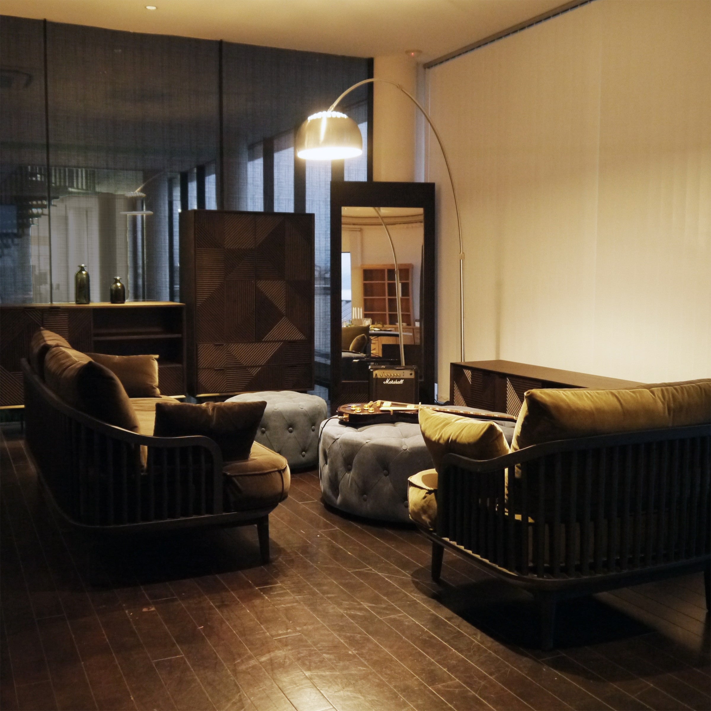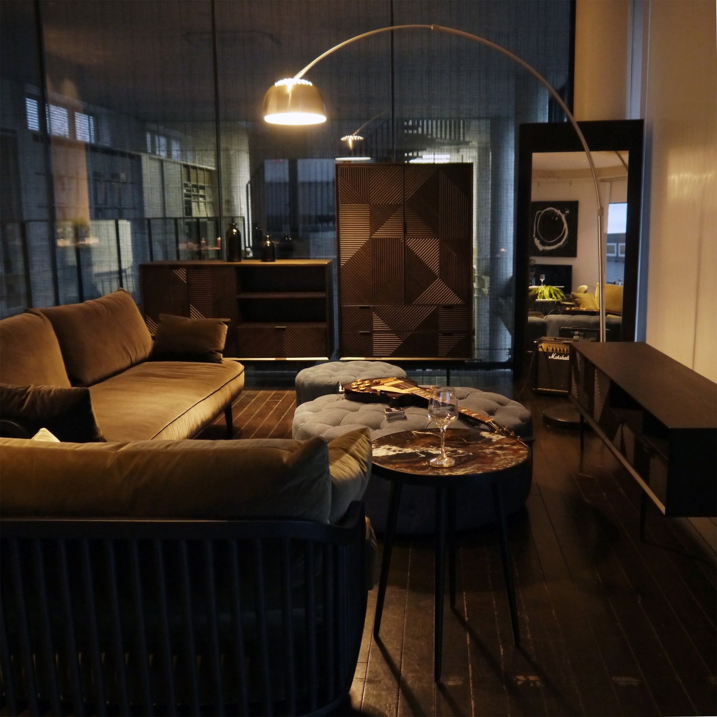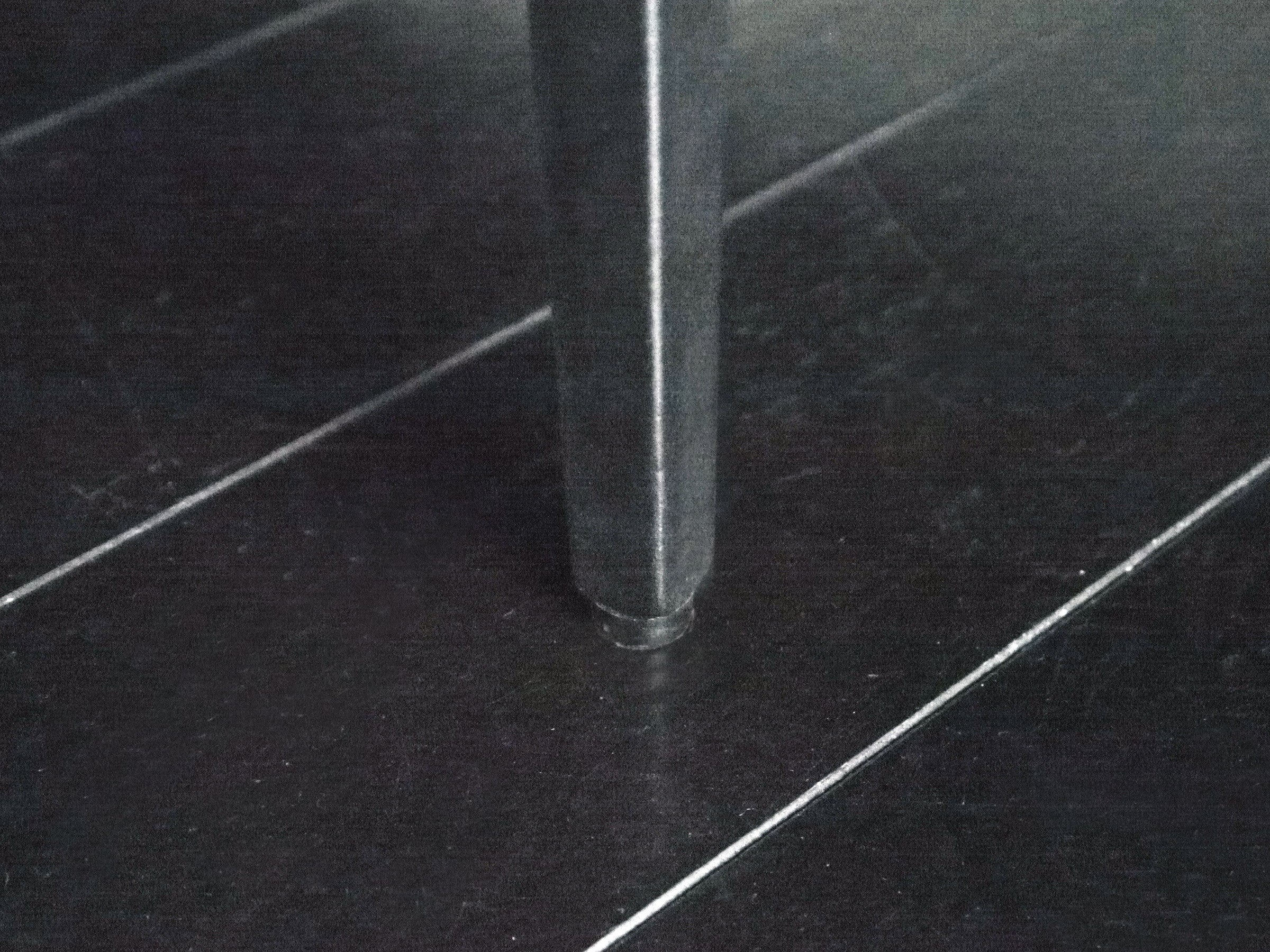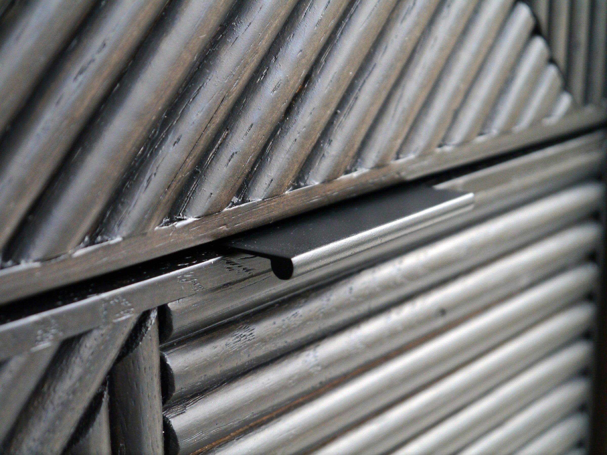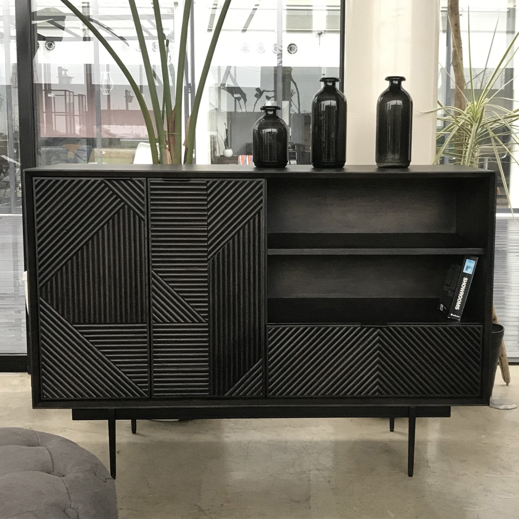 特徴的な前板と、細く繊細なスチール脚が特徴的なサイドボードです。マットブラック1色なのに見る角度、光の角度で表情が変わる、飽きの来ないデザインが特徴です。シックなデザインでもお部屋で存在感を発揮します。