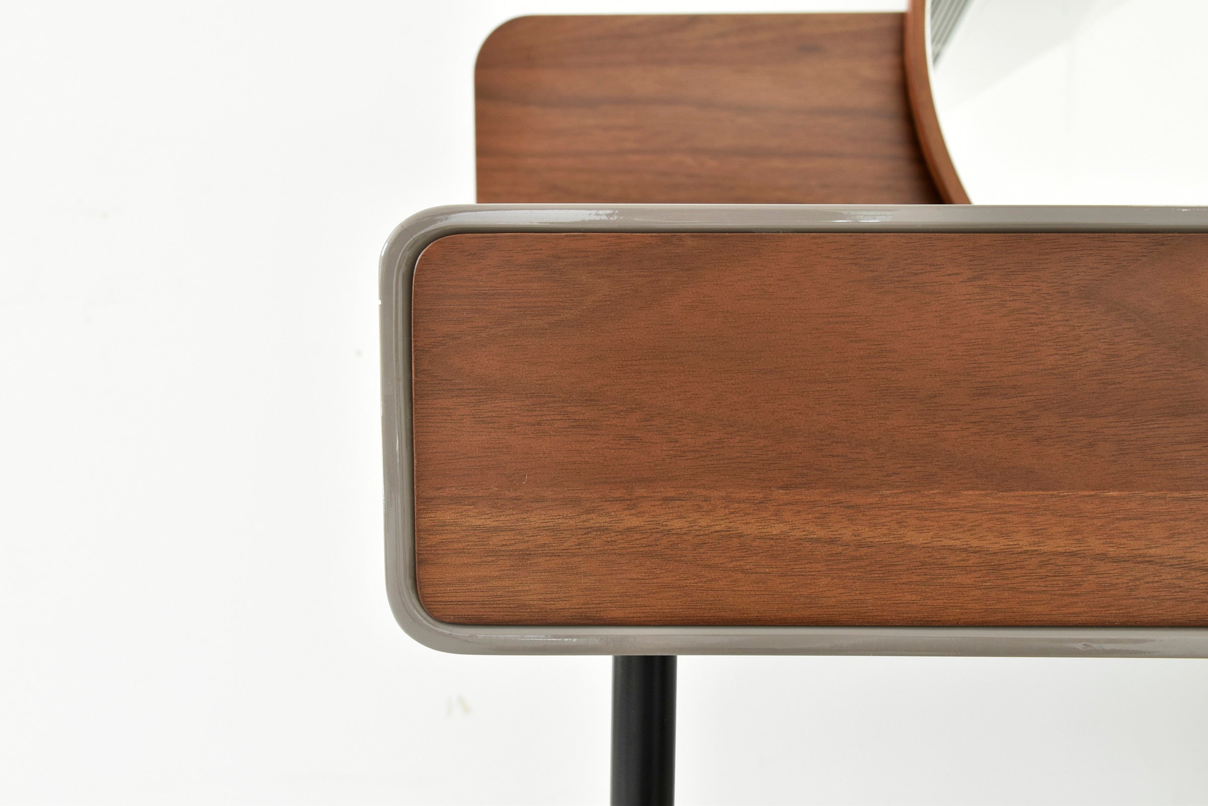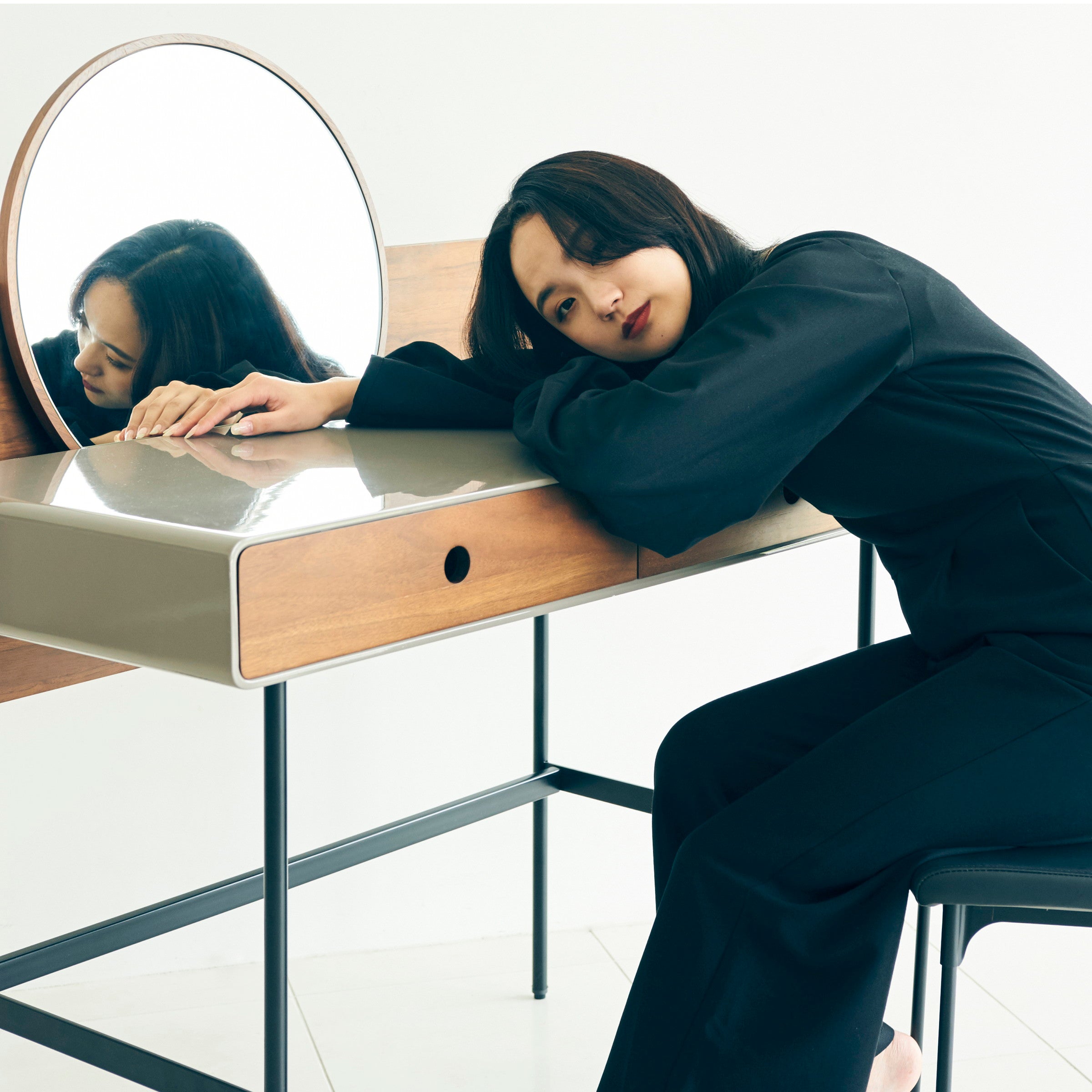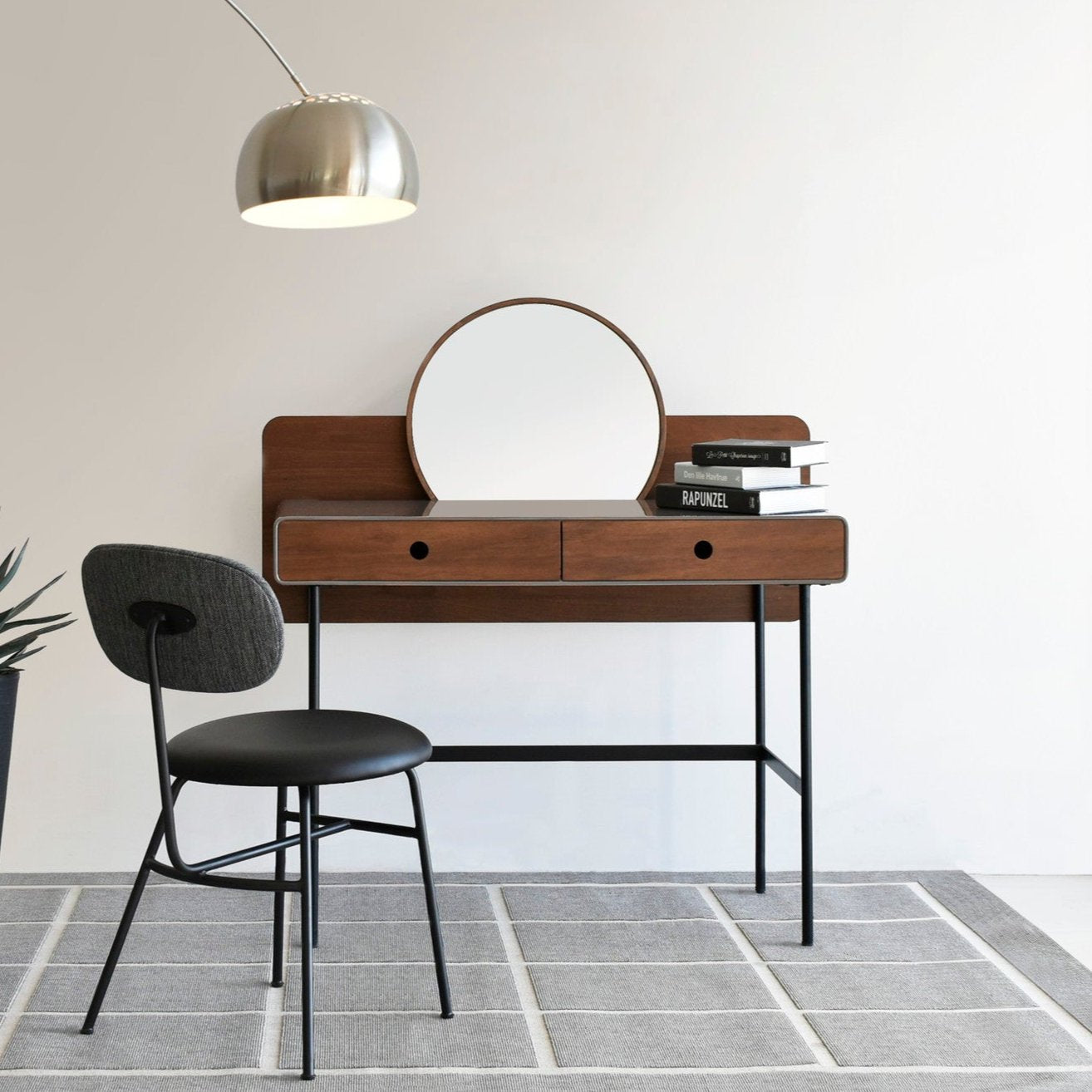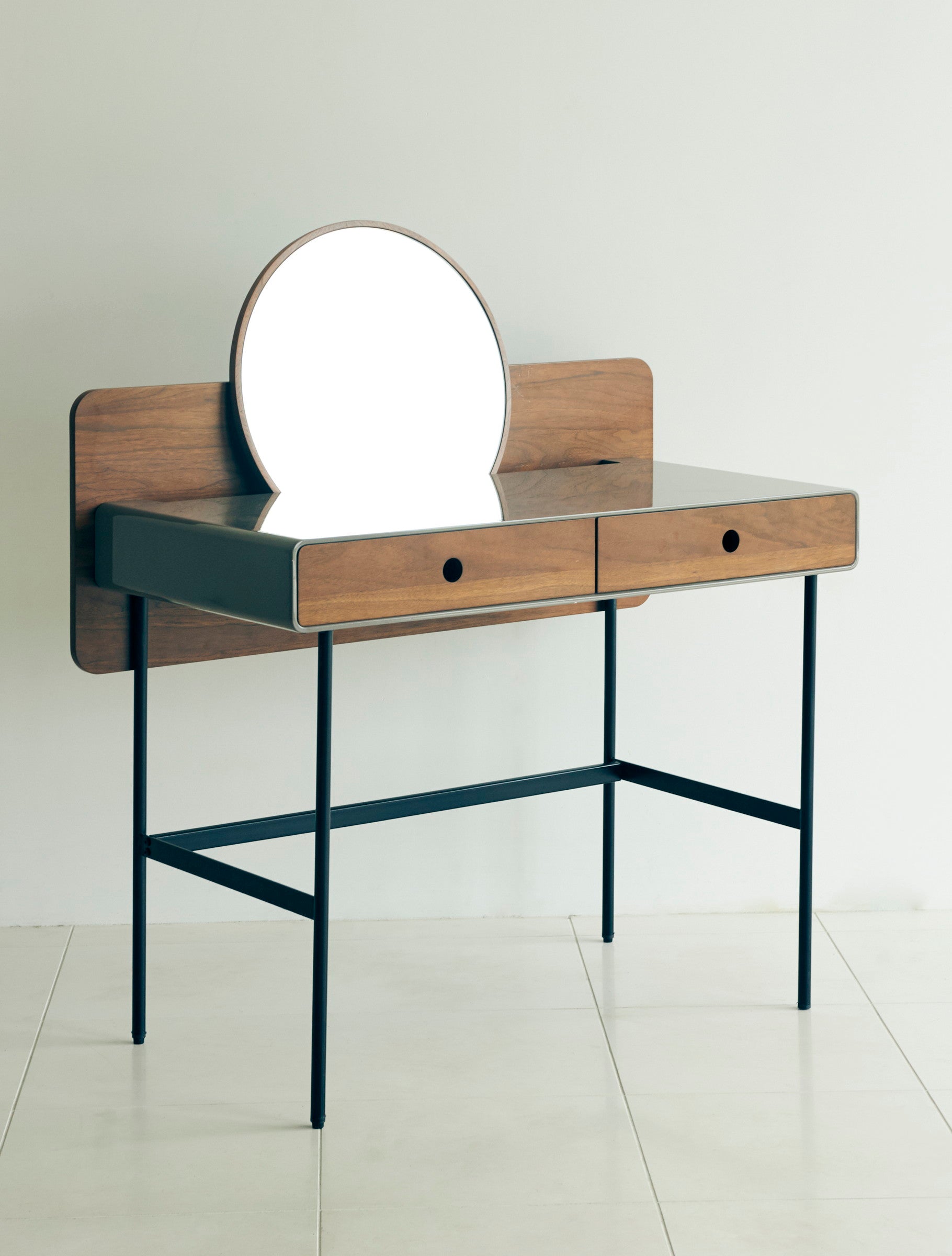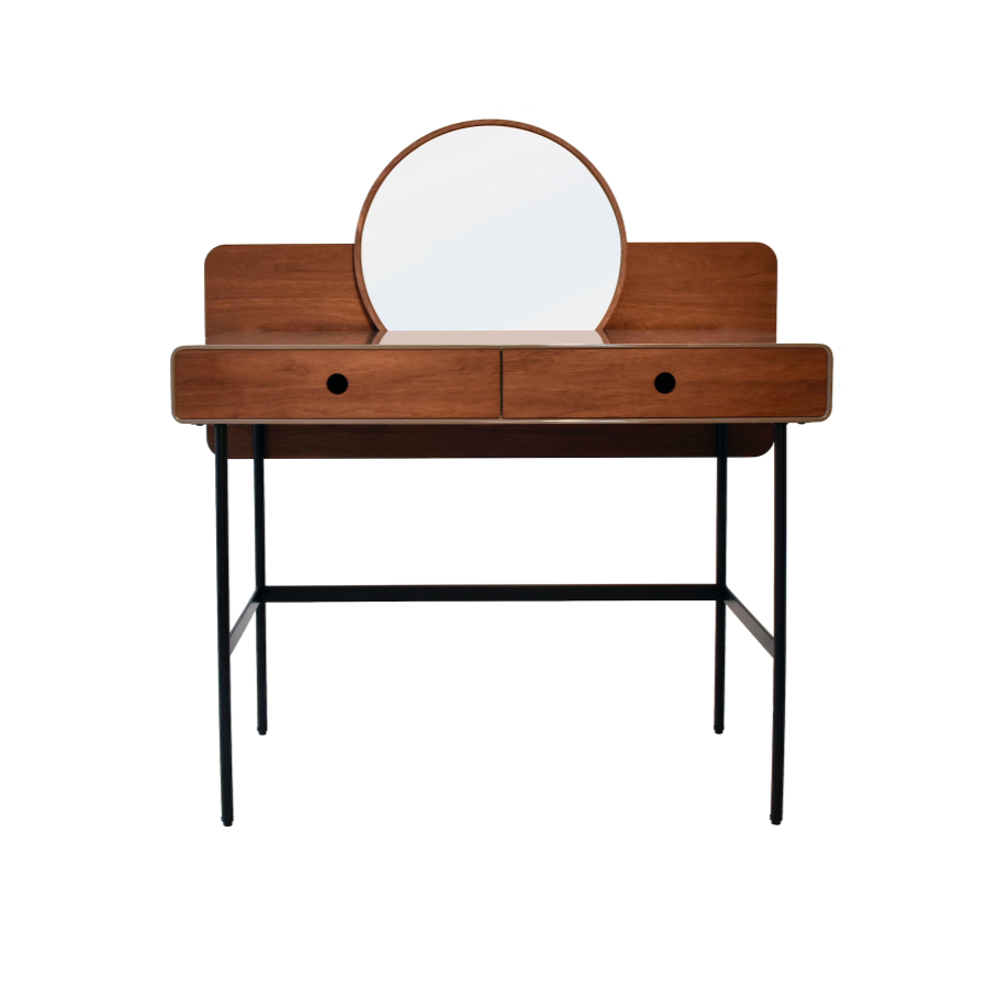 コンパクトで丸みあるエッジが可愛らしいデスクにミラーを足したドレッサーです。デザインと機能が調和した新しいドレッシングデスクです。デスクとドレッサー、1台2役のハイブリットデザインで、スリムな奥行なので限られたスペースにも置きやすいサイズ感です。背面も美しい木目調を施しているので、お部屋のどの位置に置いても美しい佇まいです。