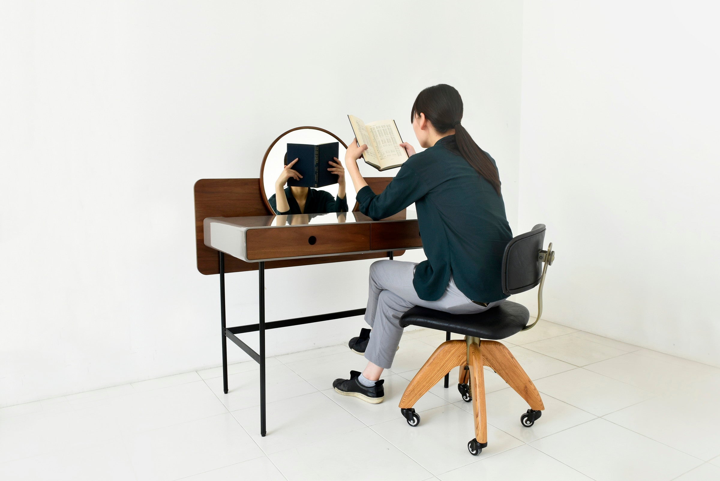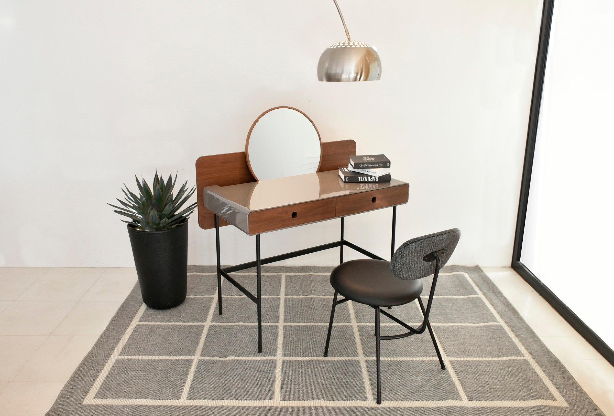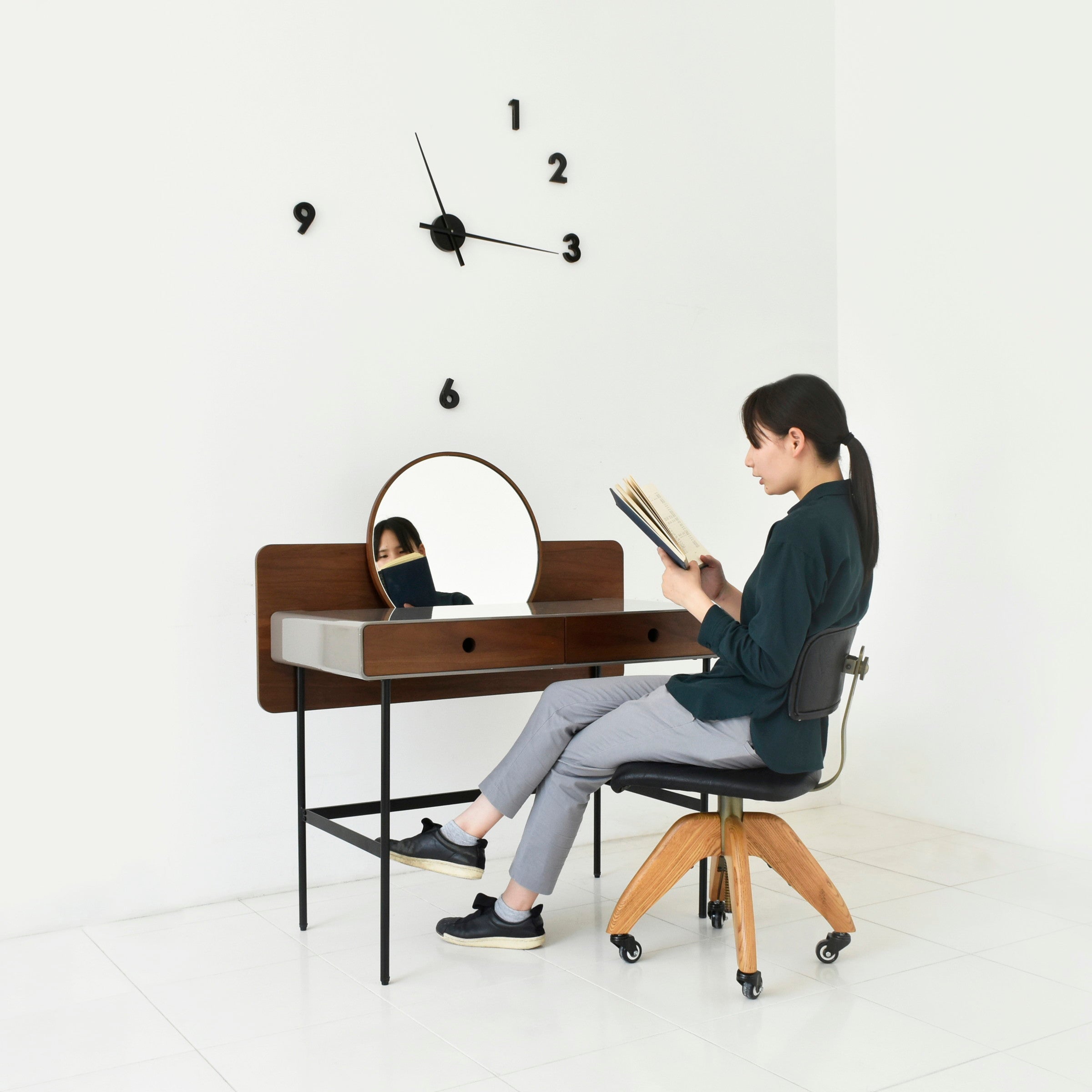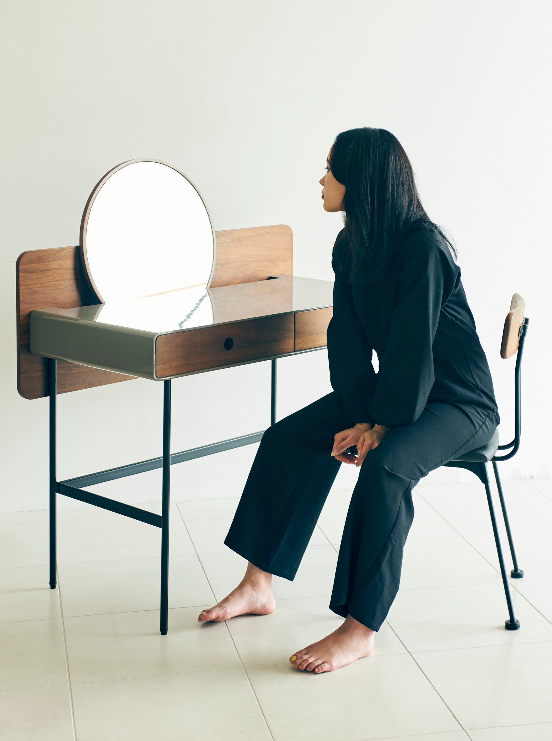 コンパクトで丸みあるエッジが可愛らしいデスクにミラーを足したドレッサーです。デザインと機能が調和した新しいドレッシングデスクです。デスクとドレッサー、1台2役のハイブリットデザインで、スリムな奥行なので限られたスペースにも置きやすいサイズ感です。背面も美しい木目調を施しているので、お部屋のどの位置に置いても美しい佇まいです。