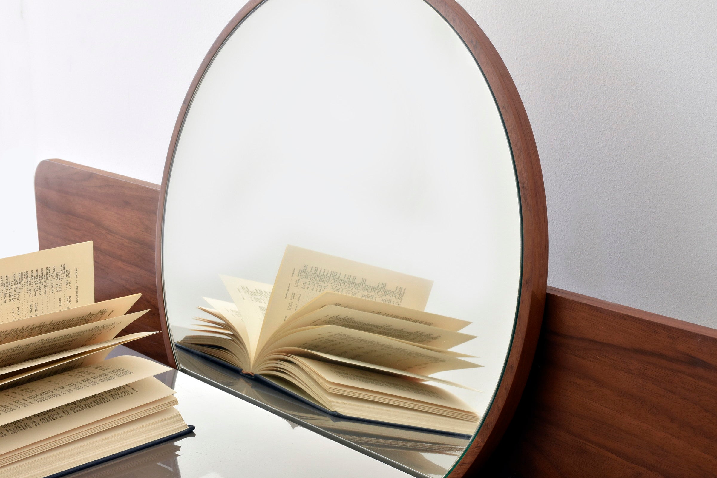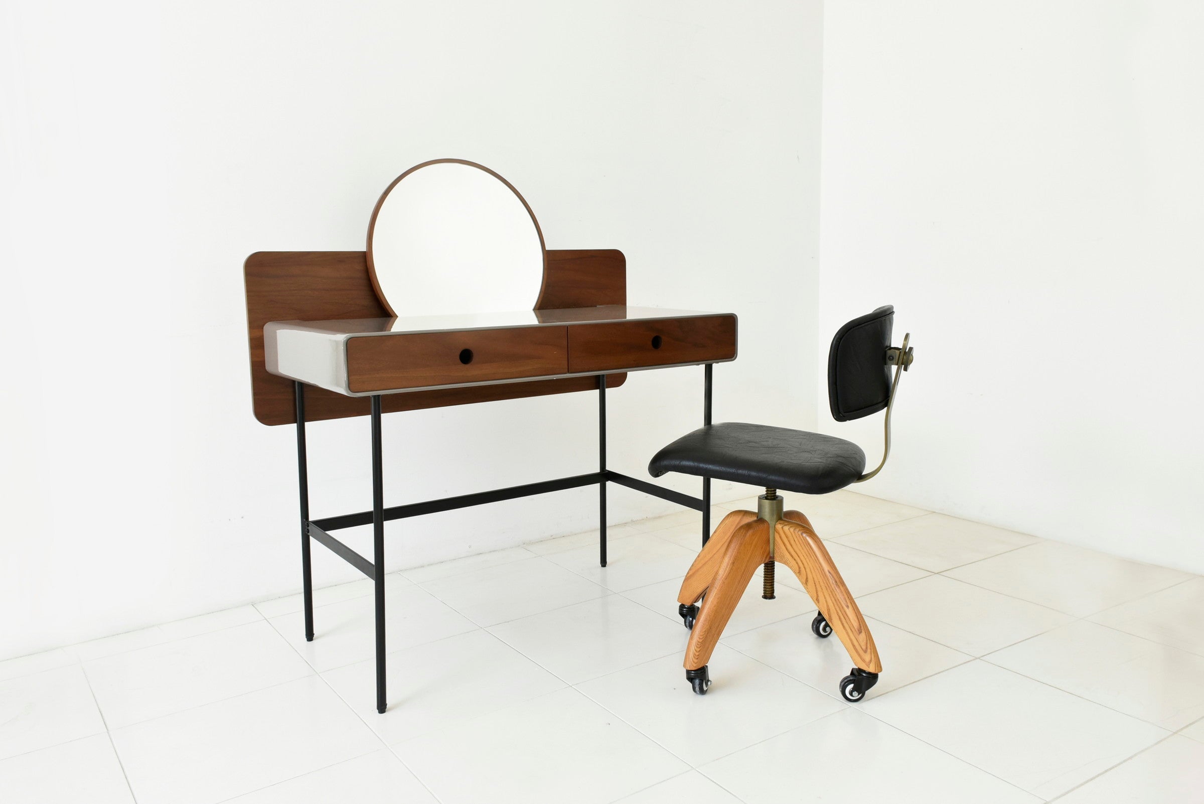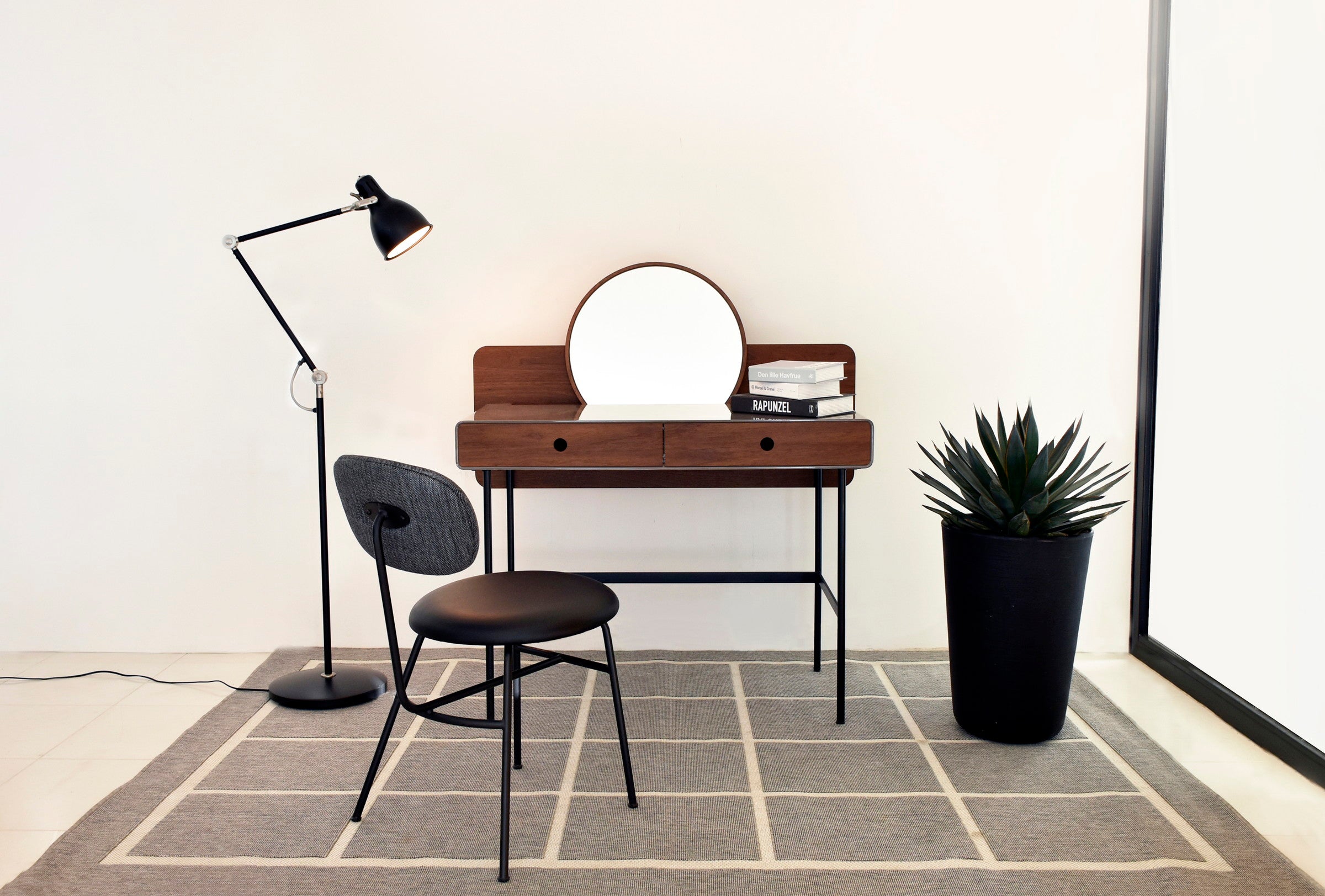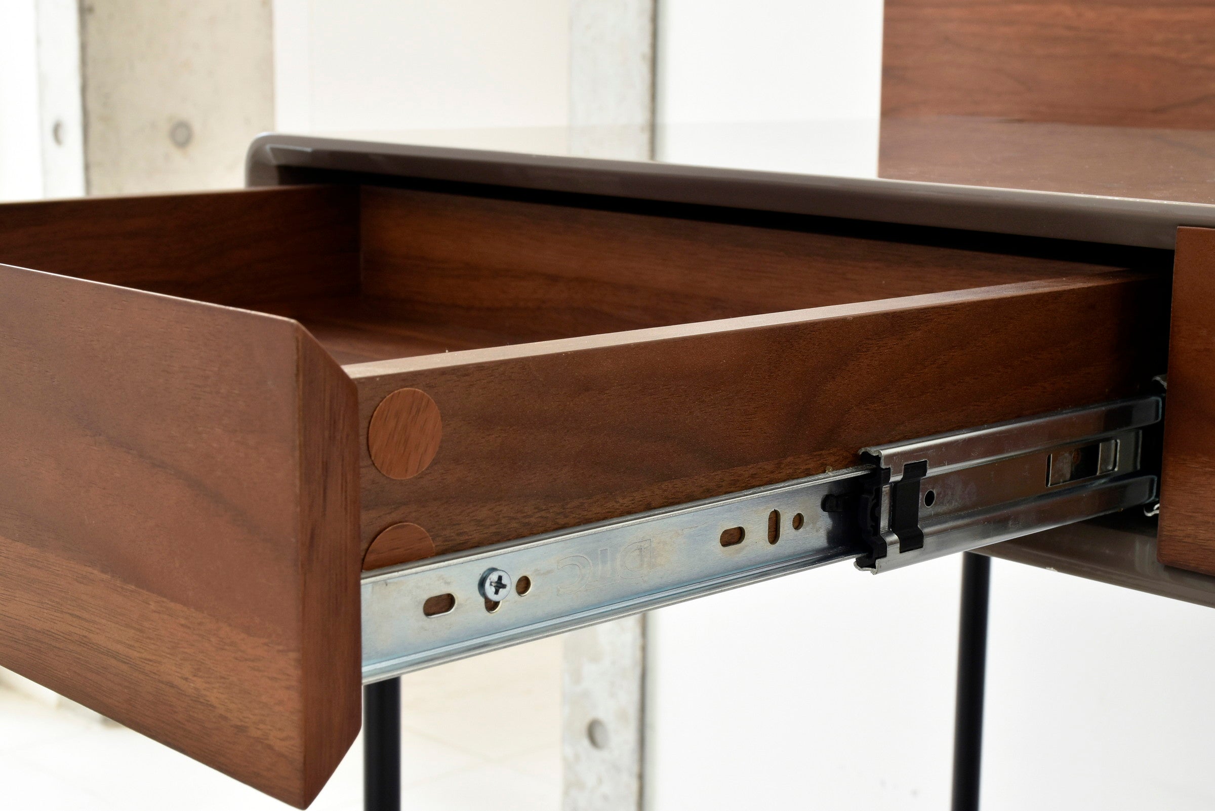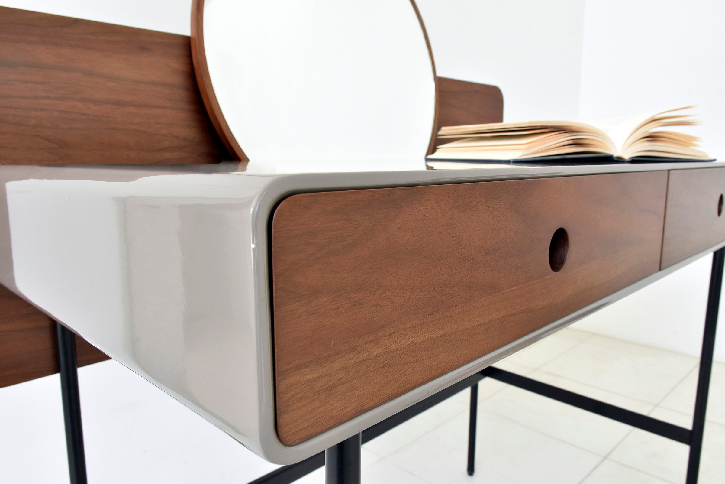 コンパクトで丸みあるエッジが可愛らしいデスクにミラーを足したドレッサーです。デザインと機能が調和した新しいドレッシングデスクです。デスクとドレッサー、1台2役のハイブリットデザインで、スリムな奥行なので限られたスペースにも置きやすいサイズ感です。背面も美しい木目調を施しているので、お部屋のどの位置に置いても美しい佇まいです。