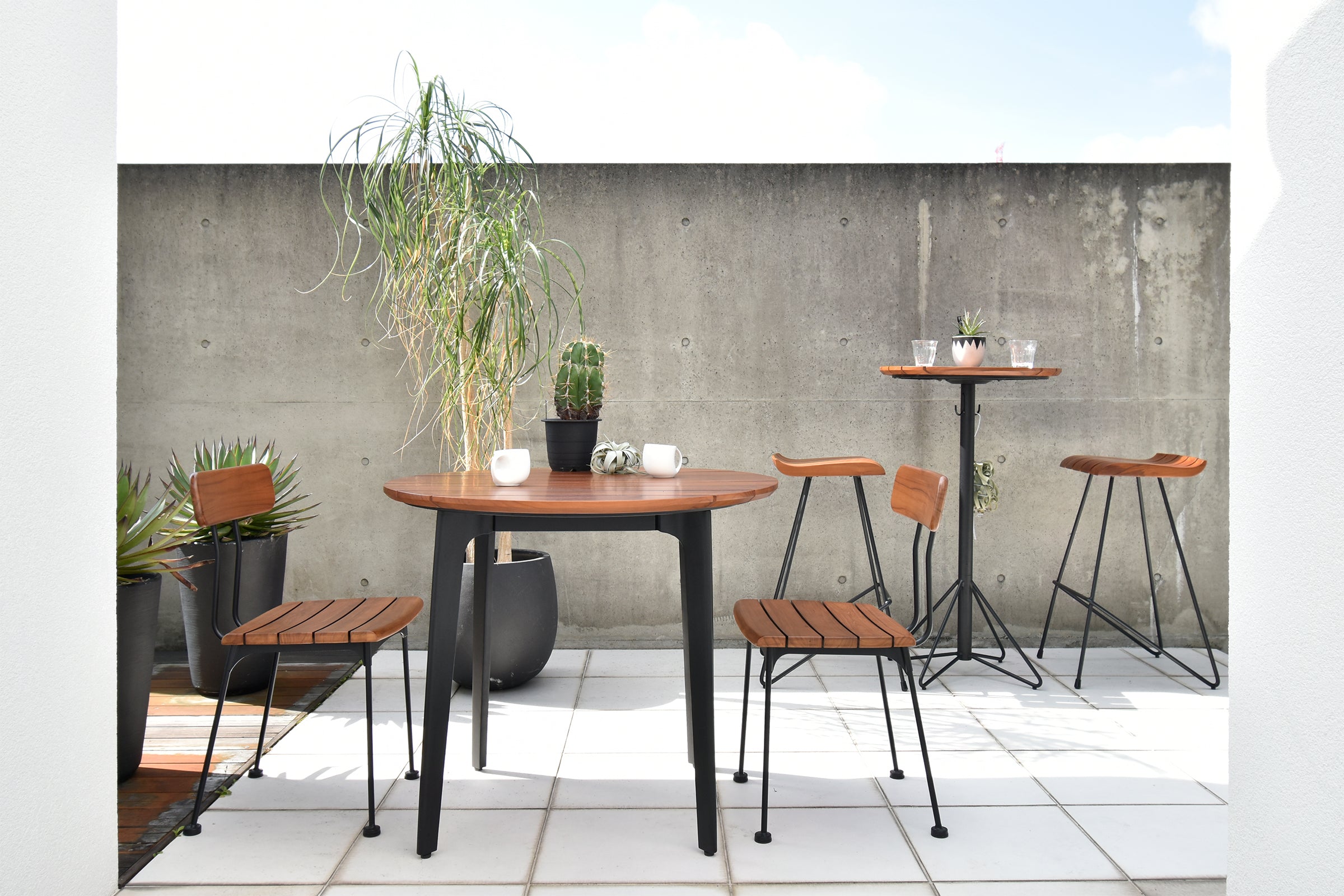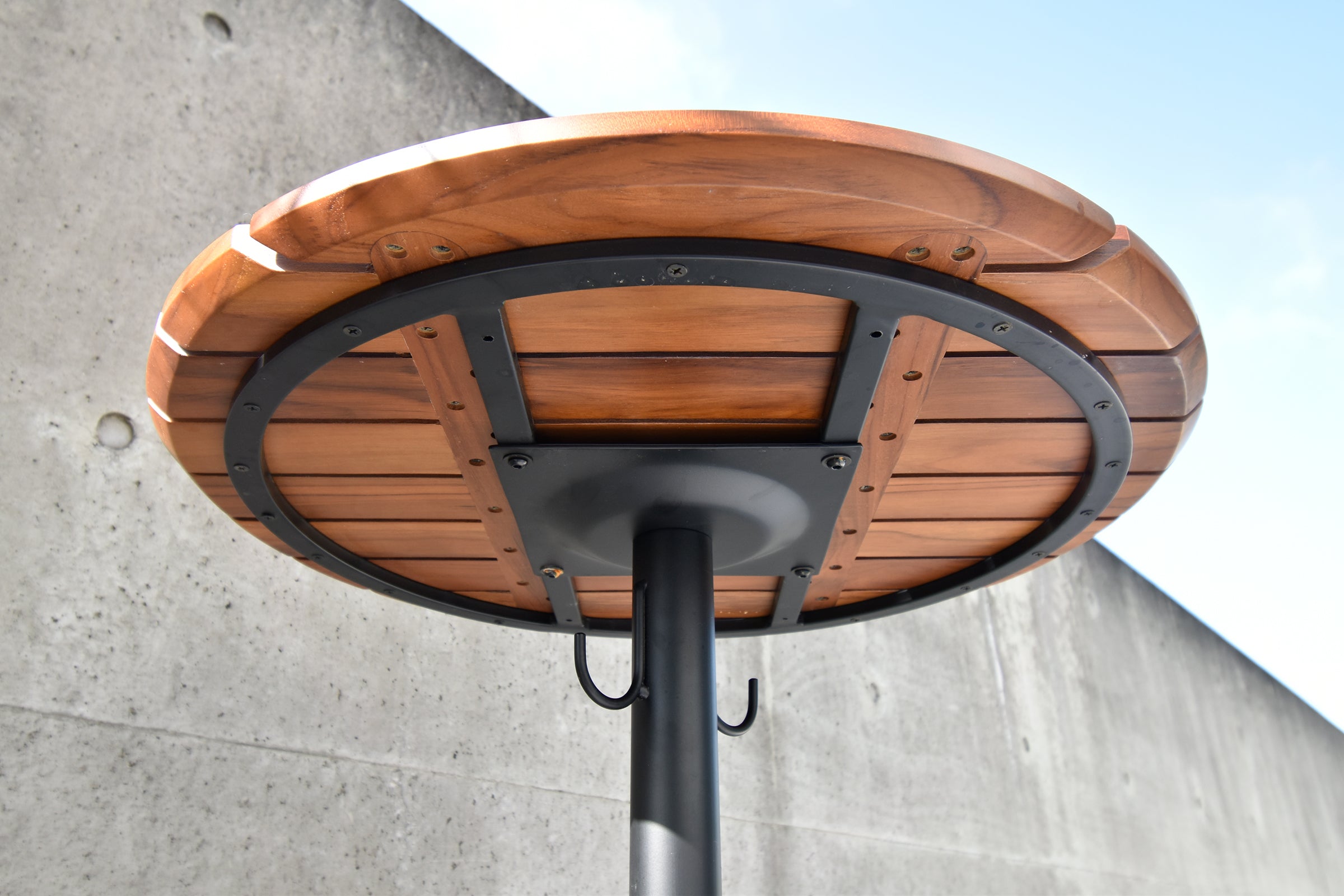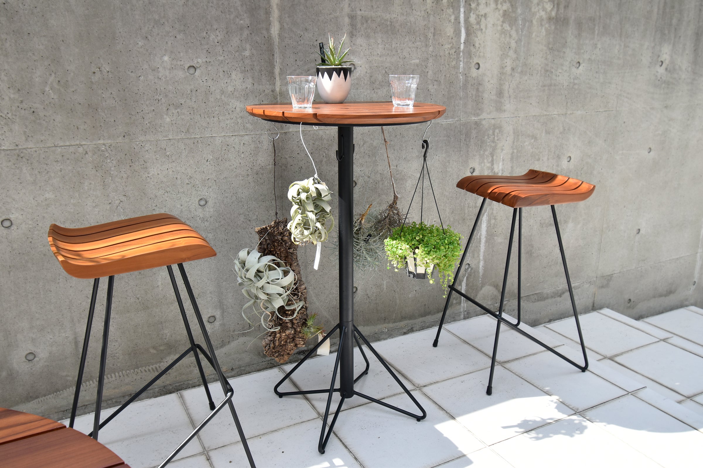 耐久性が非常に高く、屋外での使用にも適しているチーク材を使用したハイテーブルです。ブラジル産のチーク無垢材を贅沢に使用し、オイル塗装仕上げになっています。