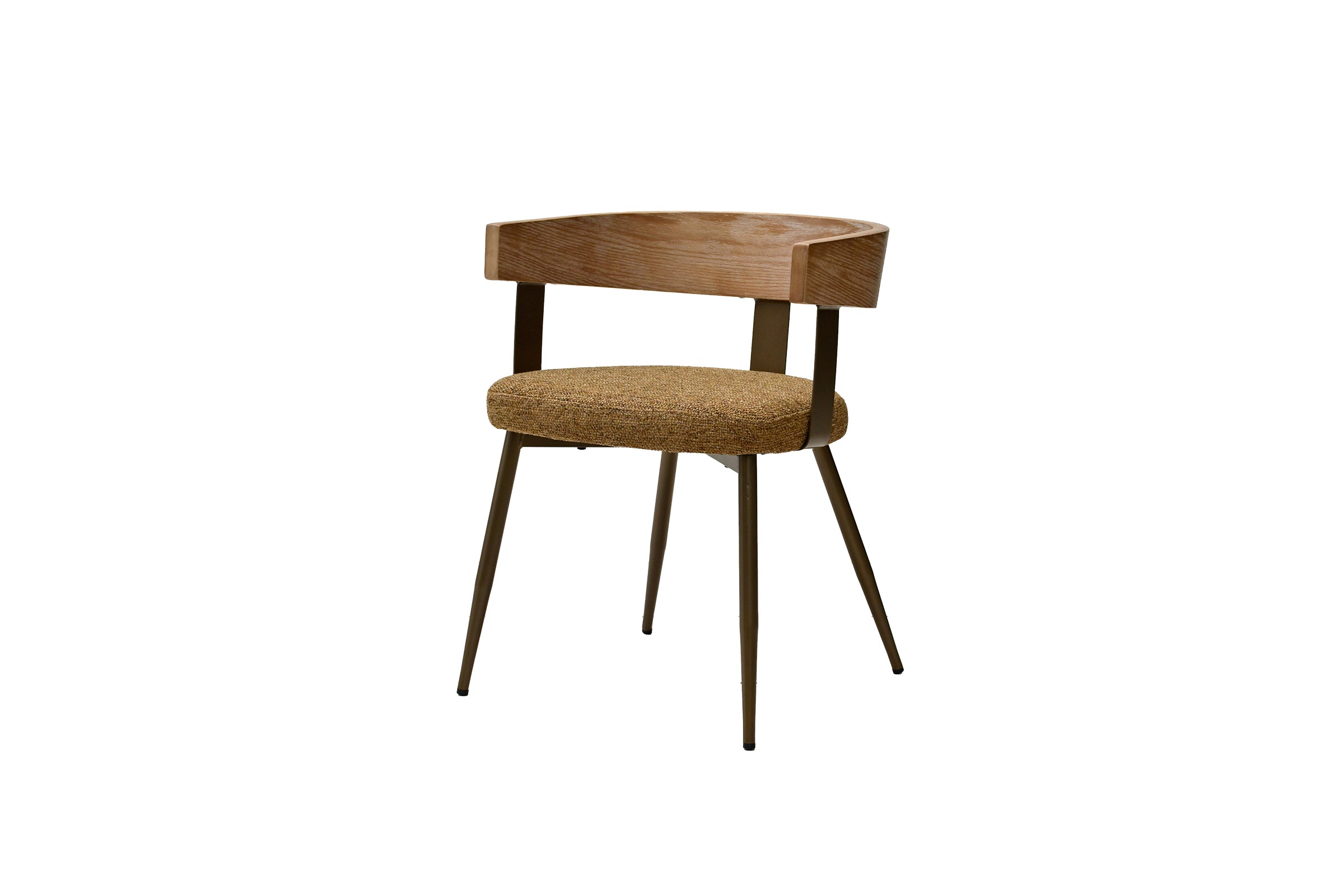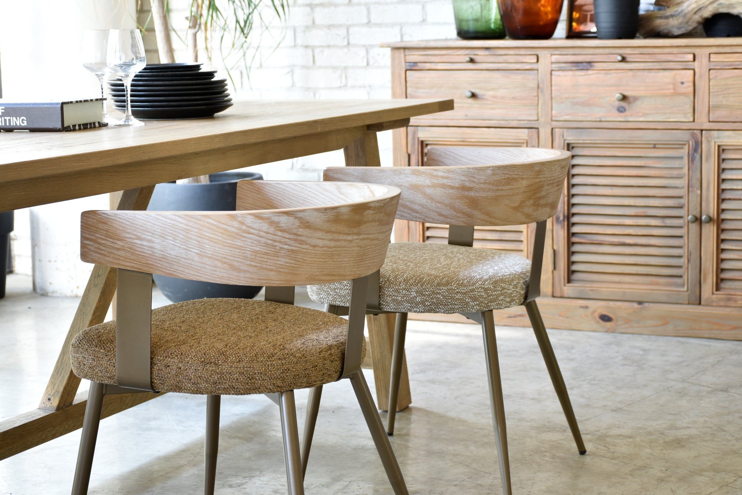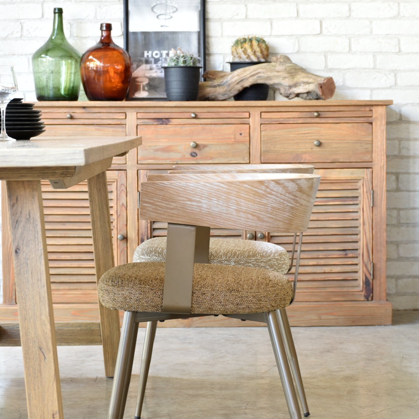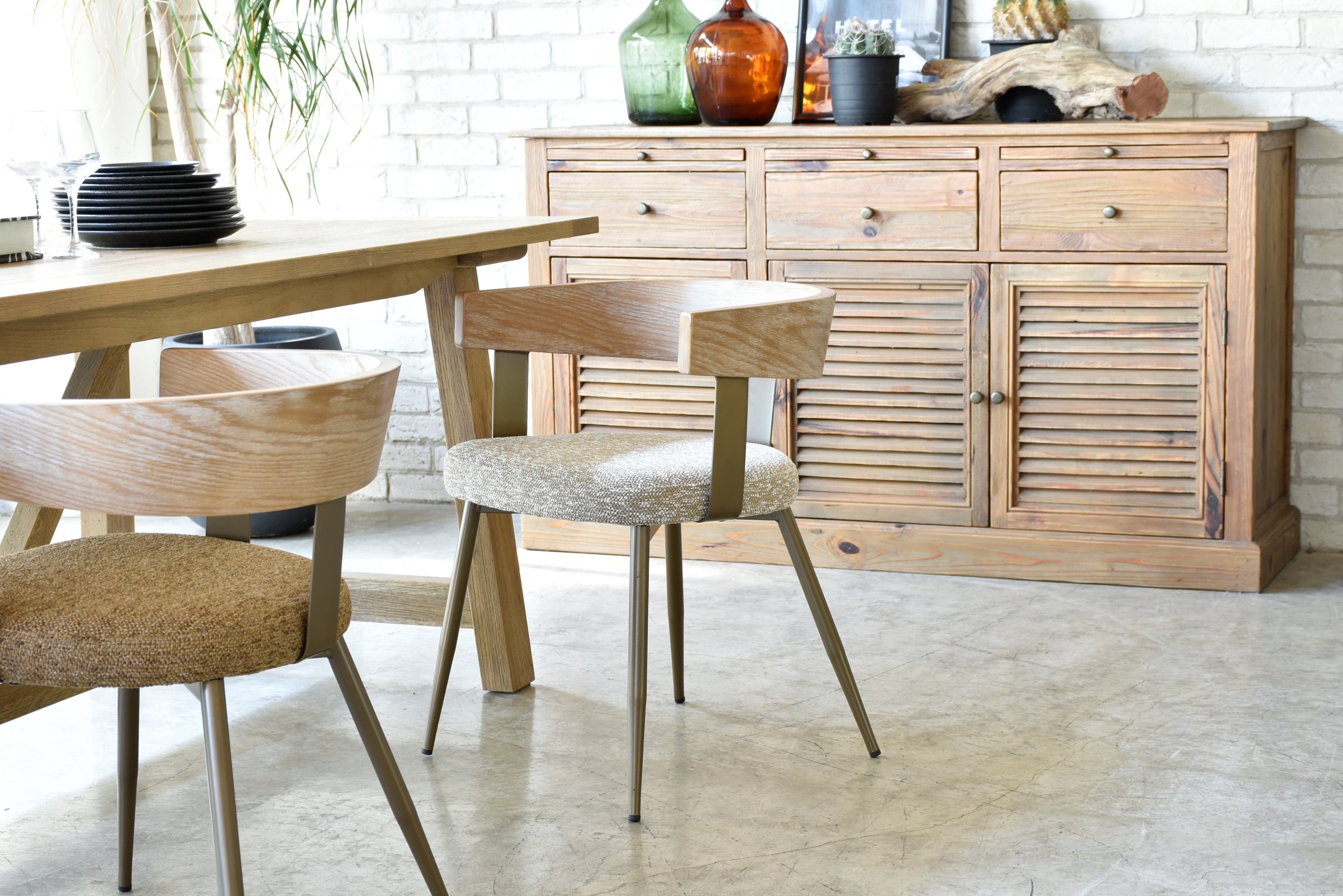 オーク材とスチール、ファブリック素材を組み合わせたダイニングチェアです。ブラウンとナチュラルの2色展開でお部屋の雰囲気に合わせて選ぶことができます。