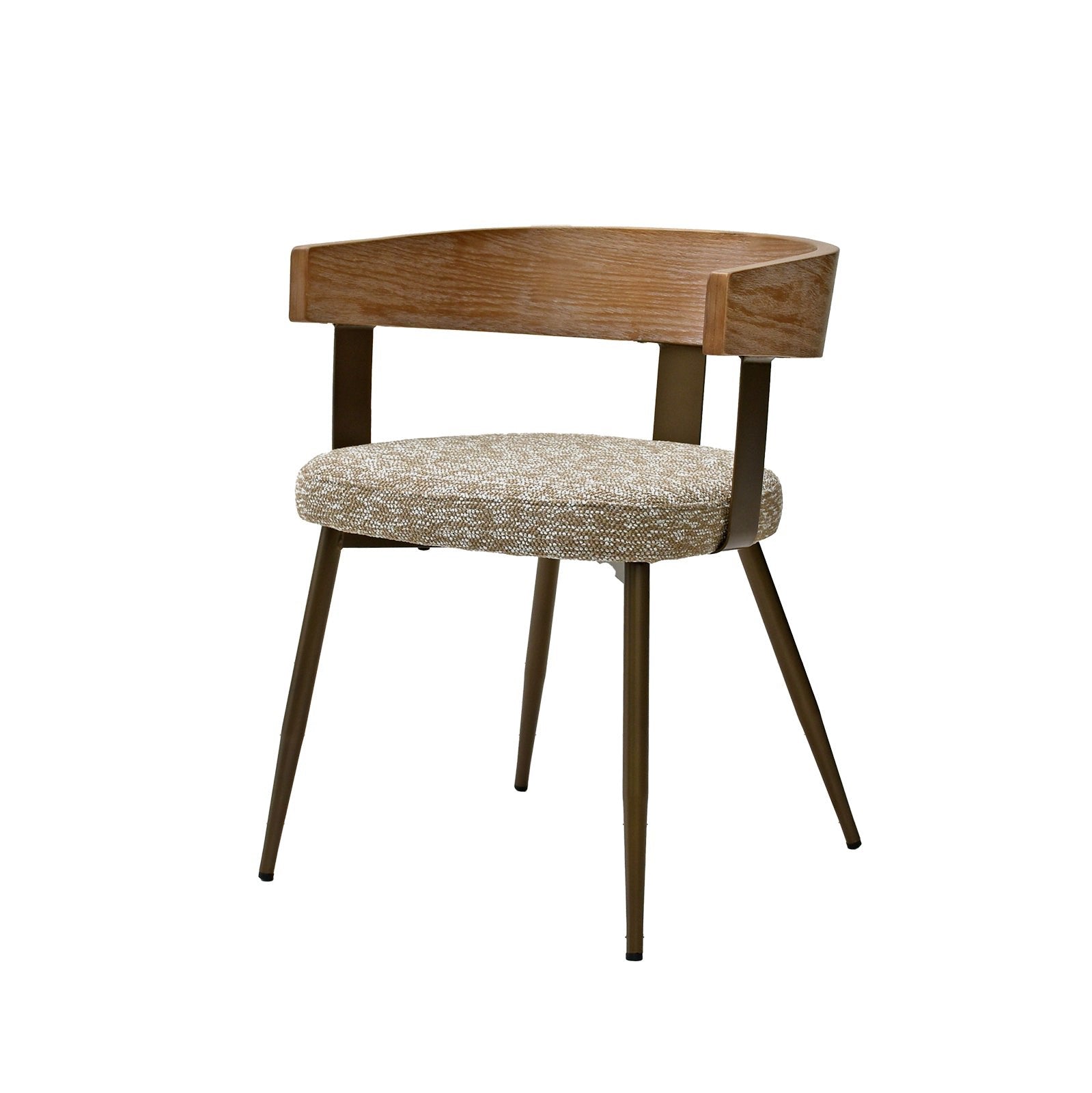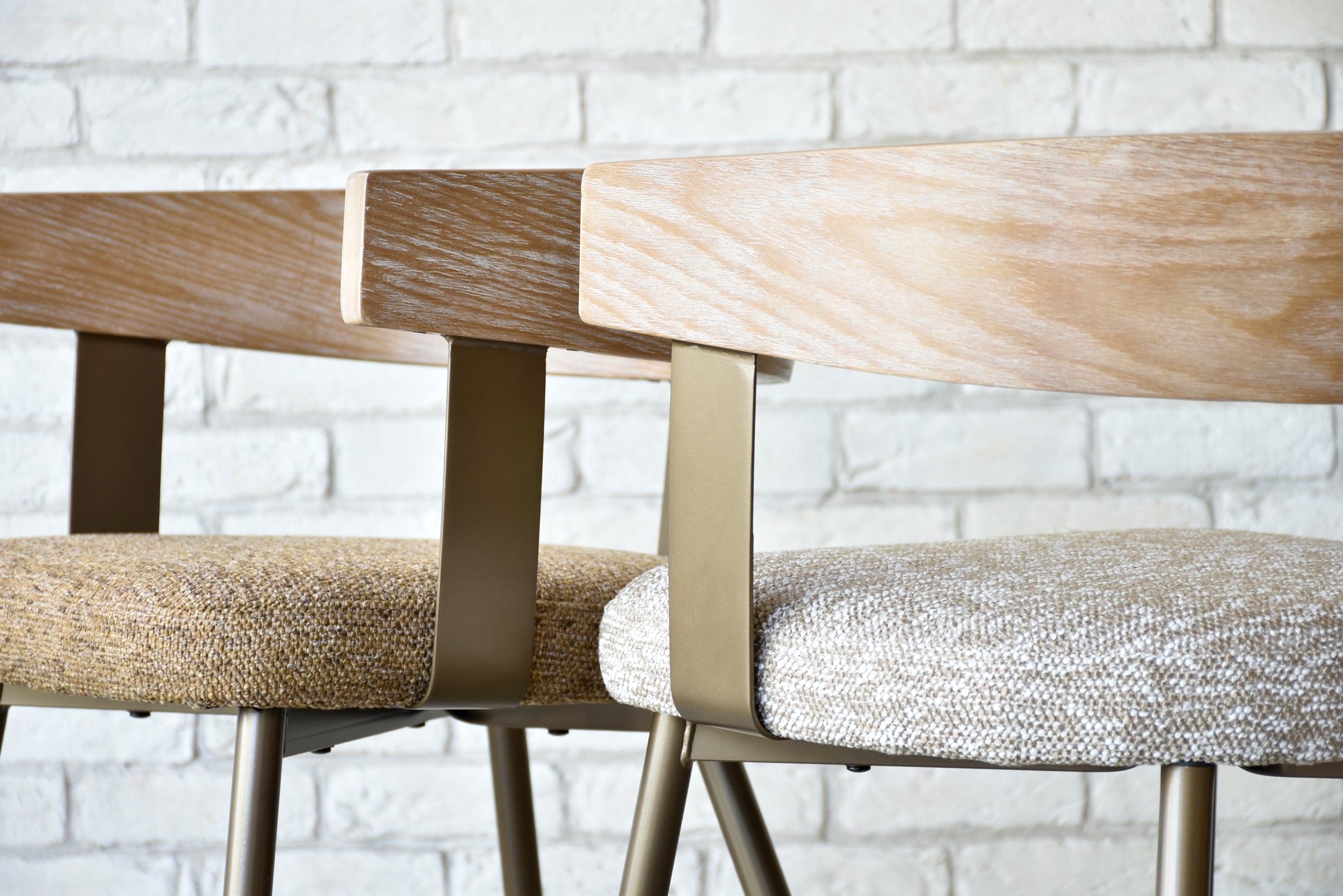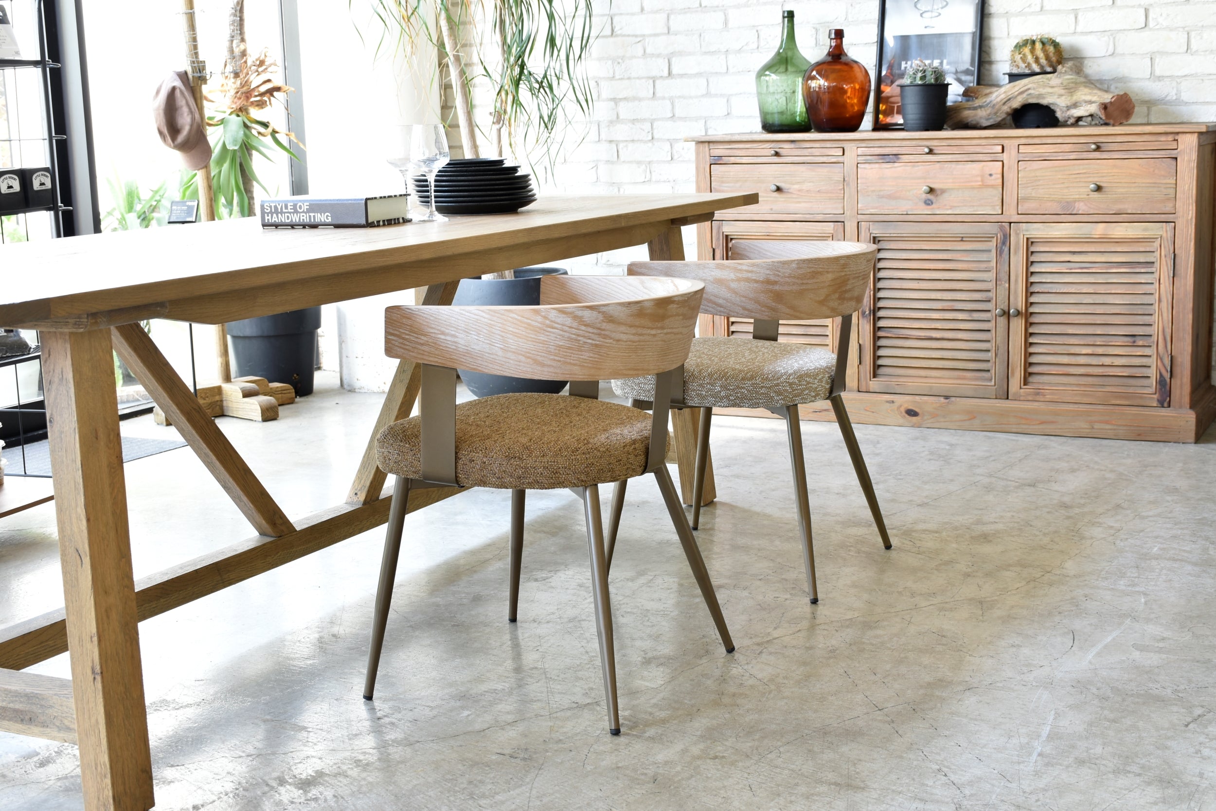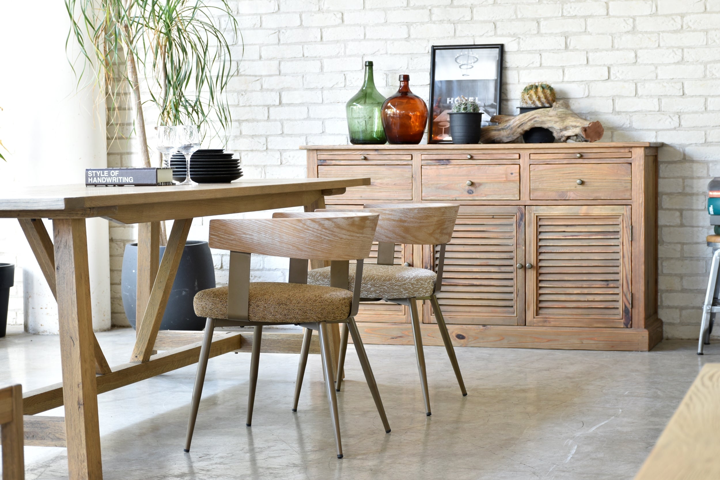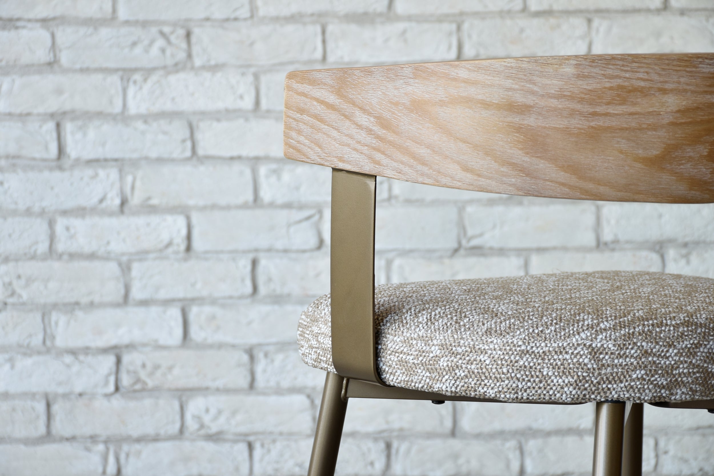 オーク材とスチール、ファブリック素材を組み合わせたダイニングチェアです。ブラウンとナチュラルの2色展開でお部屋の雰囲気に合わせて選ぶことができます。