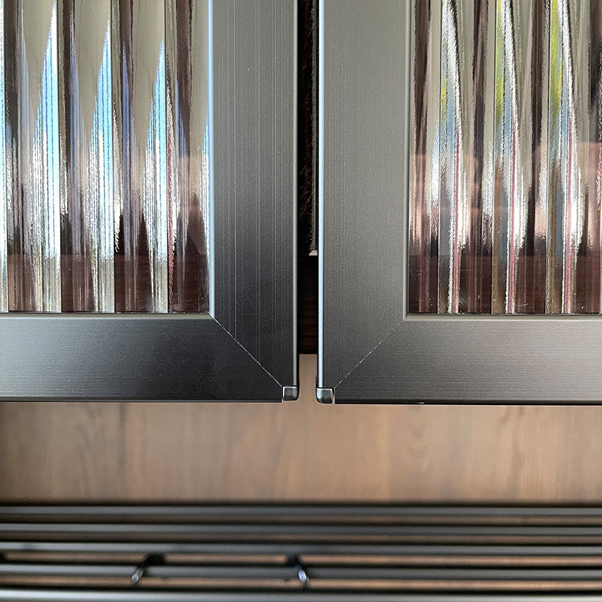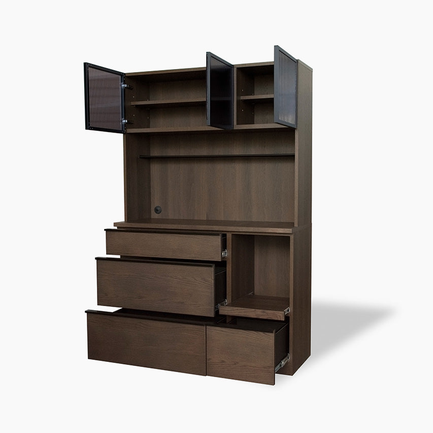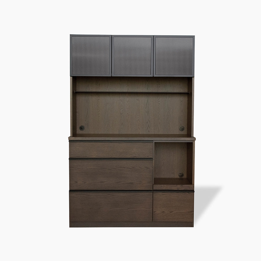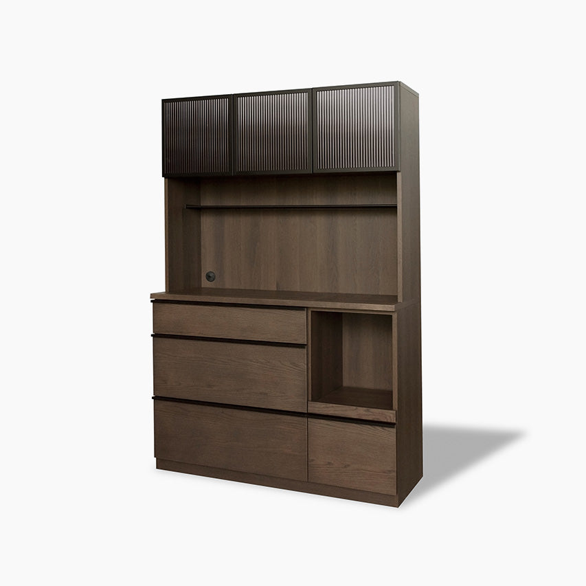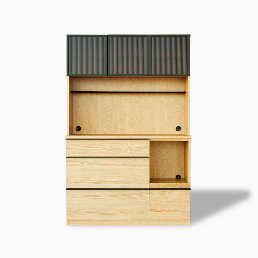 幅117cmのキッチンボードです。家電スペース、引き出し、扉収納をバランスよく備え、日々の調理動線を整える収納設計です。