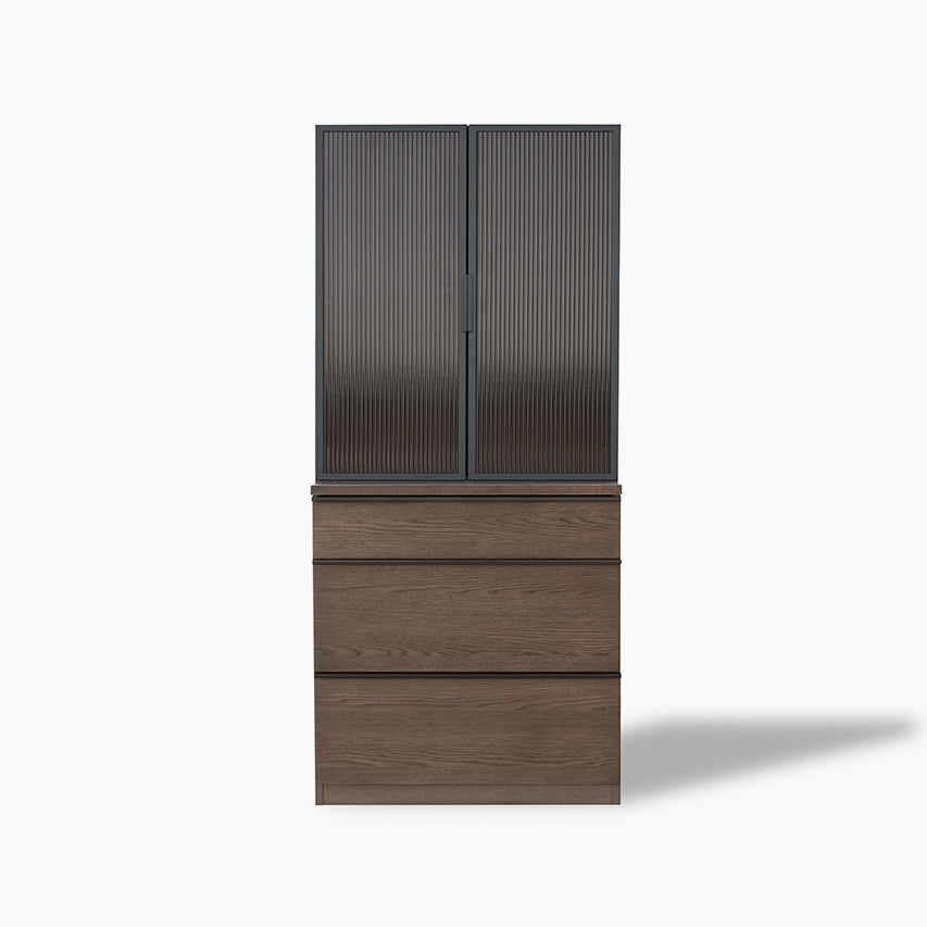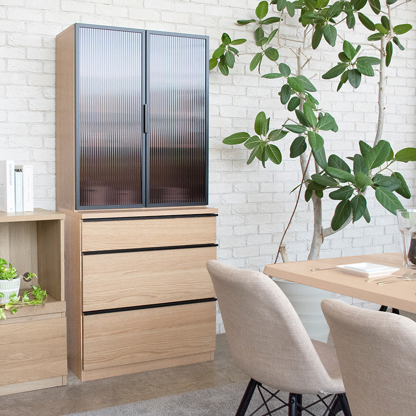 幅78cmのスリムなカップボードです。扉収納でスタイリッシュに多くのものを収納することができます。日々の調理動線を整える収納設計です。