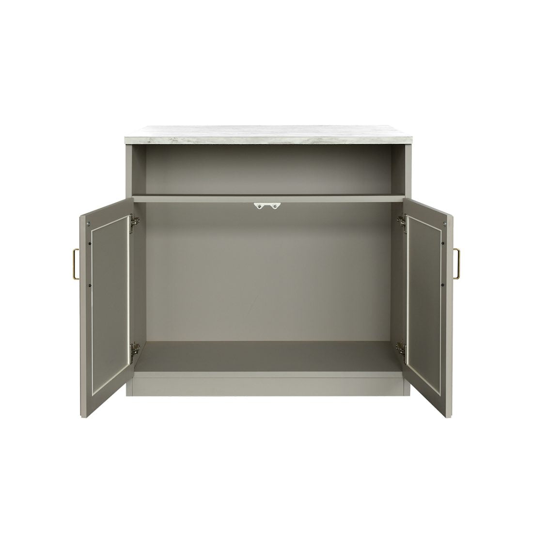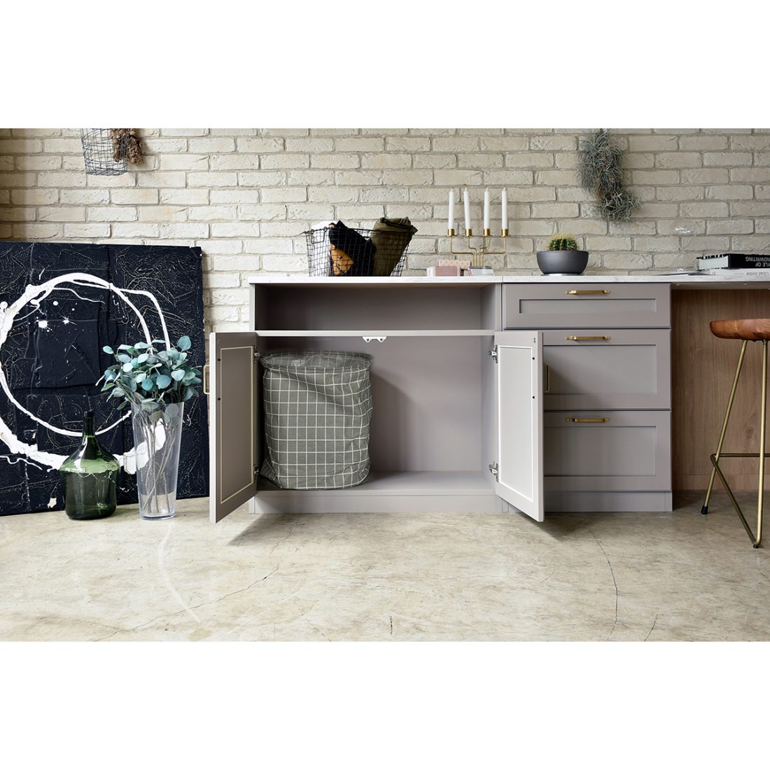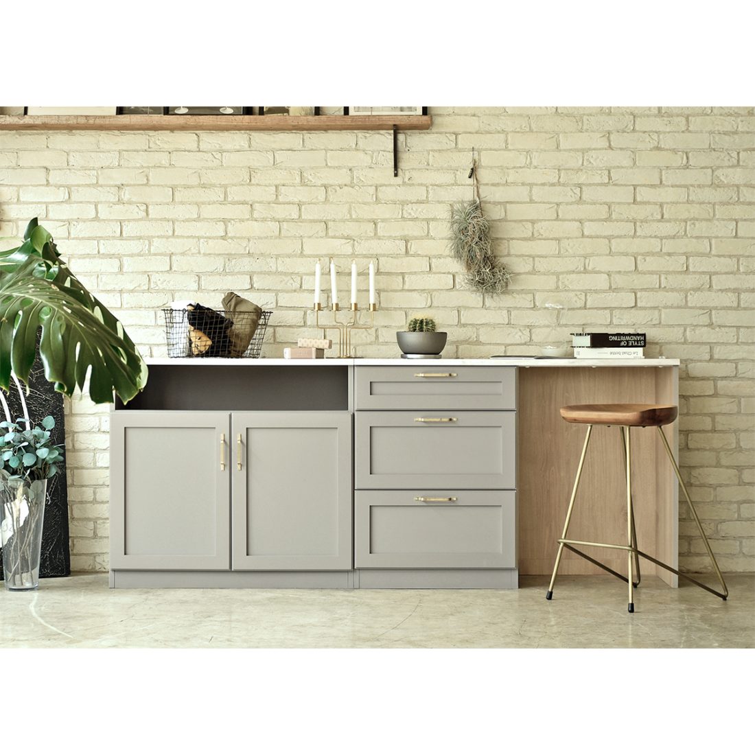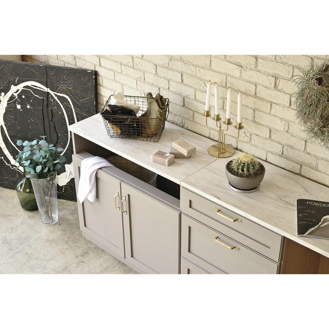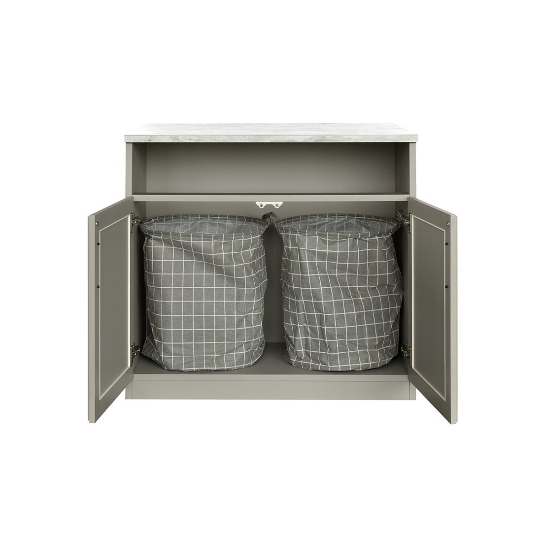 グレー色で清潔感のあるランドリーキャビネットです。洗剤やタオルをすっきり収められる扉収納と、カウンターとして使える天板を備えます。