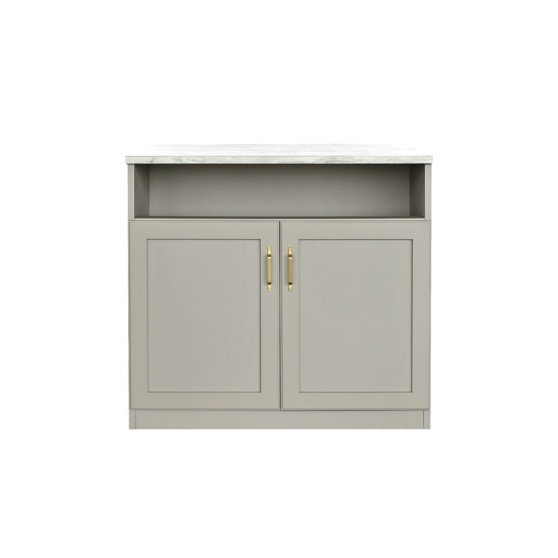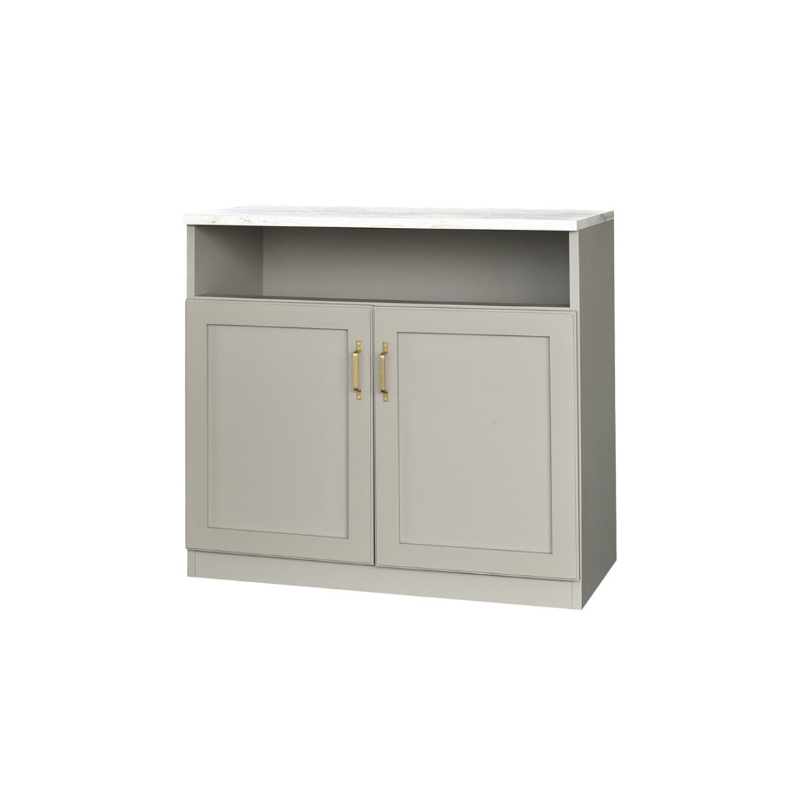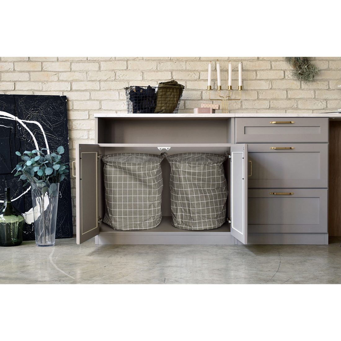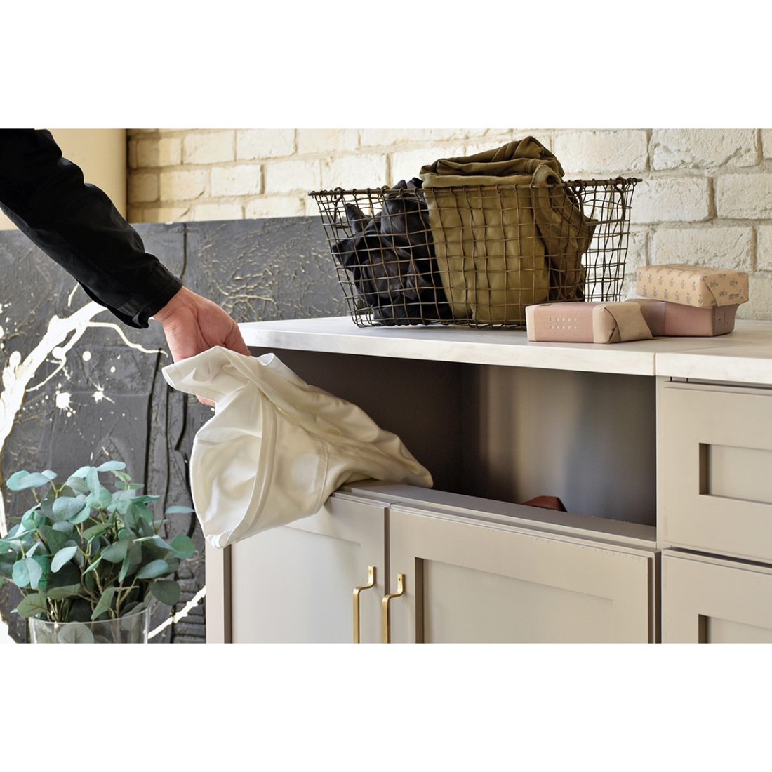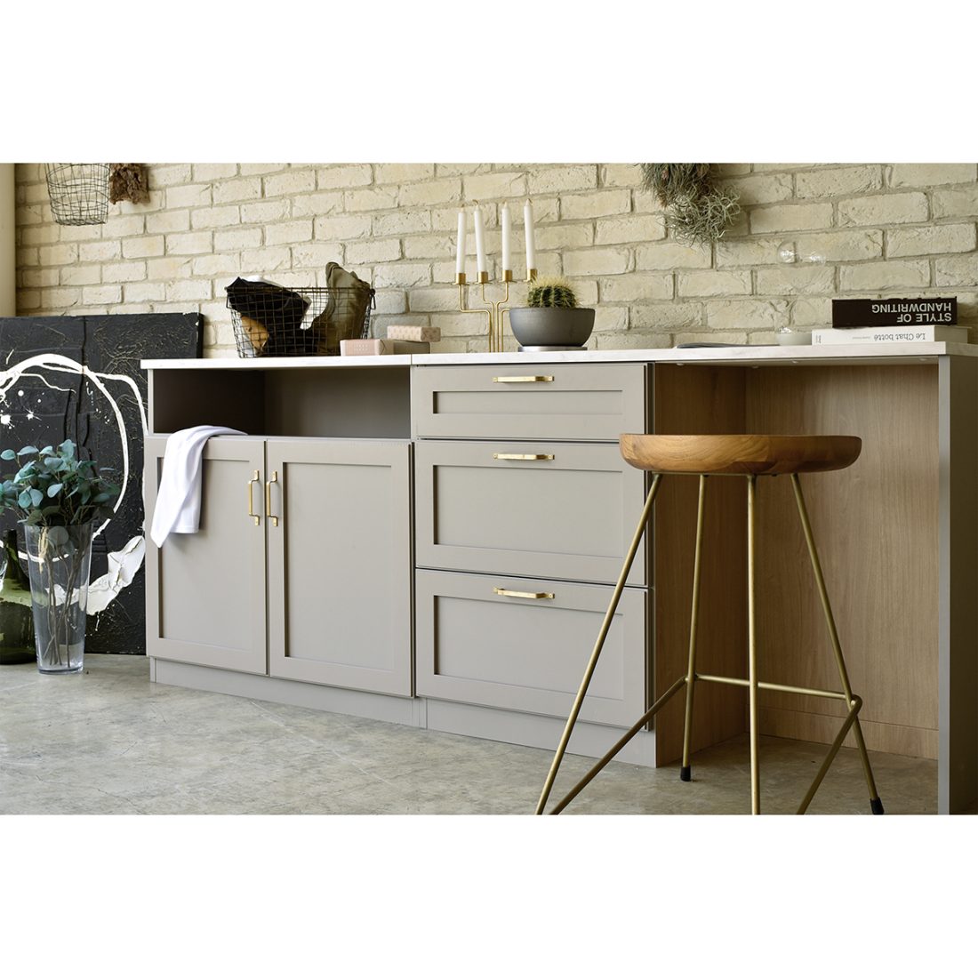 グレー色で清潔感のあるランドリーキャビネットです。洗剤やタオルをすっきり収められる扉収納と、カウンターとして使える天板を備えます。