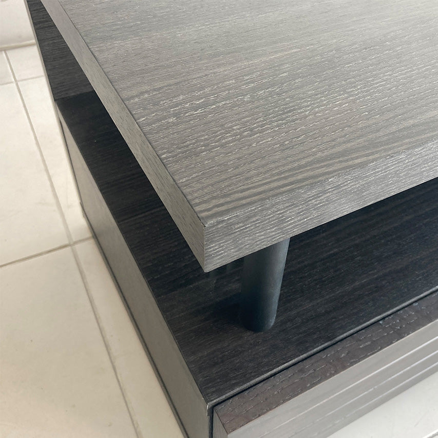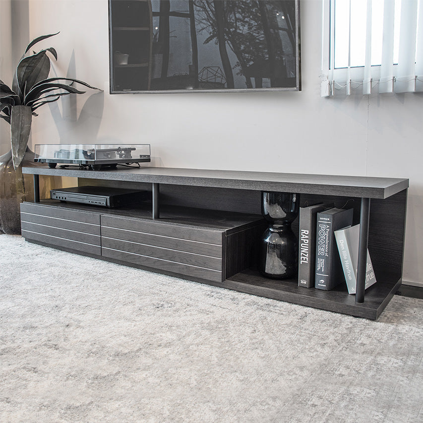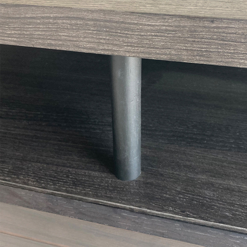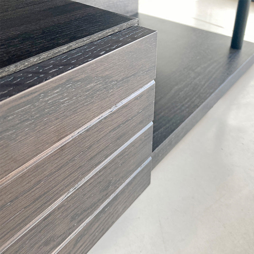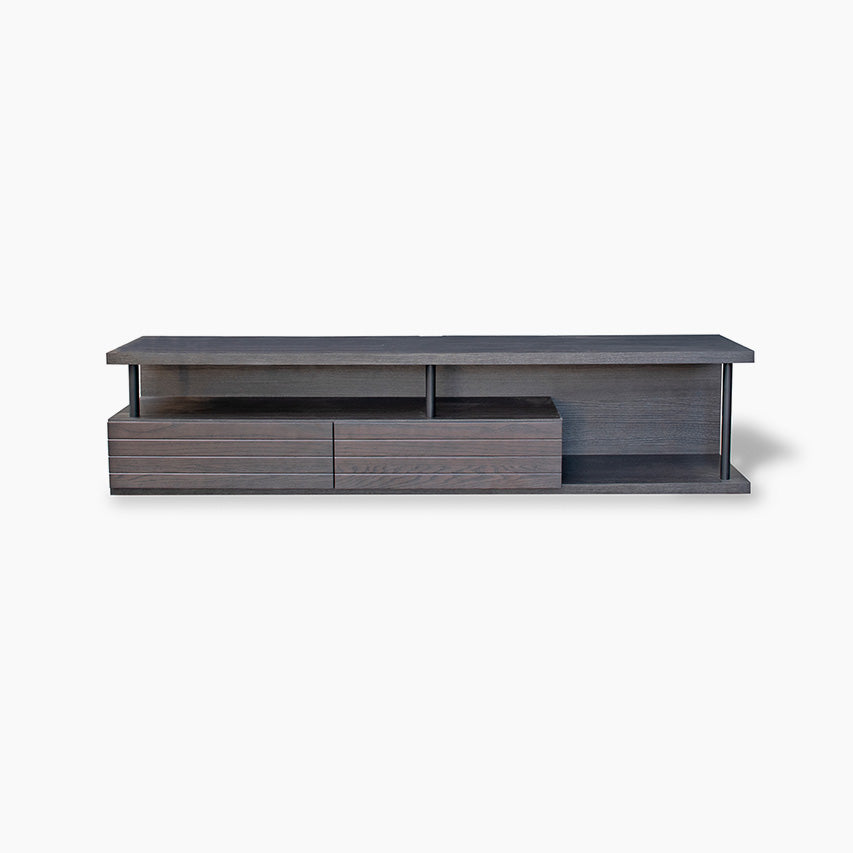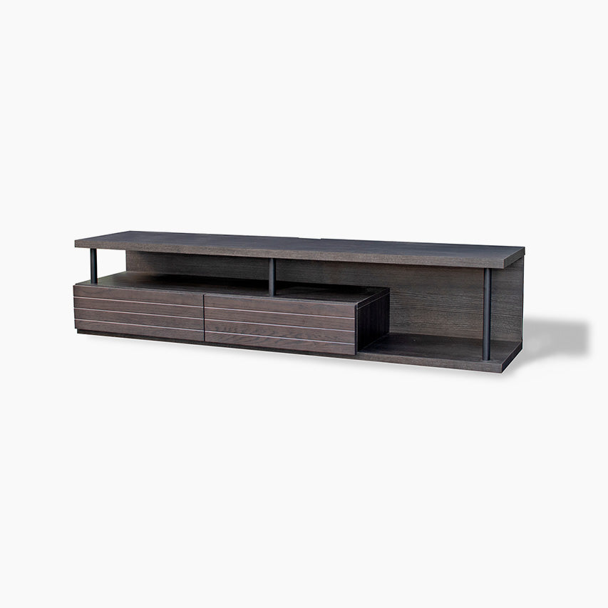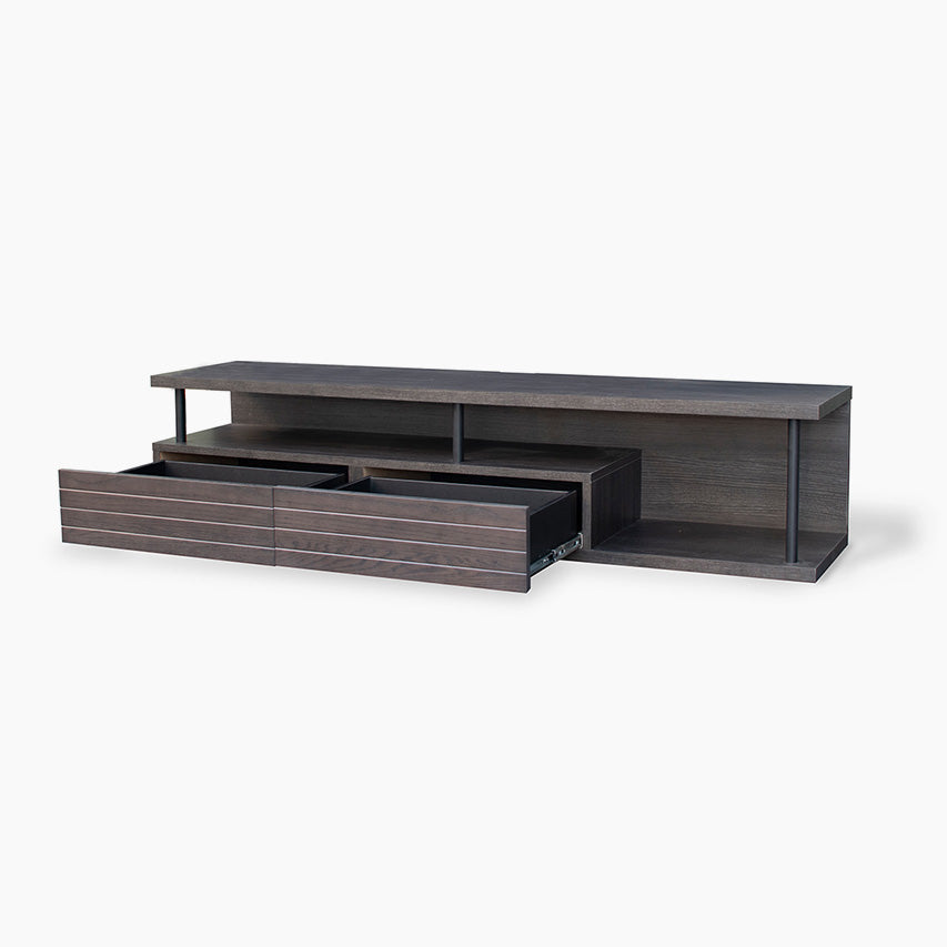オークの表情とモダンな直線基調を生かした170cm幅のテレビボードです。前板に無垢材、ボディに化粧繊維板、ポイントとなる円柱はラバーウッドを用い、素材のコントラストで上質にまとめています。
