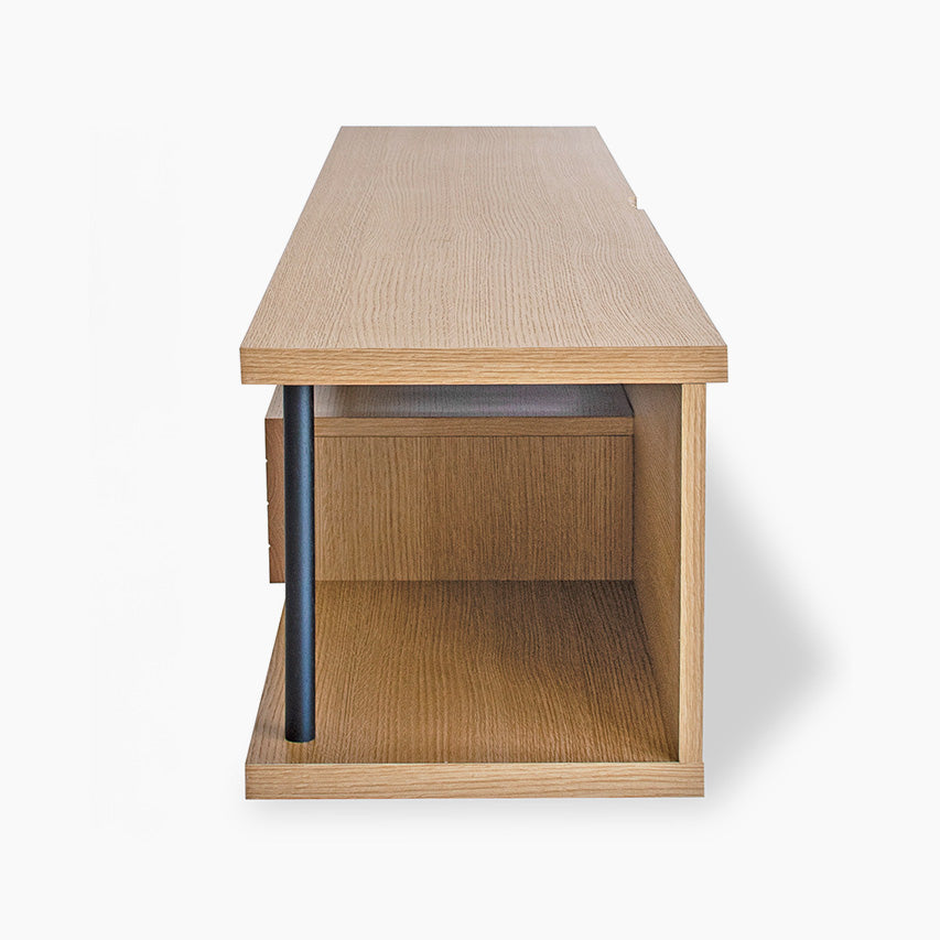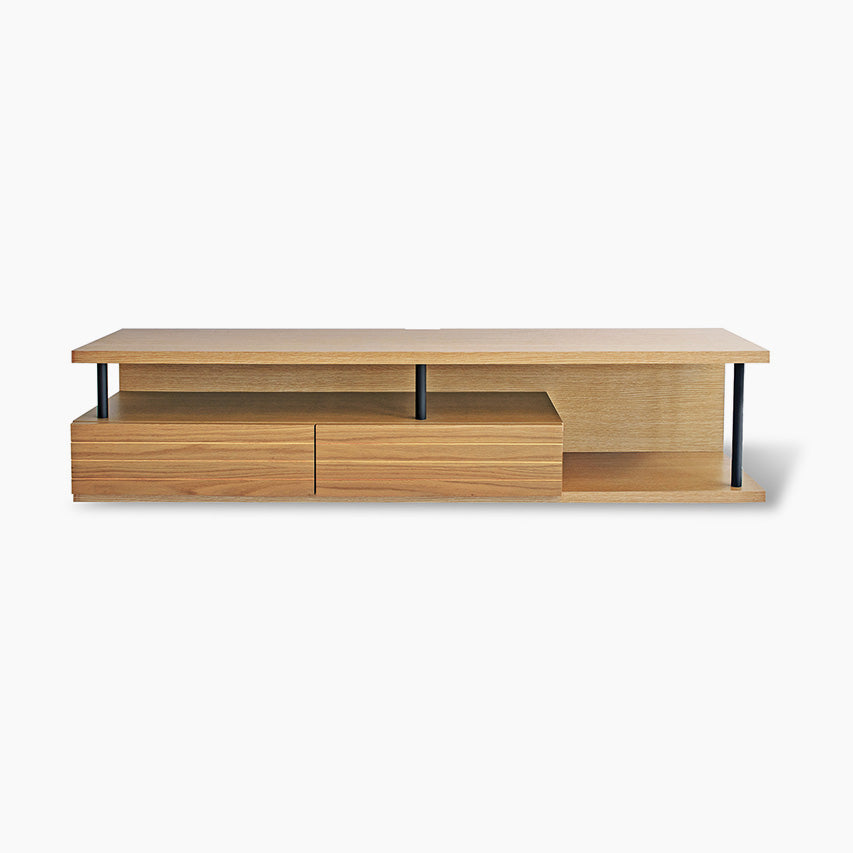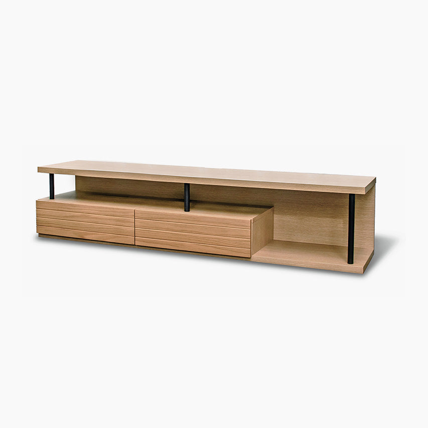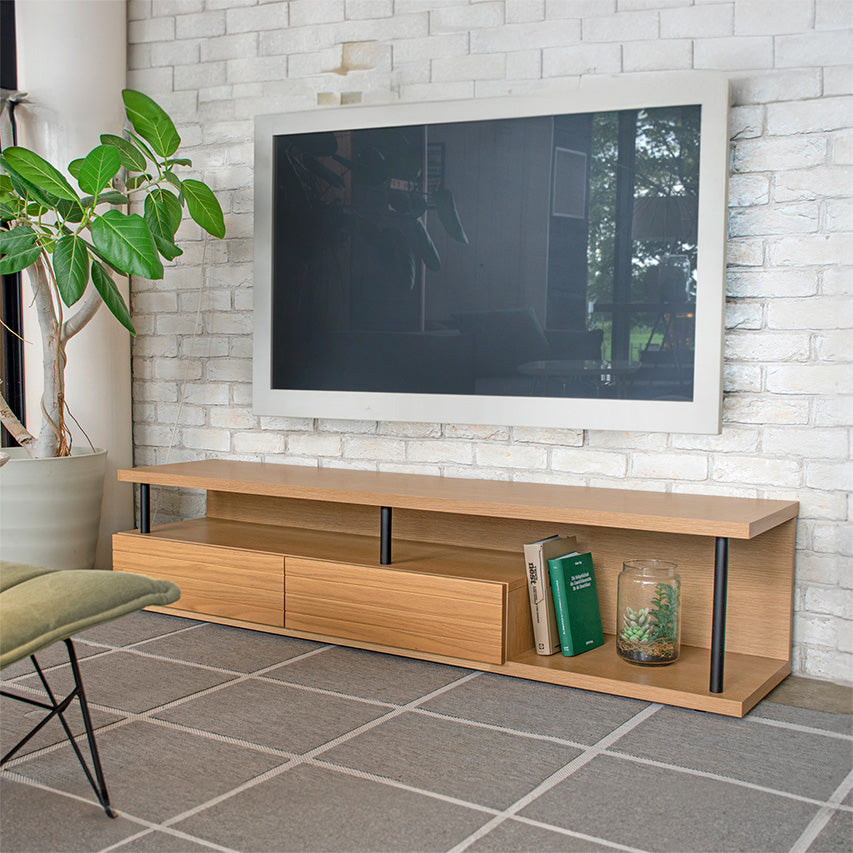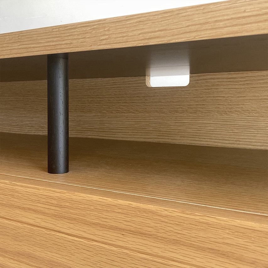 オーク無垢の前板に円柱形の支柱を大胆に配した、上質感とリズムのある意匠が特徴のローボードです。壁掛けテレビとの組み合わせも想定した設計で、幅170cmの余裕ある天板と収納部がリビングをすっきり整えます。