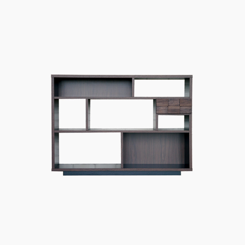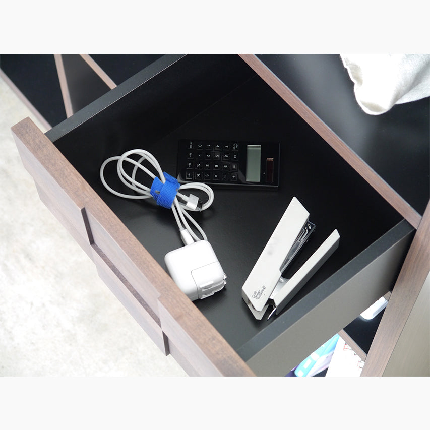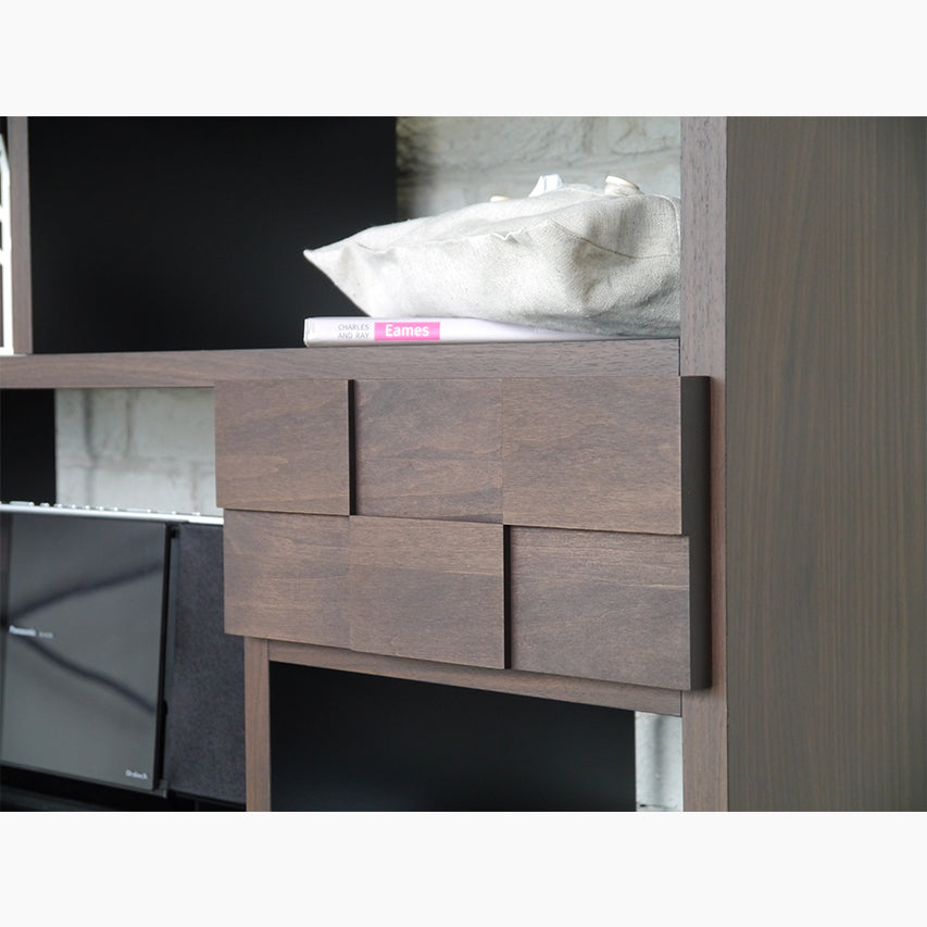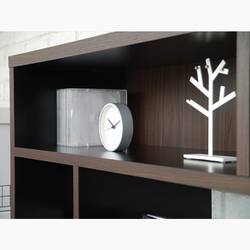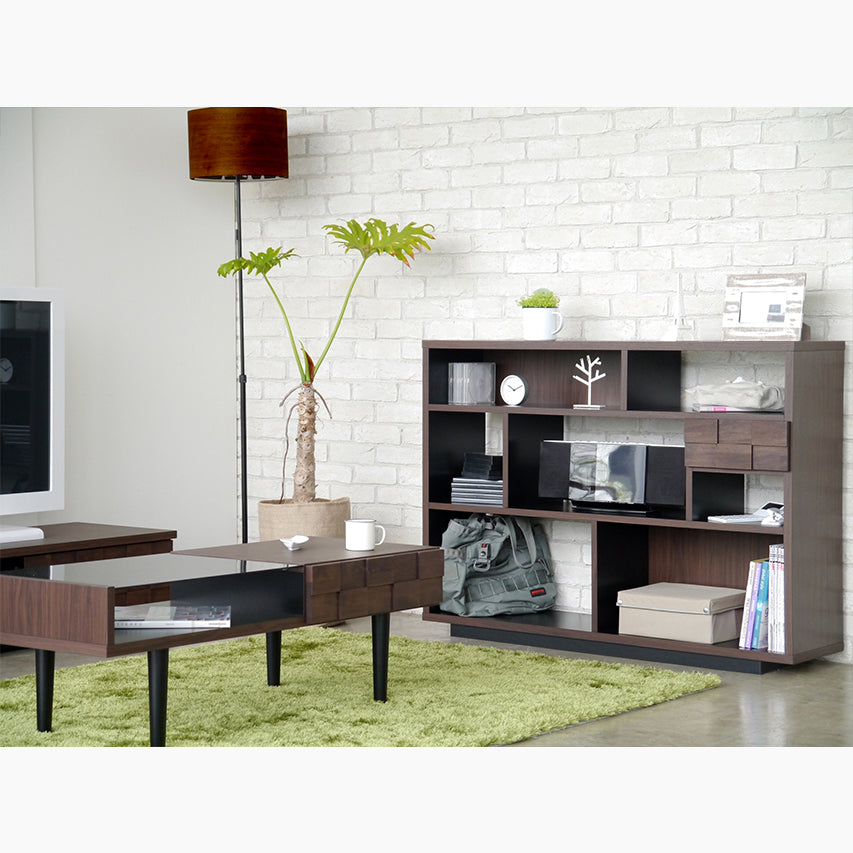 ランダム仕切りと小引き出し、下段A4縦収納が可能なシェルフです。背面オープンで軽やかな印象を与えます。