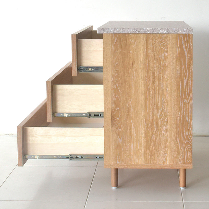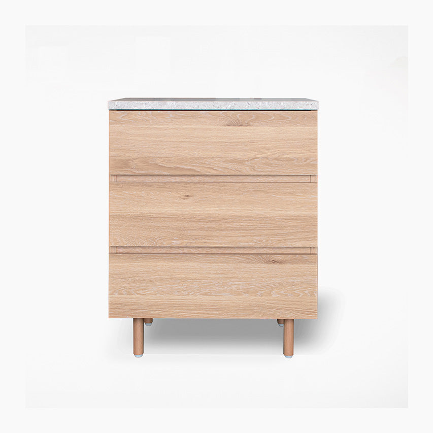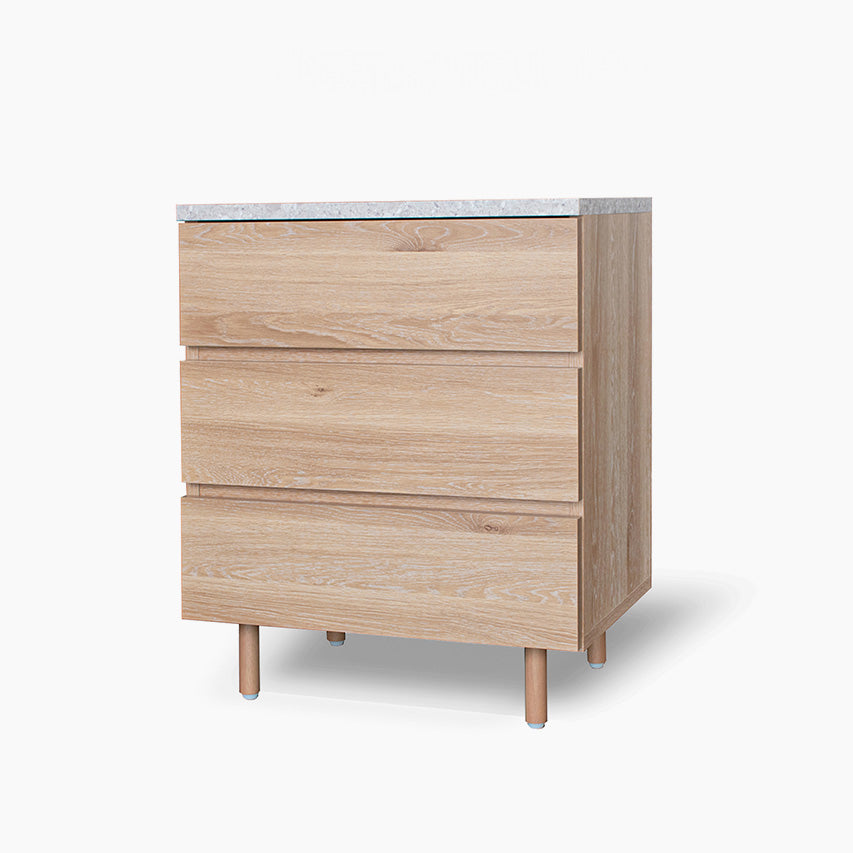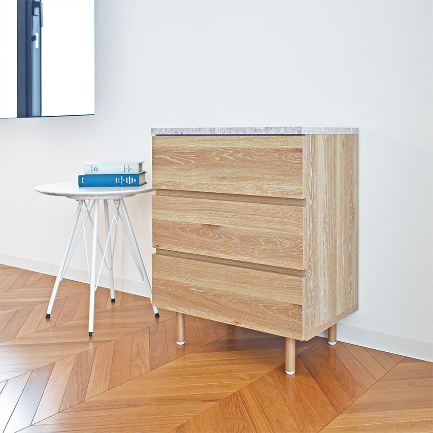 幅60cmの省スペースな3段チェストです。単体使いはもちろん、同シリーズと並べてレイアウトしやすいサイズ感です。