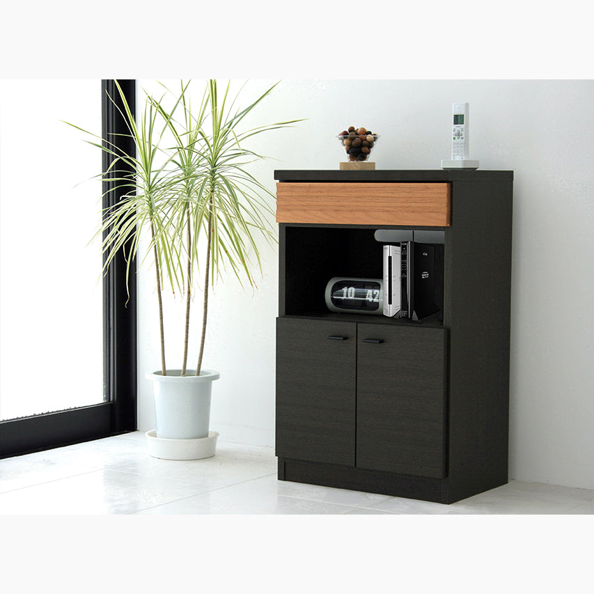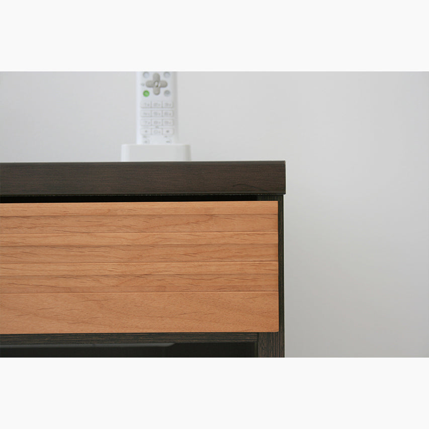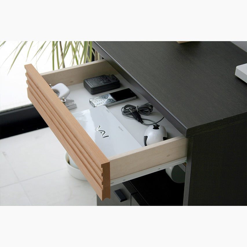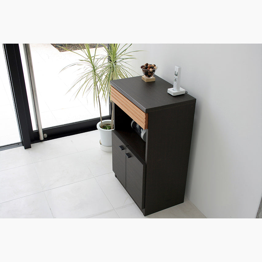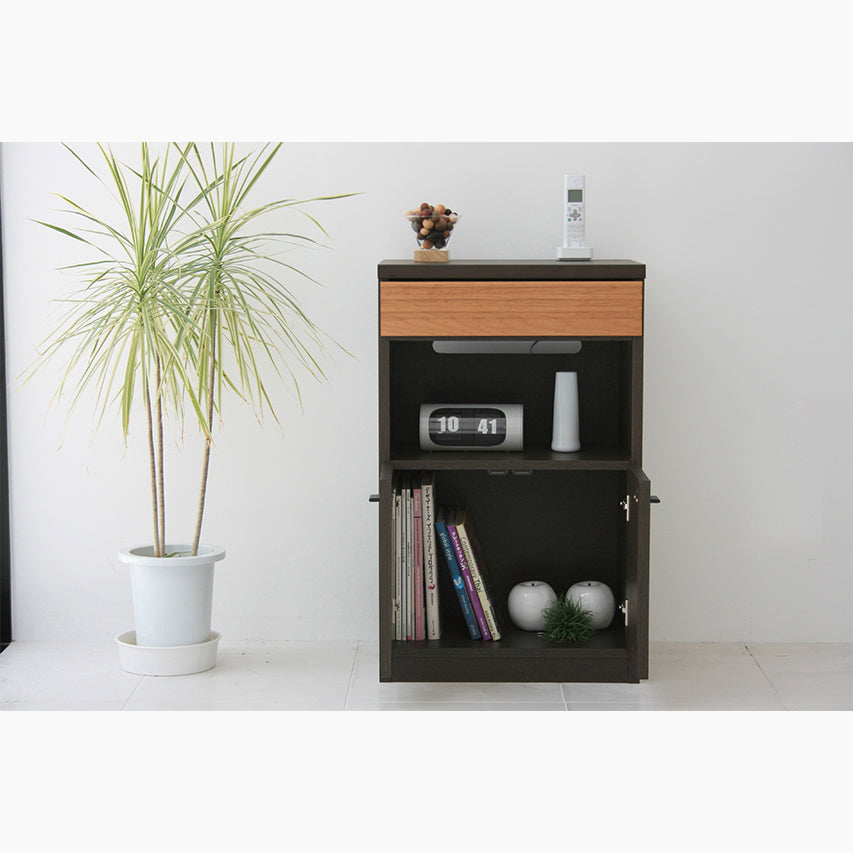 幅50cmのコンパクトな電話台。小引き出しと扉収納を備え、玄関やリビングのちょっとした置き場に程よいサイズです。
