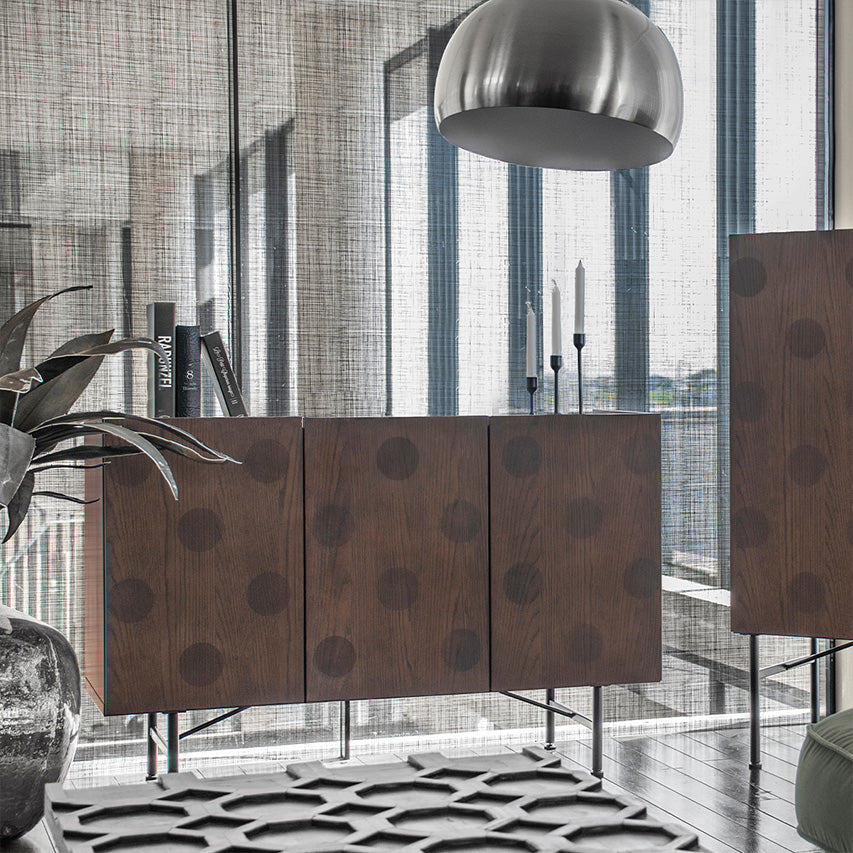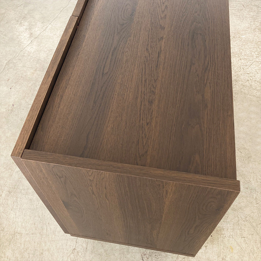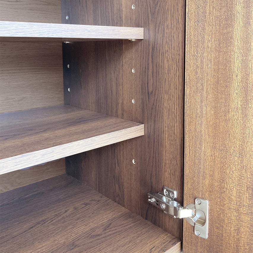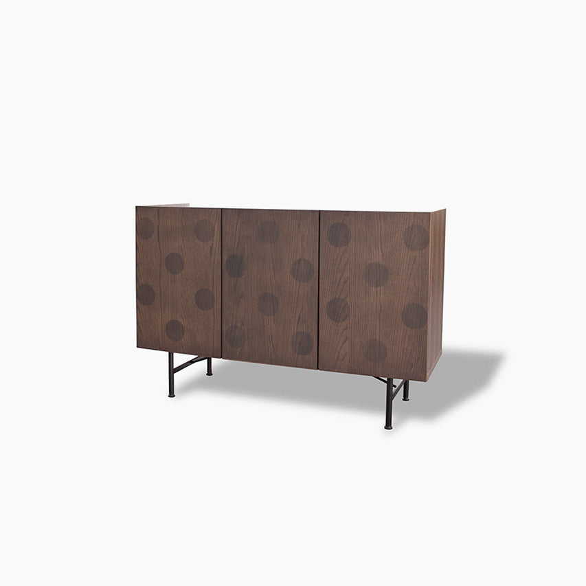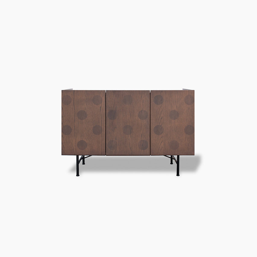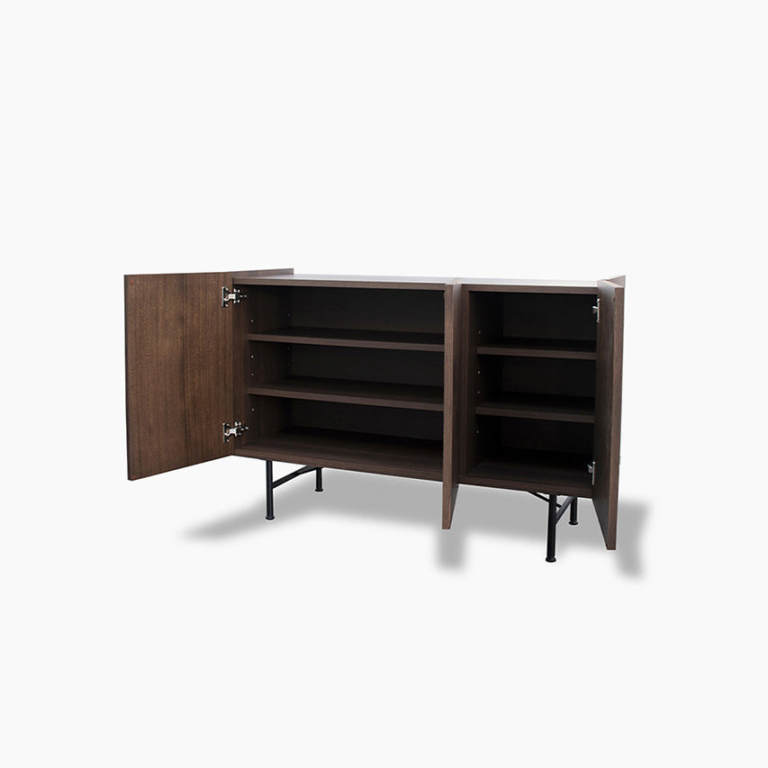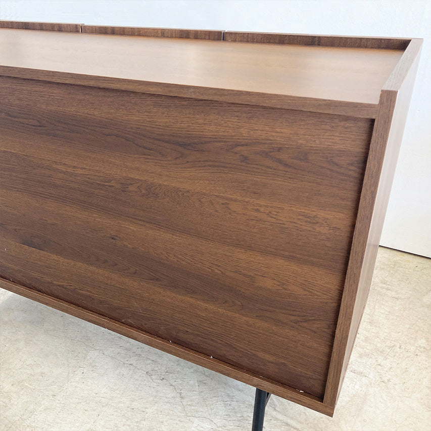 スチール脚とオーク突板の前板で軽やかに見せるサイドボードです。直線的なデザインがモダンな空間に映え、見せる収納と隠す収納をバランスよく備えます。