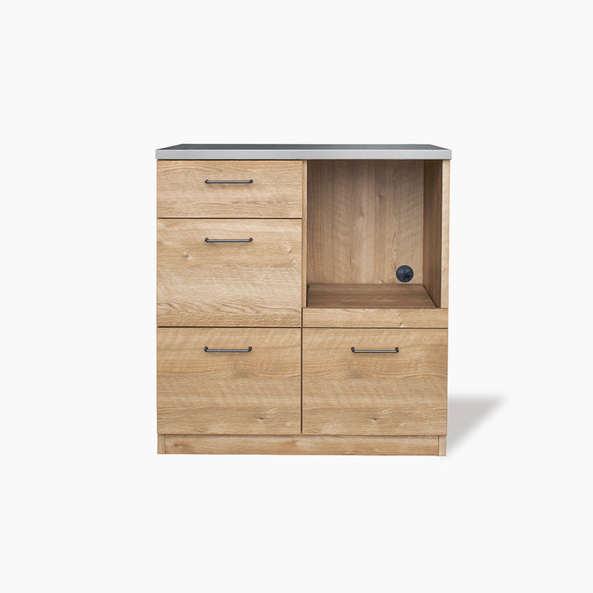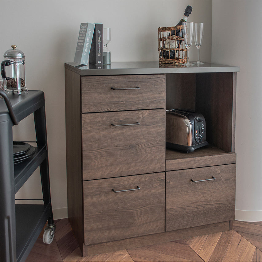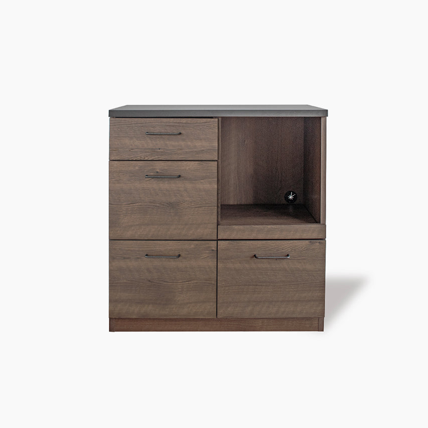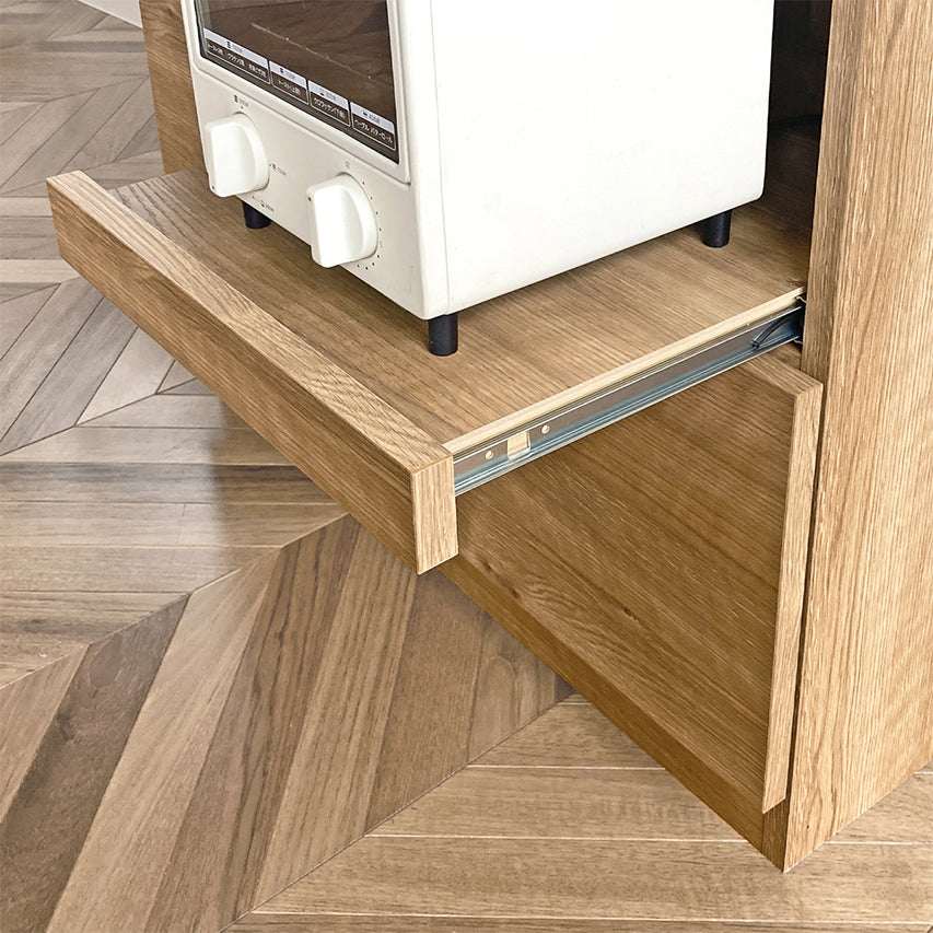 家電をまとめて置けるオープンスペースと、食器やストックをしまえる扉収納を備えたキッチンカウンターです。小さなキッチンでもレイアウトしやすいサイズです。