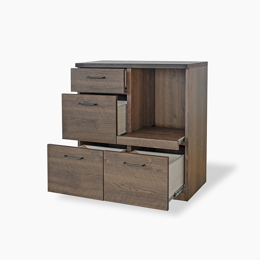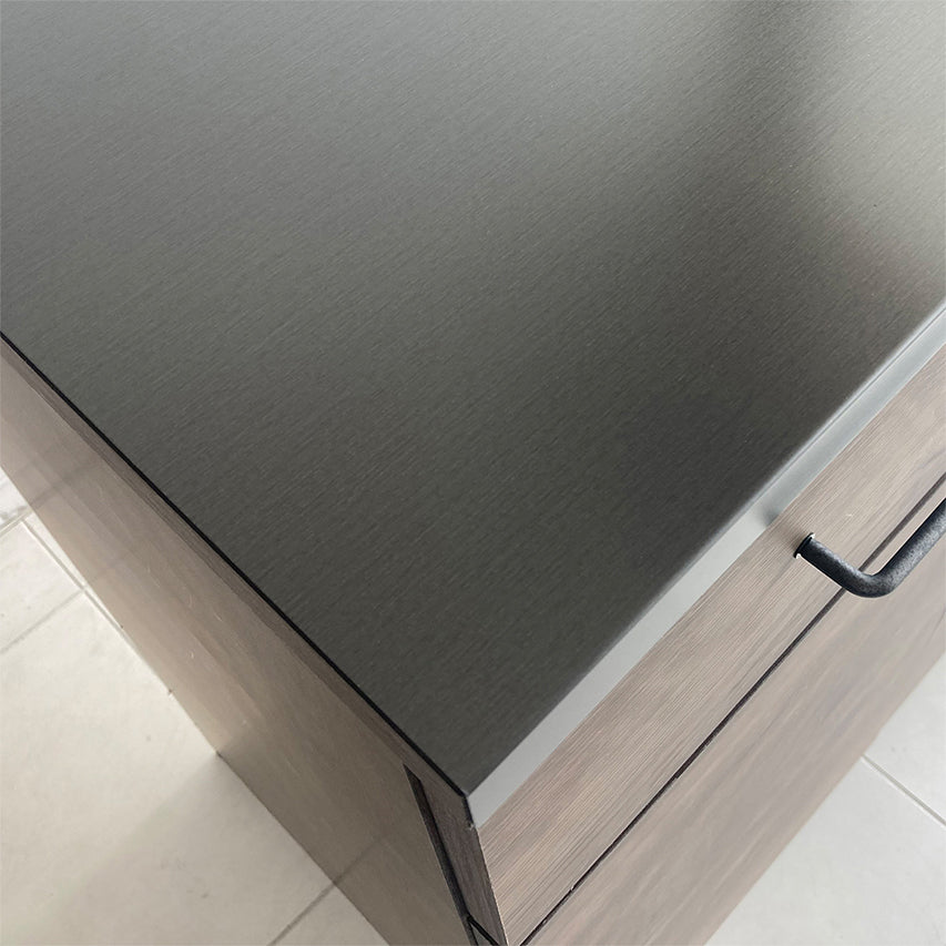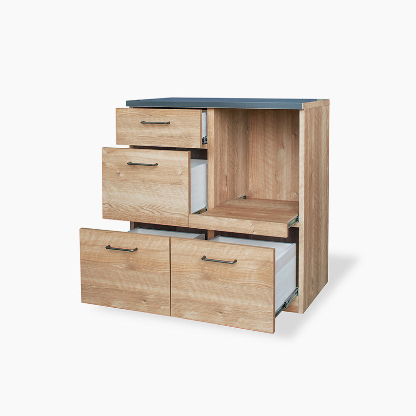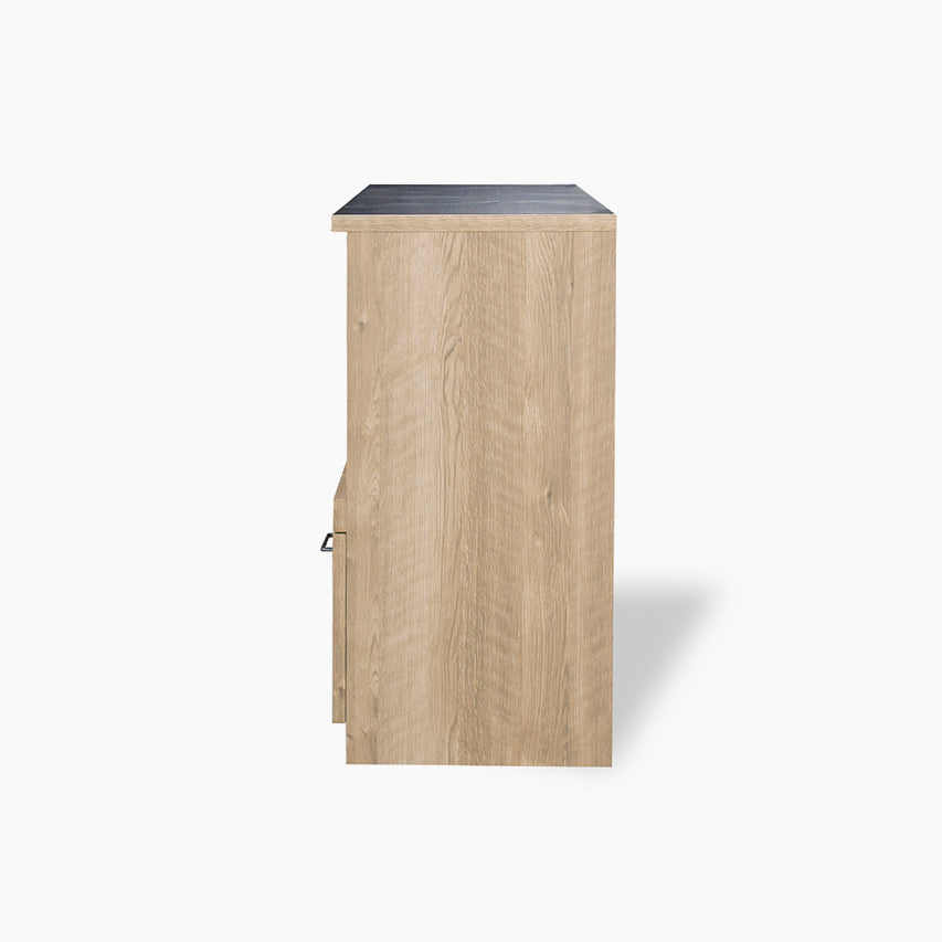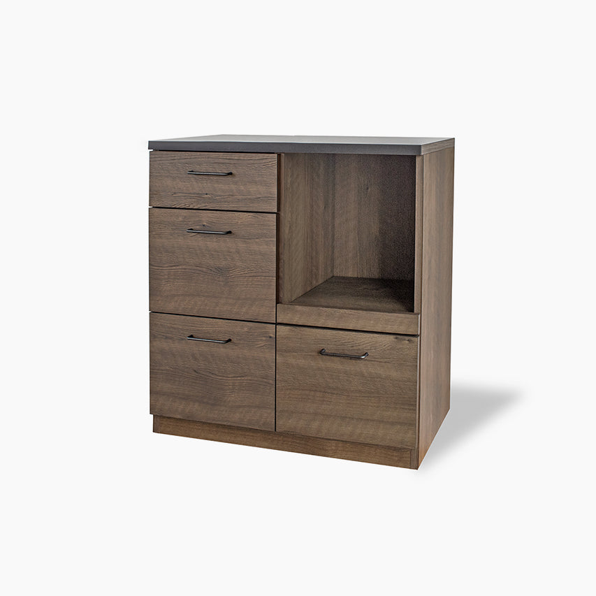 家電をまとめて置けるオープンスペースと、食器やストックをしまえる扉収納を備えたキッチンカウンターです。小さなキッチンでもレイアウトしやすいサイズです。