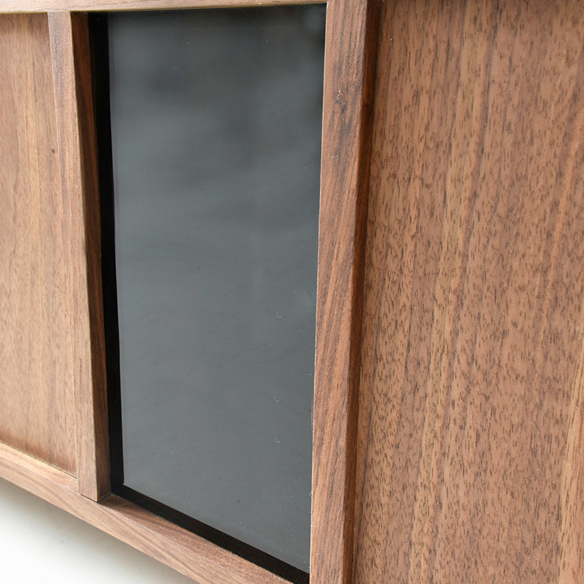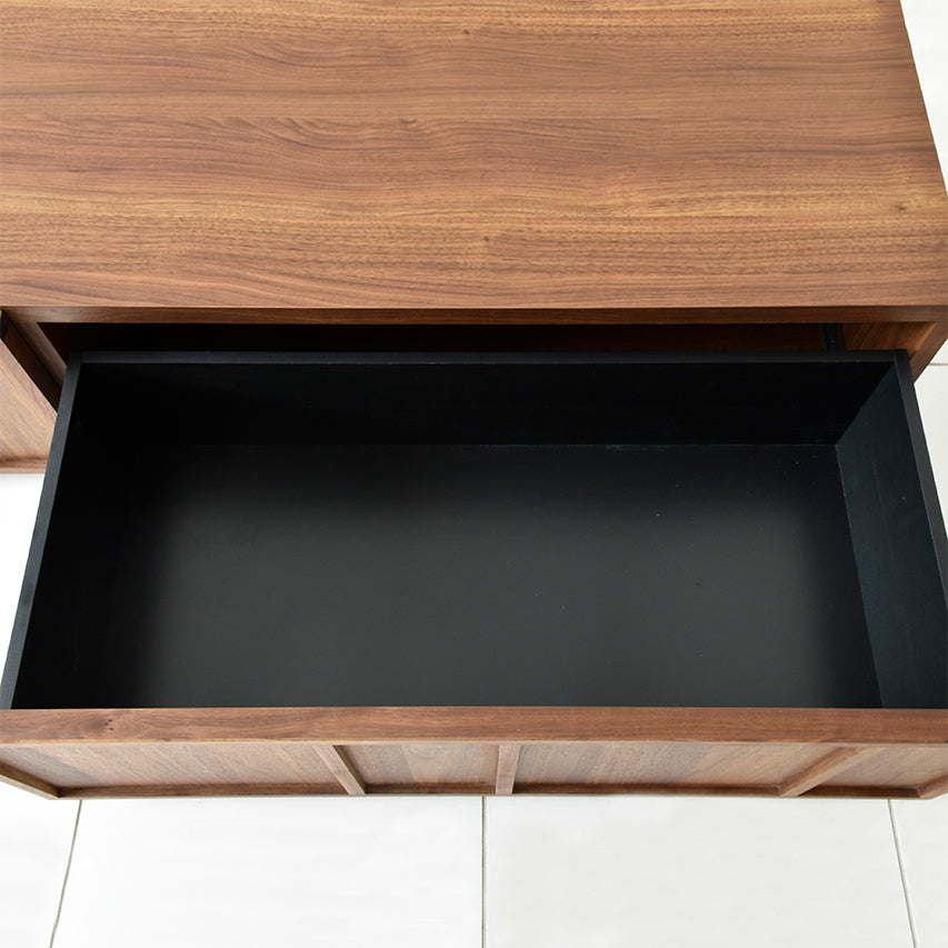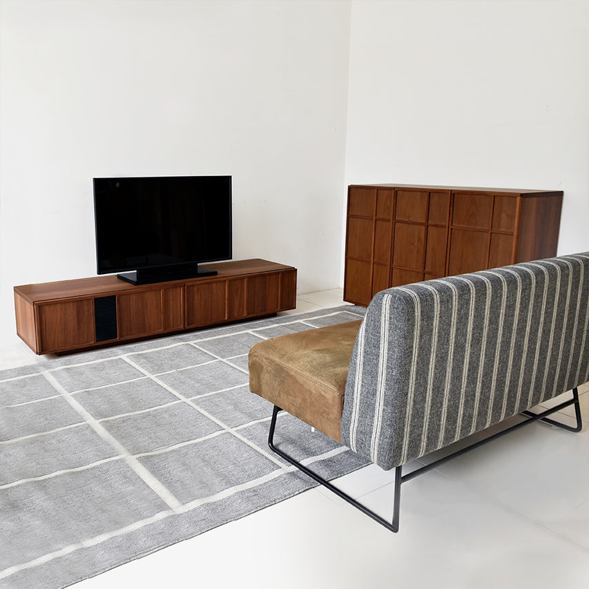 木目の美しさを活かしたローボードです。170cm幅で大型テレビにも対応し、ガラス扉を活かしたAV機器の収納がしやすい構成です。