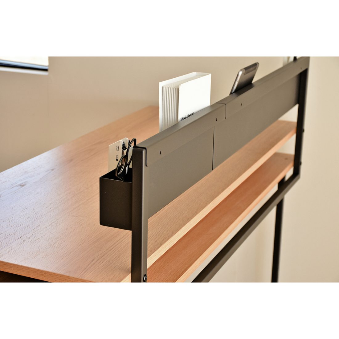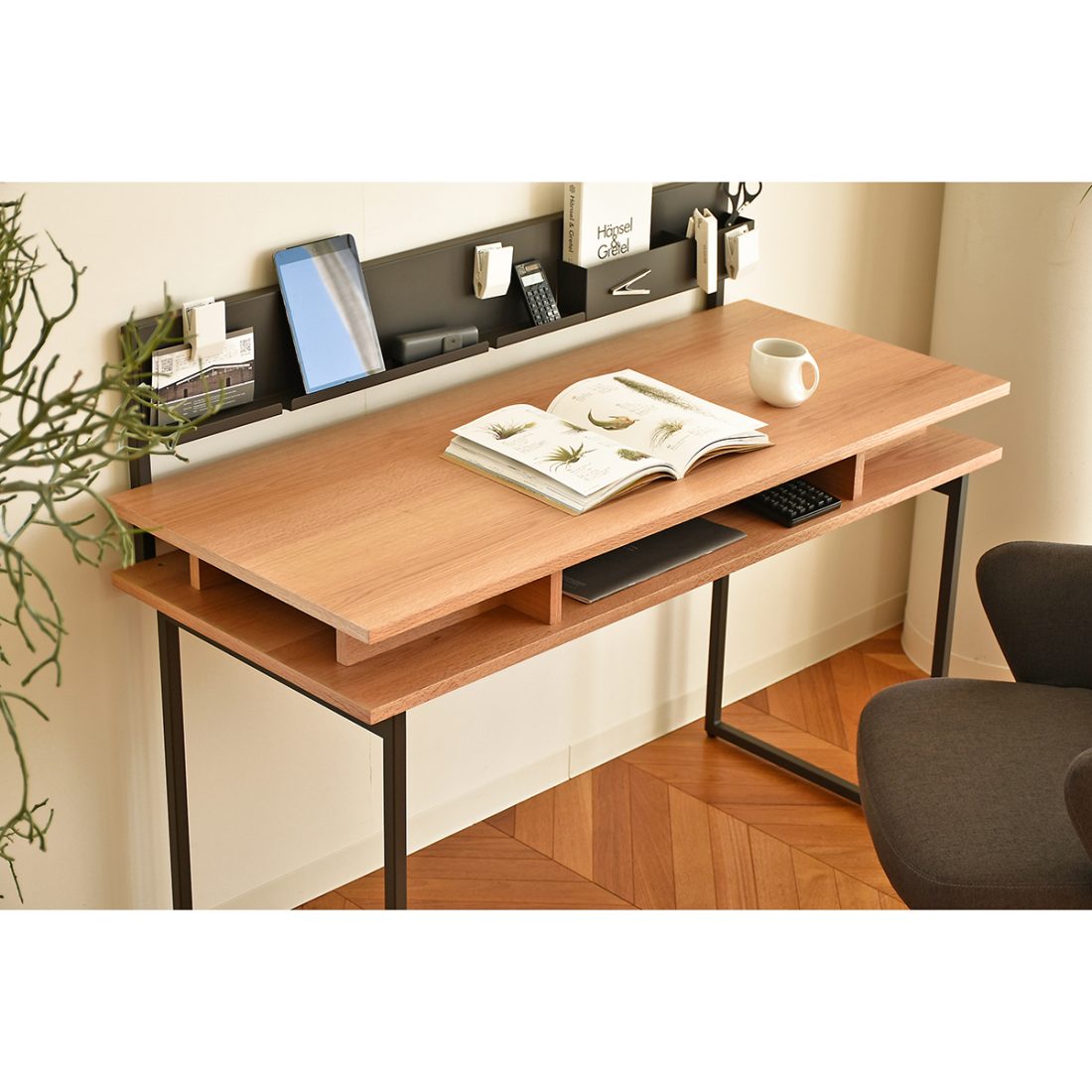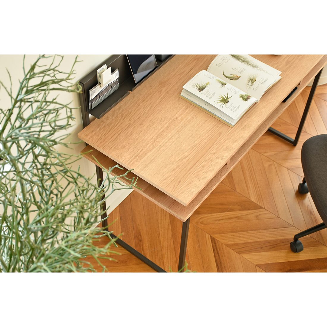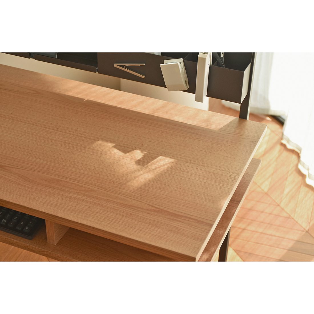 すっきりとした脚部と落ち着いた木目の天板でまとめたワークデスク。奥行を抑えたサイズ感で、リビング学習やテレワークにも取り入れやすい一台です。