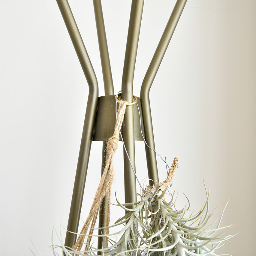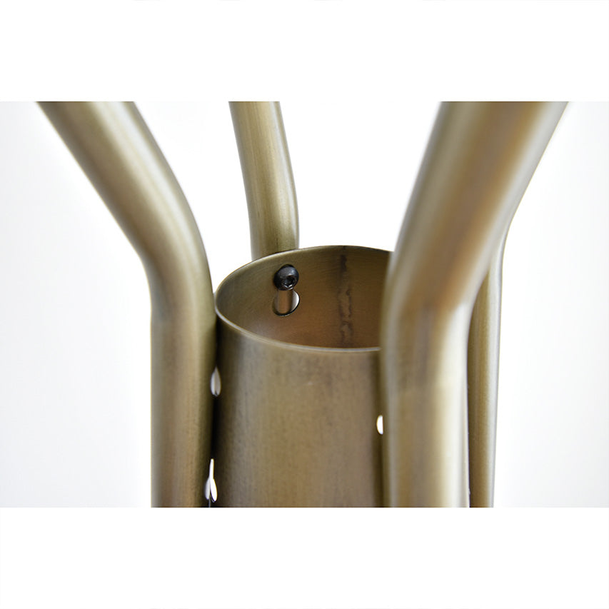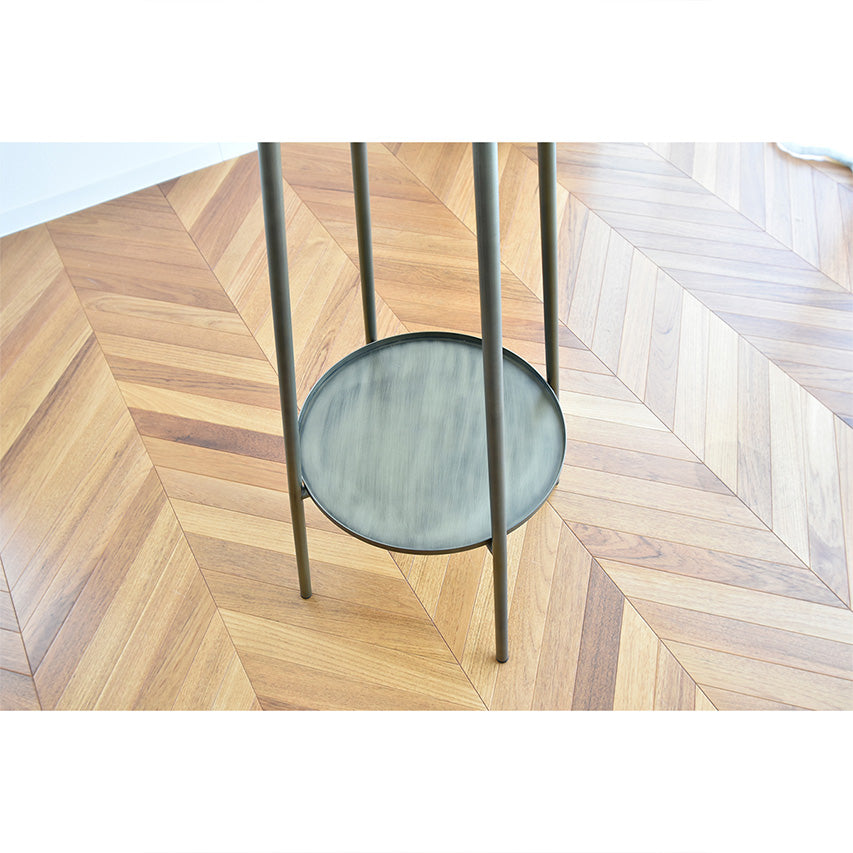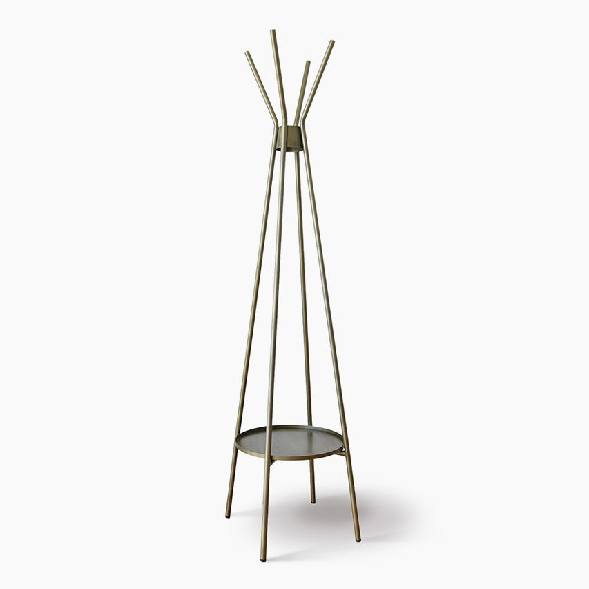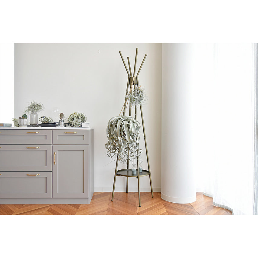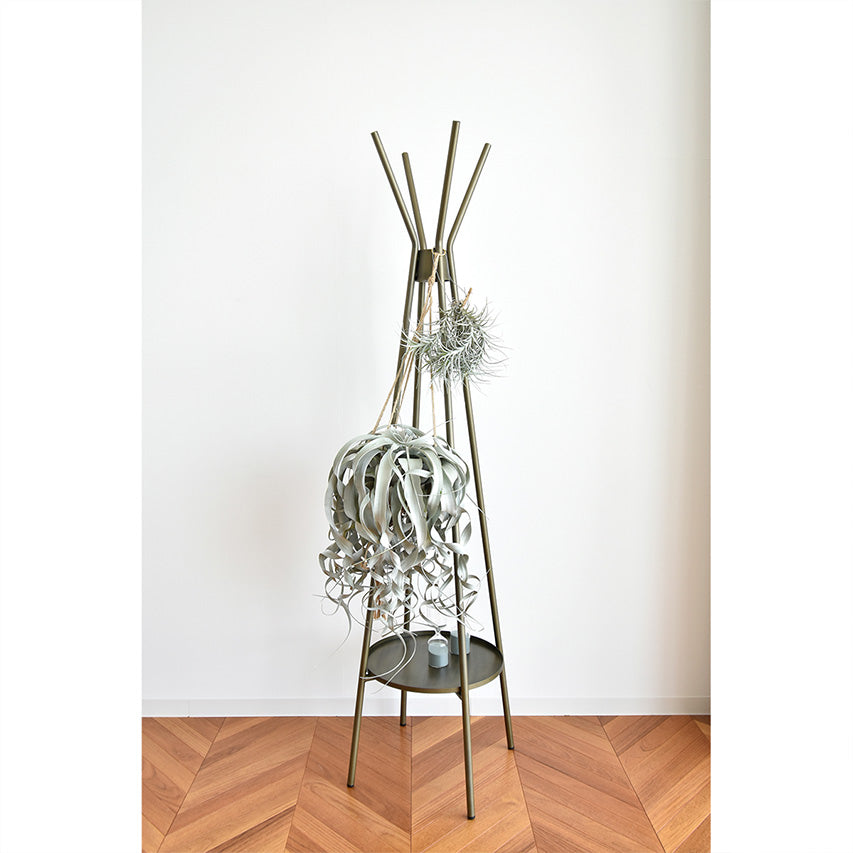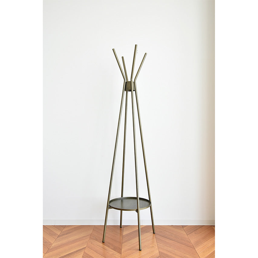 直線的なフレームに木のアクセントを加えたハンガーラックです。リビングや玄関先で使いやすいサイズにまとめられています。