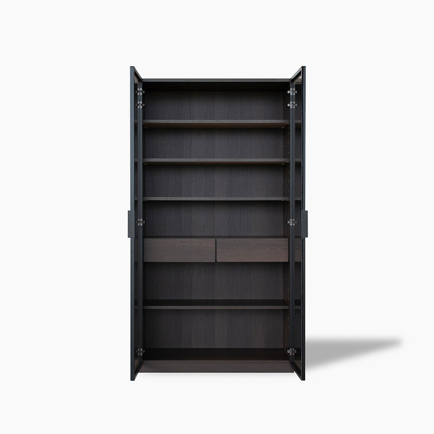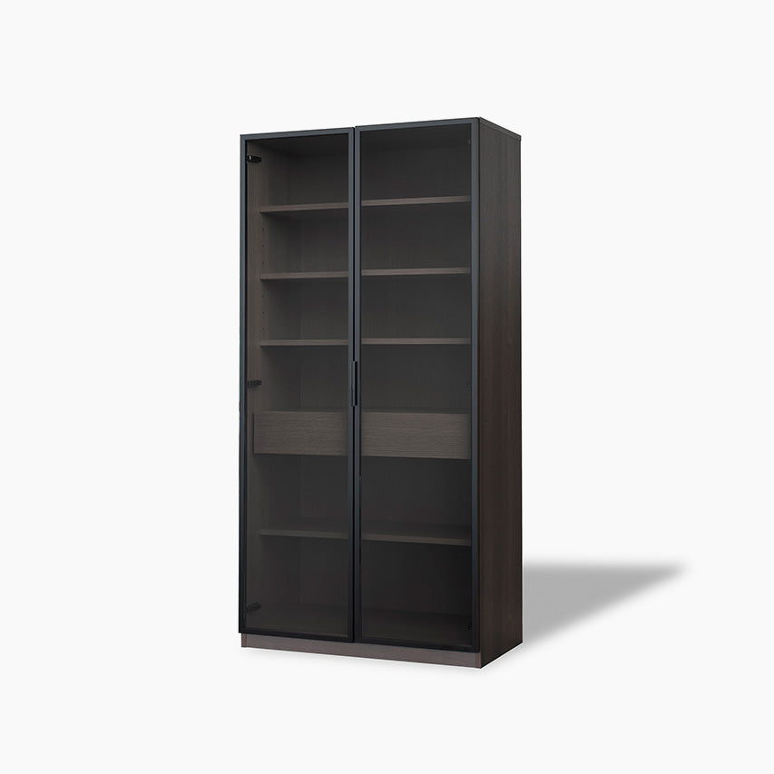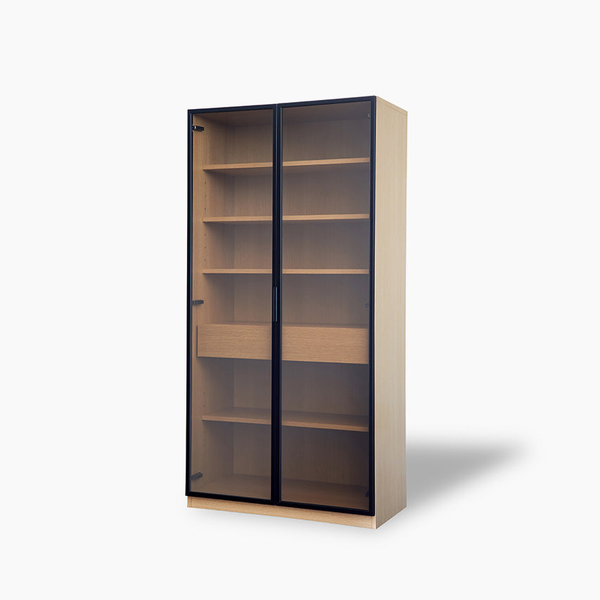 うっすらと色づいたガラス扉とフラットな前板が端正な印象のガラスキャビネットです。内部には可動棚や引き出しを備え、食器から小物までをすっきりとディスプレイしながら収納できます。
