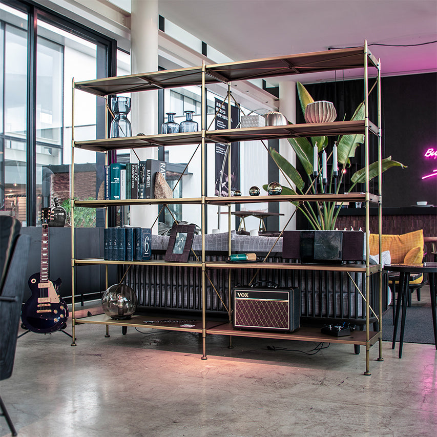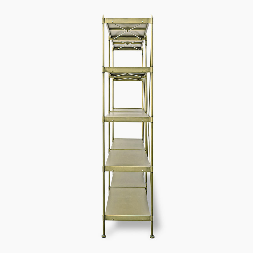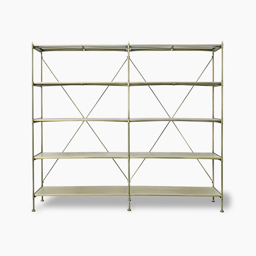 幅202のスチール製大型シェルフです。フレームから棚板まで金属でまとめた端正な構成で、量感のあるサイズながらシャープに収まり、書籍やオブジェのディスプレイに映えます。堅牢なスチールの質感が空間を引き締め、ショップライクな見せる収納を実現します。
