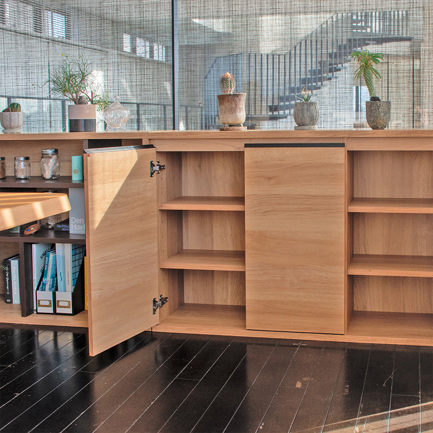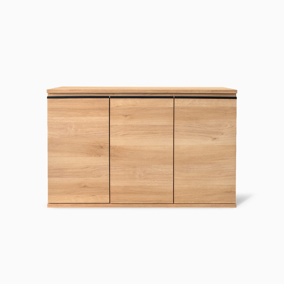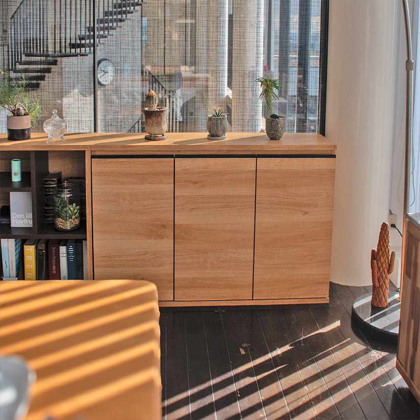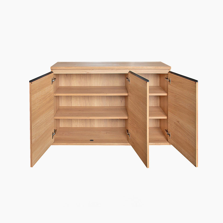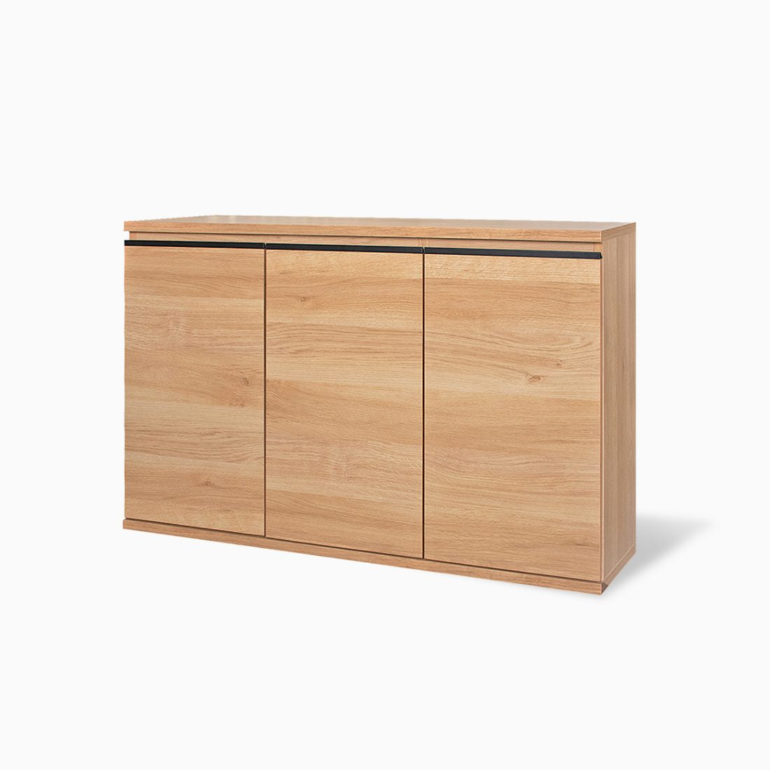 扉付きの120cm幅スリムキャビネットです。大きく開く両開き扉で中が見やすく、生活感の出やすい物をすっきり隠せます。