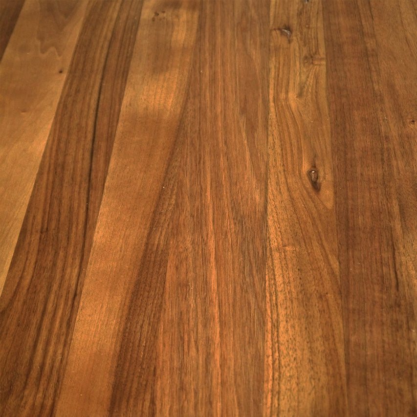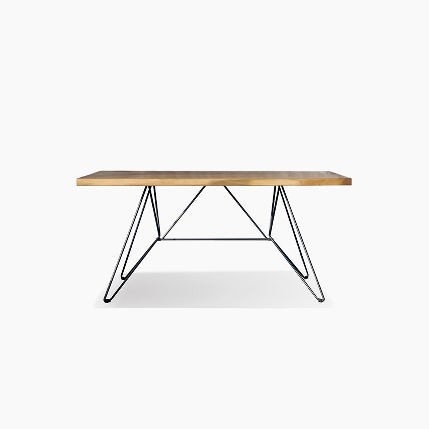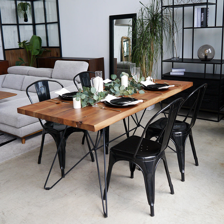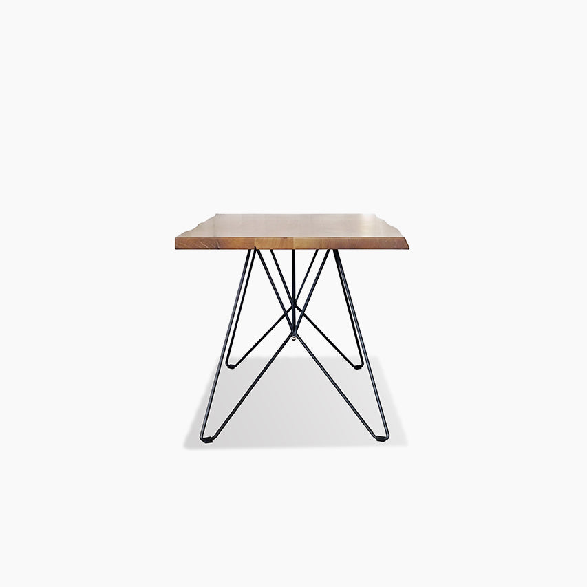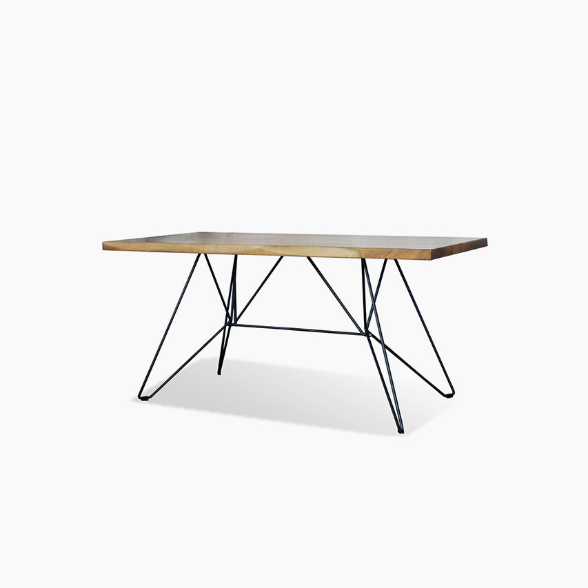 厚みのあるウォルナット天板とブラックスチール脚の組み合わせが存在感を放つダイニングテーブルです。直線的なデザインで空間をシャープに引き締めます。
