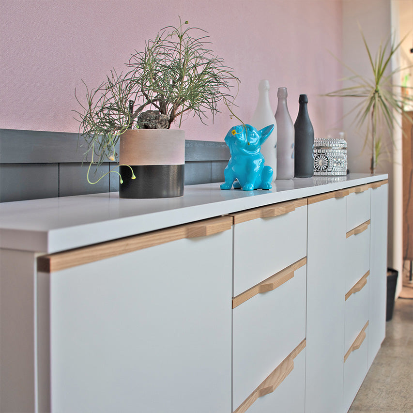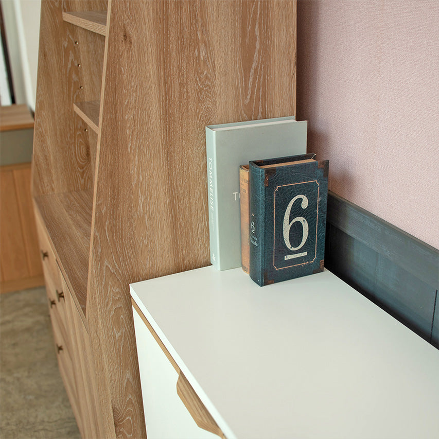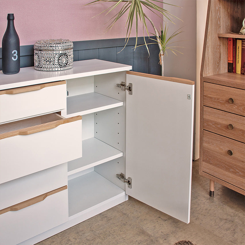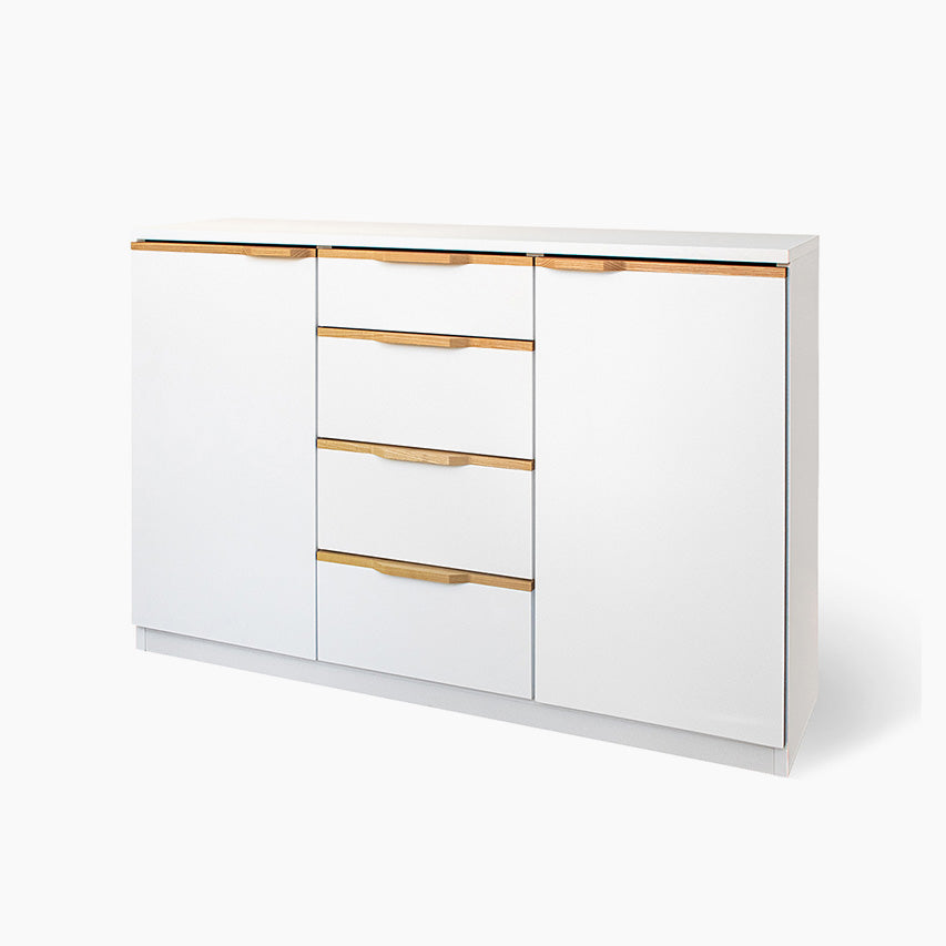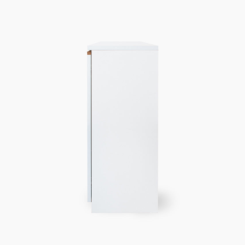 奥行きを抑えたスリム設計のキャビネットです。幅120×奥行33.6×高さ80cmで廊下やカウンター下にも置きやすく、明るい表情の前板とシンプルな箱形が様々なインテリアに馴染みます。