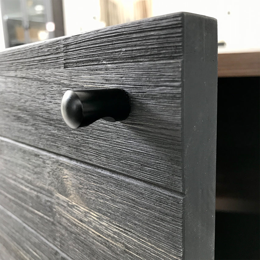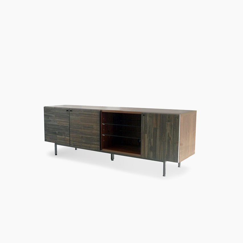 アカシア材の前板とガラス、ブラックスチール脚のコントラストが印象的なローボードです。左右の開き戸と中央のオープン棚でAV機器や周辺小物を整理しやすく、天板・ボディはメンテナンスしやすい化粧仕様。落ち着いた木目がリビングの主役として存在感を放ちます。