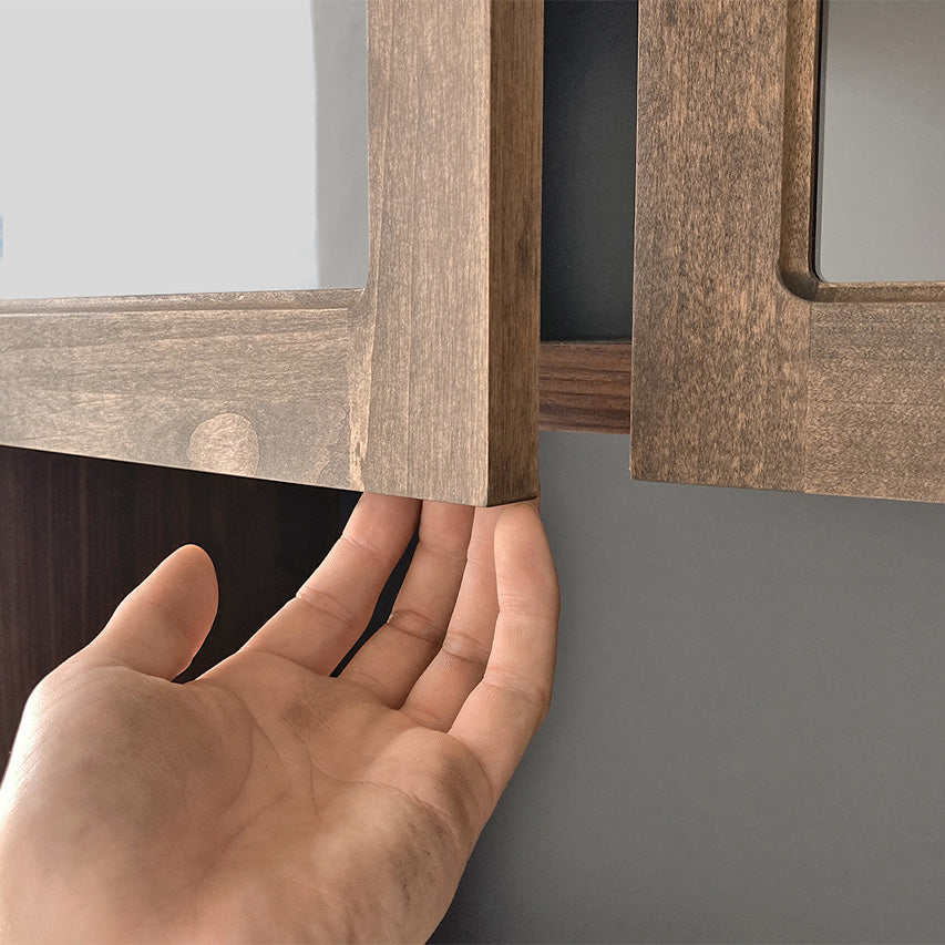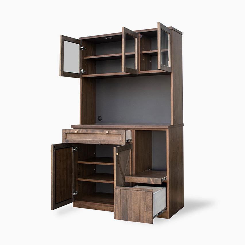 天然木とガラスの素材感が際立つカップボードです。引き出しや扉収納でキッチンの多くのものを収納することができ、家電置き場としても使いやすい構成です。