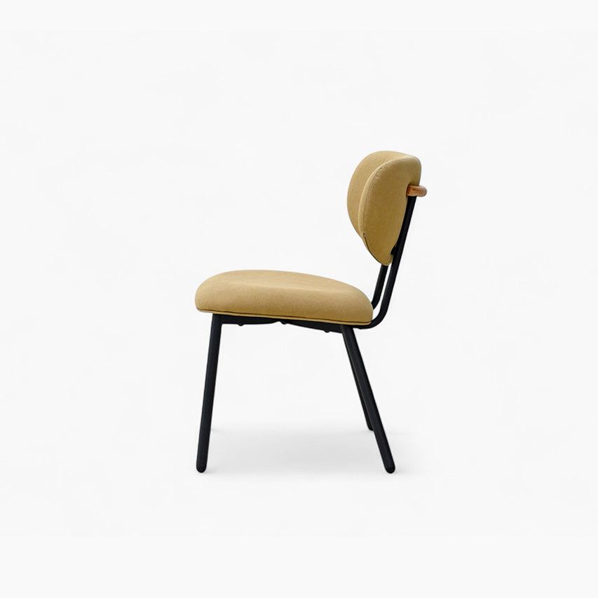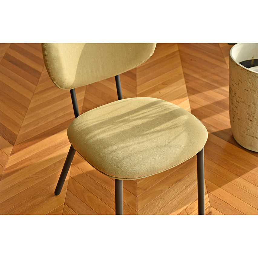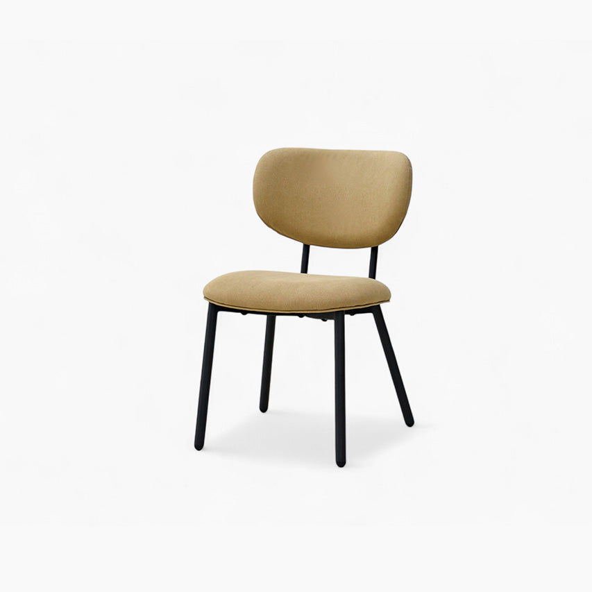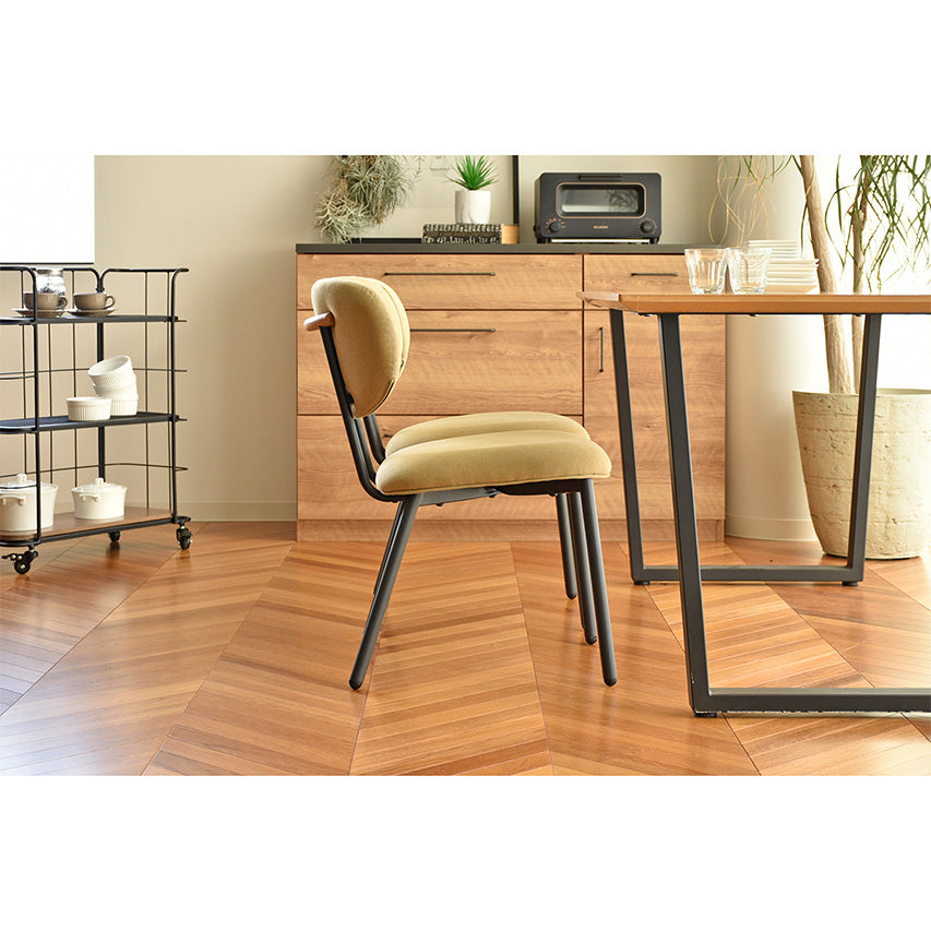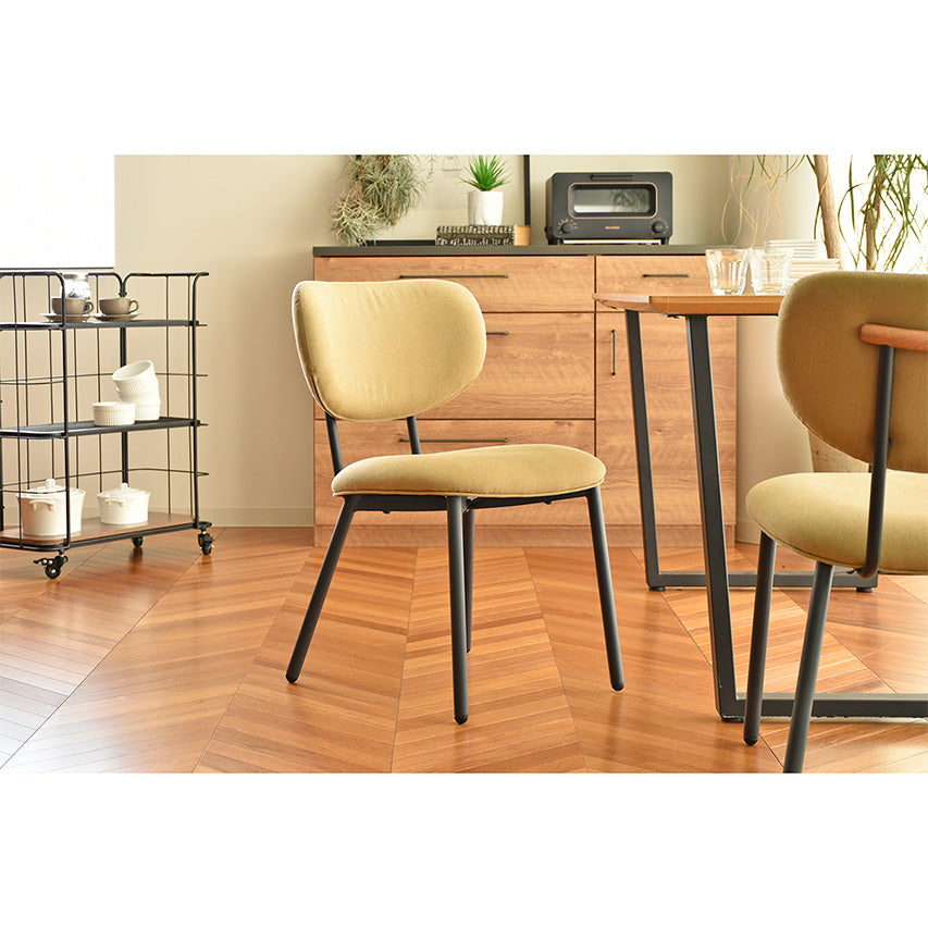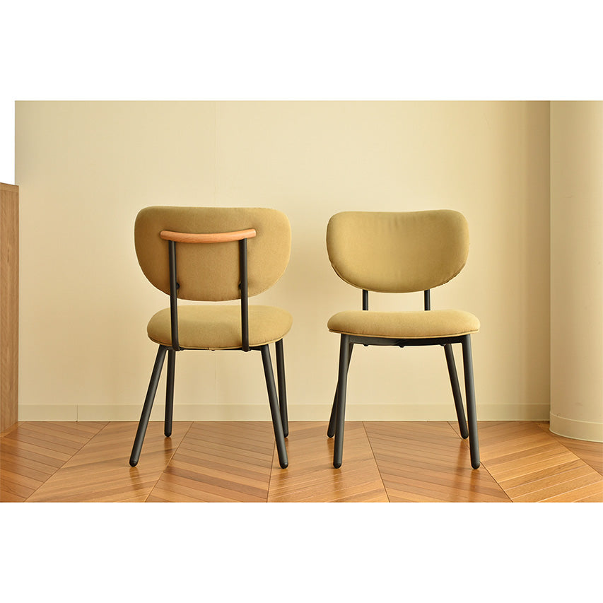 アームレスのダイニングチェアです。コットン80%・ポリエステル20%の張地とスチール脚で軽快に仕上げ、背中の木部アクセントが北欧テイストのやわらかさを添えます。