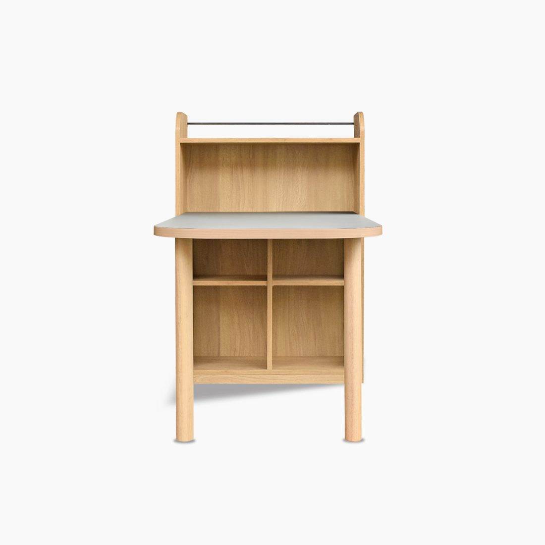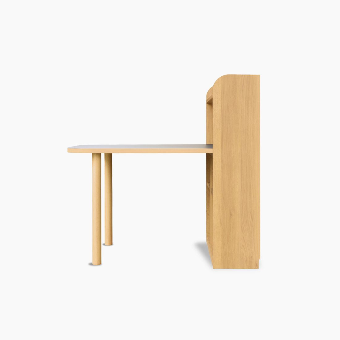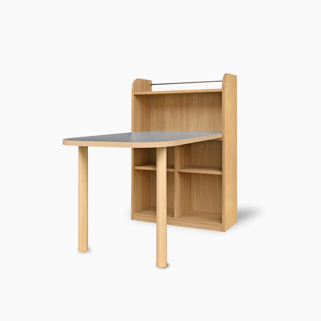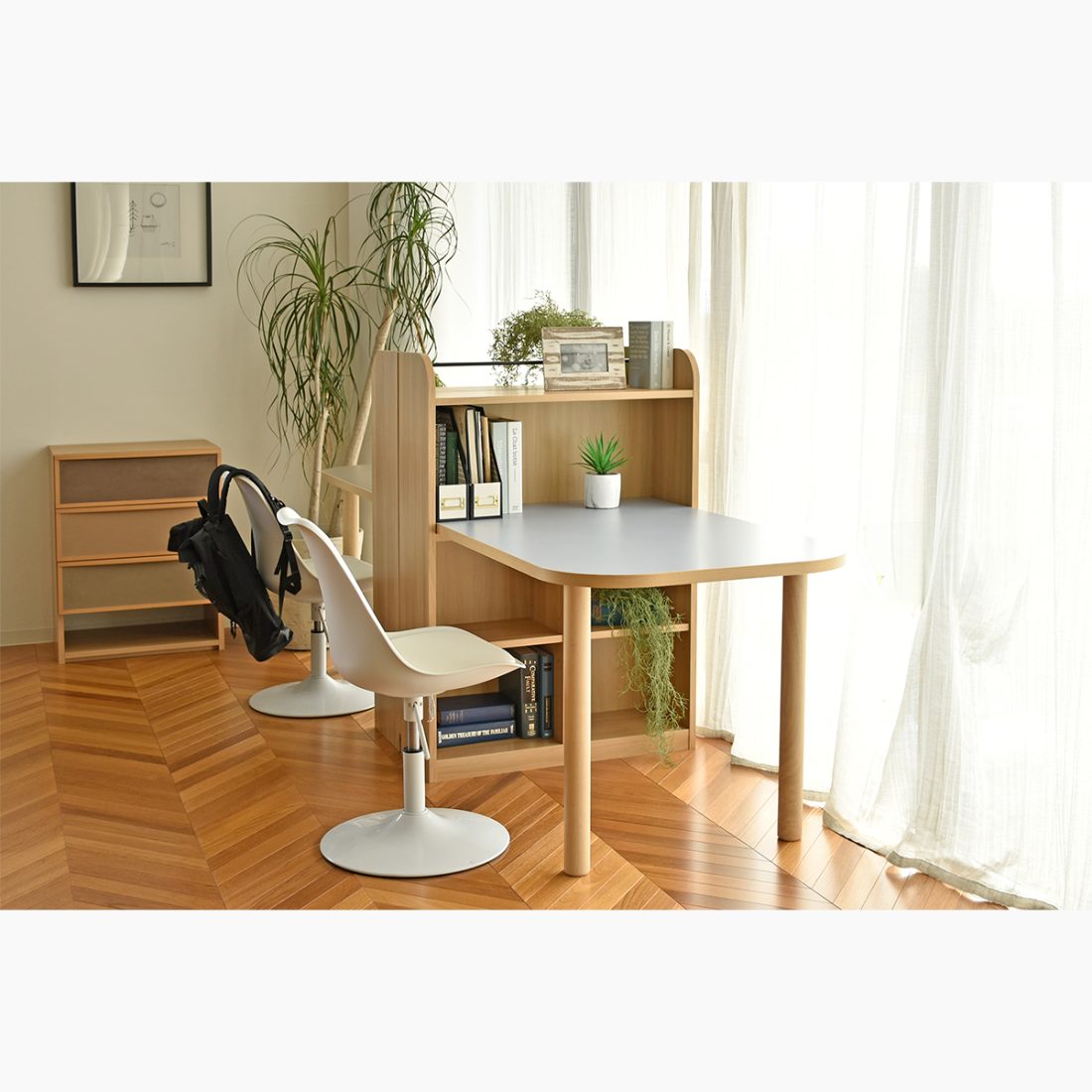天板とシェルフを一体化した新しい発想の収納テーブルです。背面化粧仕上げで空間の間仕切りとしても活躍し、ディスプレイと作業の両方に使えます。