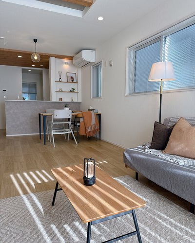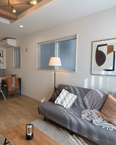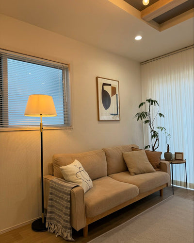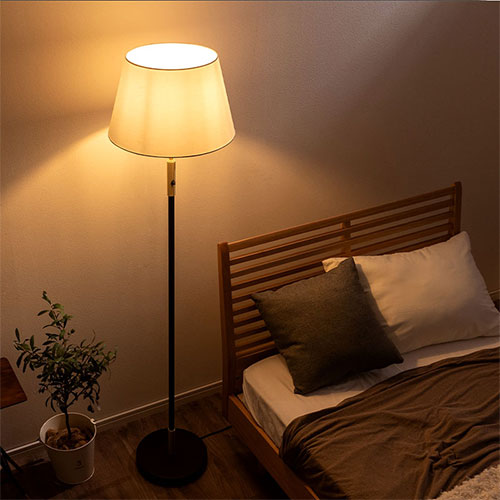 暖かい明りを楽しめるフロアランプです。布を通した柔らかな光が広がり、お部屋をゆったりとくつろぐ場所に変えます。