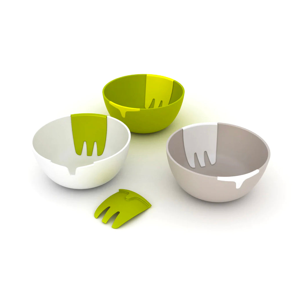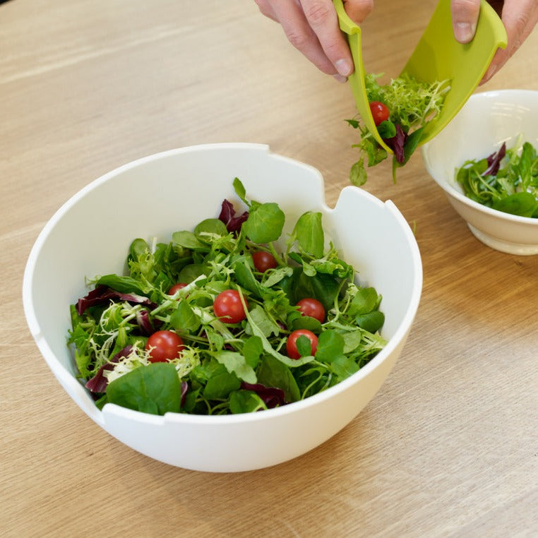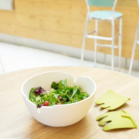 ボウルと取り外し可能なサラダサーバーが一体化したサラダボールです。二つの手がボウルを包みこむような優しいデザインです。サラダを食卓に並べる際に、サーバーを探す必要もありません。必要な時だけ取り外して使い、食事中もボウルにひっかけて置いておけます。
