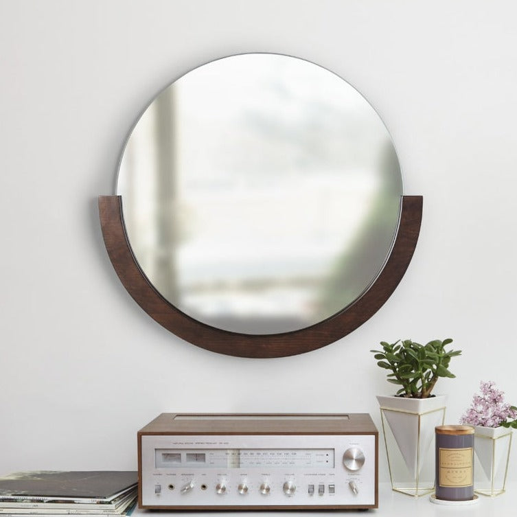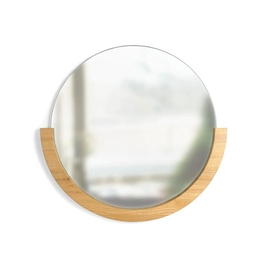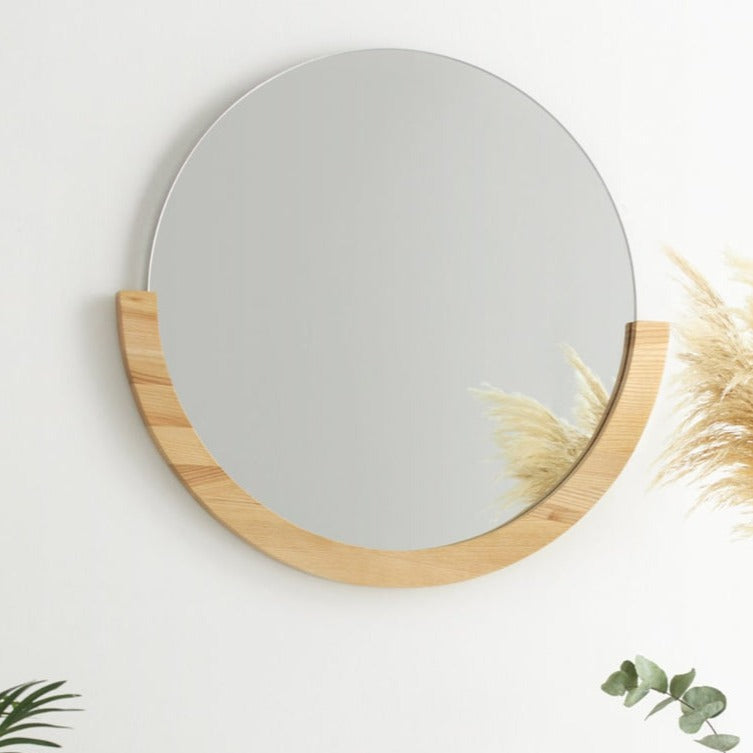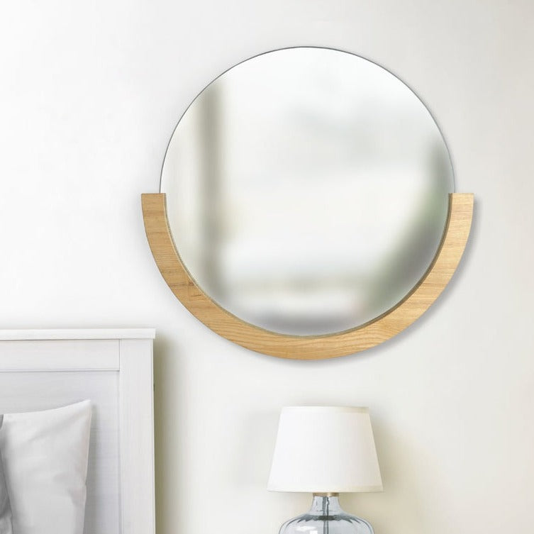 半円形の天然木フレームが特徴のウォールミラーです。ウッドフレームの暖かみが、冷たいバスルームにも優しく演出してくれます。特徴的なフォルムは、リビングや玄関ホールに最適です。