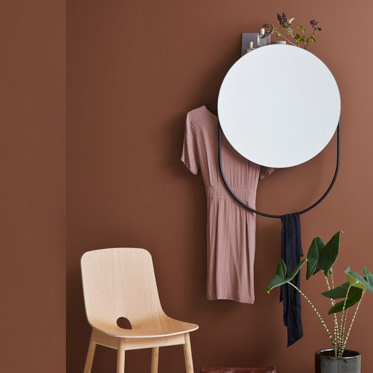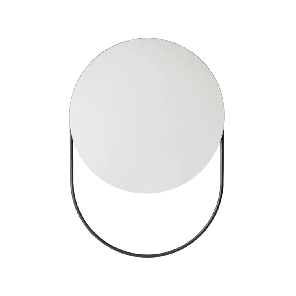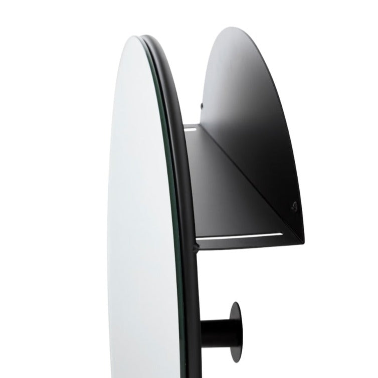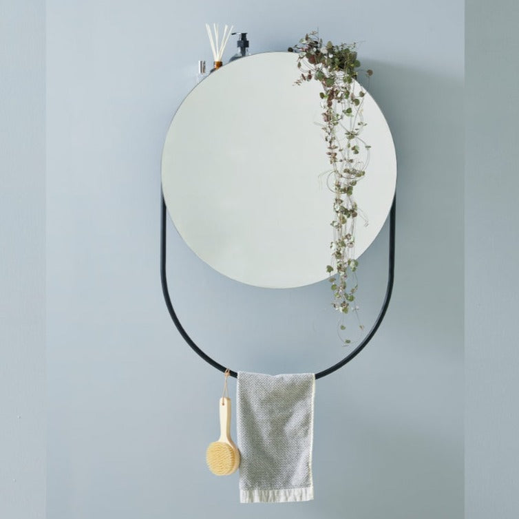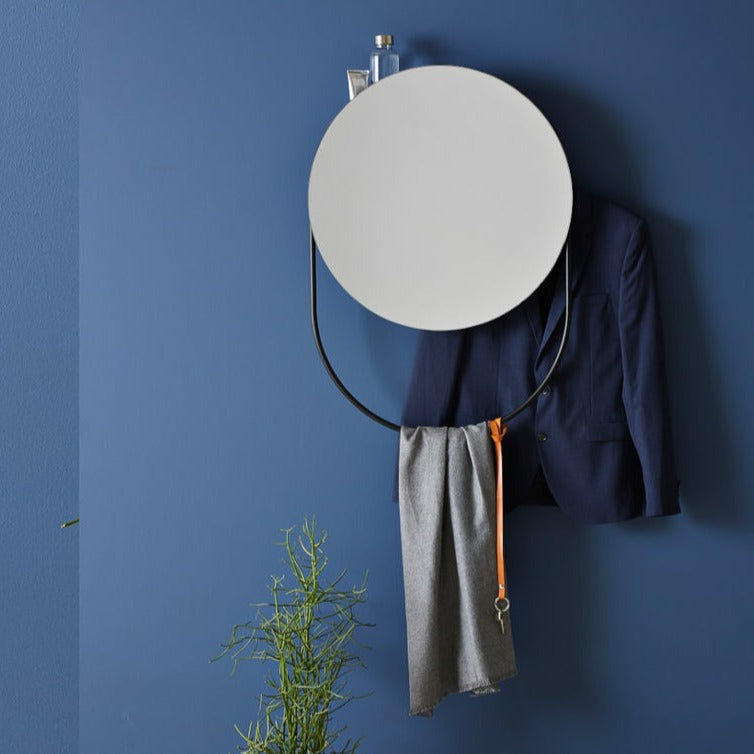 円形のミラーにブラックフレームがついたウォールミラーです。アクセサリーやタオルなどを掛けておけるスチールフレームが特徴で、デザインと機能が両立しています。また、背面には取付具を兼ねた一段のシェルフが配置されています。
