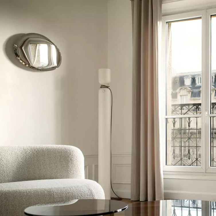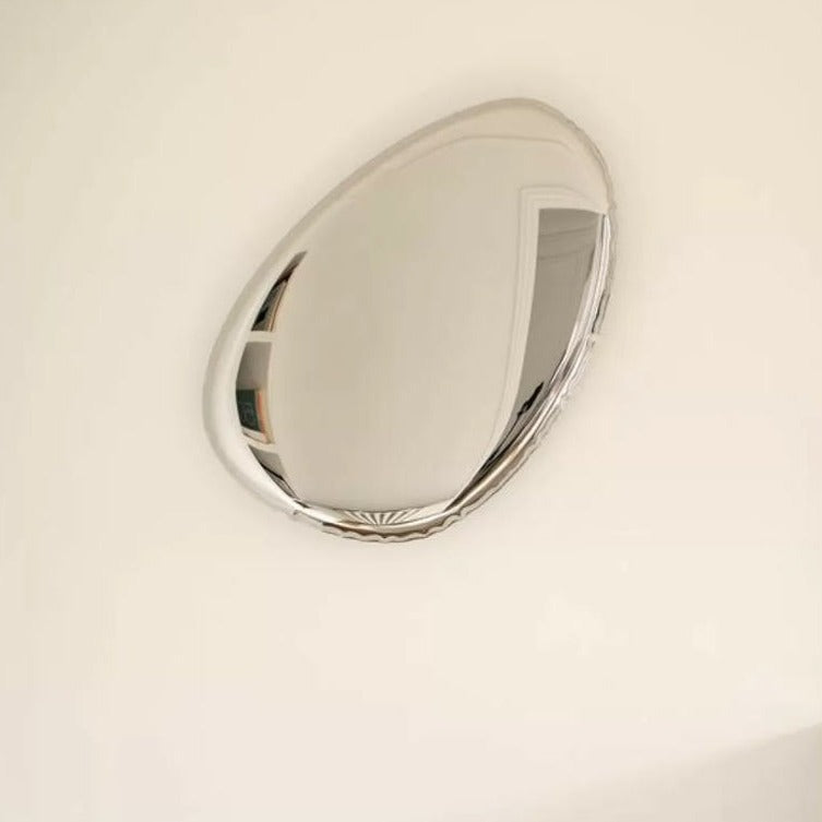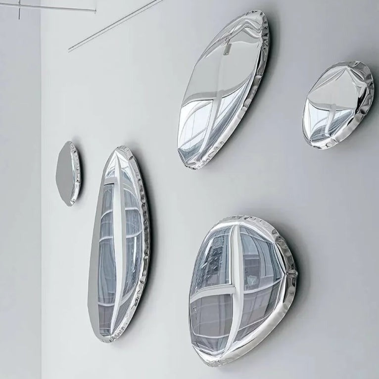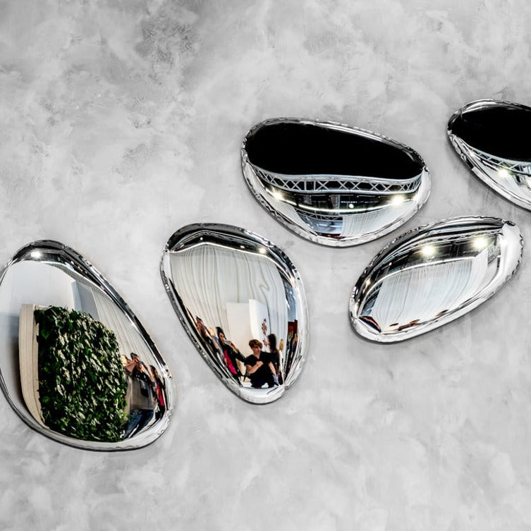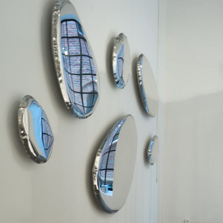 液体からインスピレーションを受けた有機的なフォルムが特徴のウォールミラーです。異なるサイズを自由なレイアウトで組み合わせで配置したり、単一の彫刻のようなミラーとしてコーディネートが可能です。