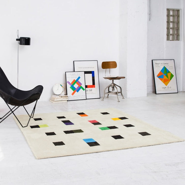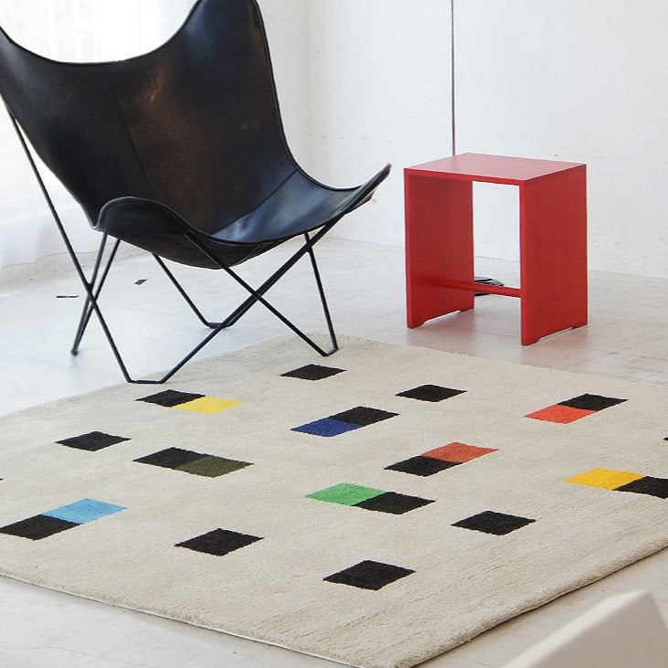 国内で製糸された毛糸を使用して、職人によって一枚一枚手作業で作られたラグです。材質はアクリルモデルで、吸水性が少ないため、水溶性の汚れが付着しにくく、カビや害虫がつきにくい仕様になっています。床に宝石を散りばめたようなデザインが主張しすぎず、心地良い印象を与えます。