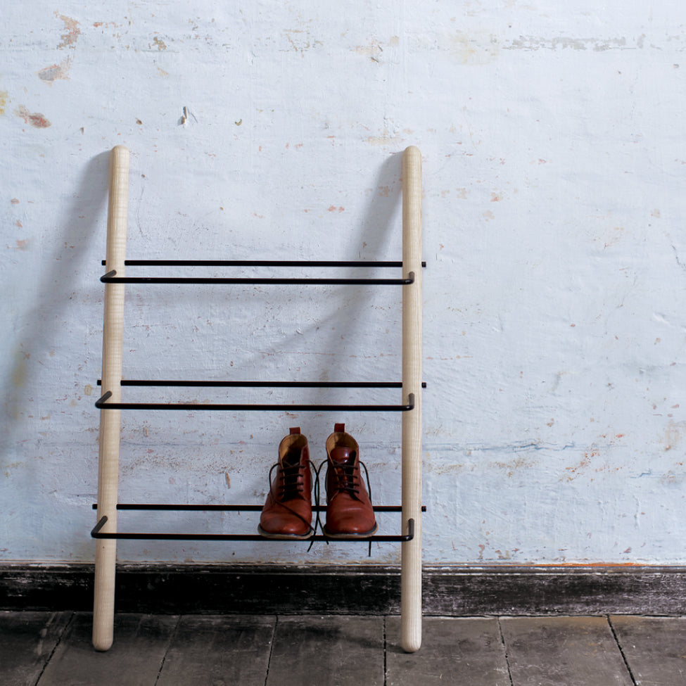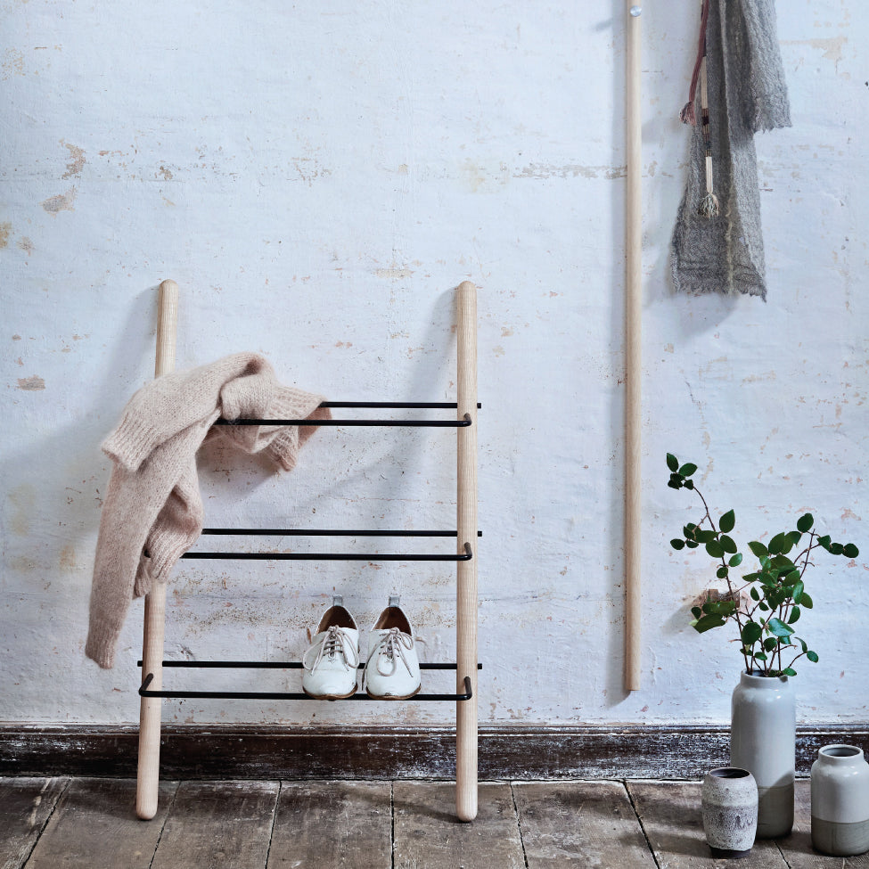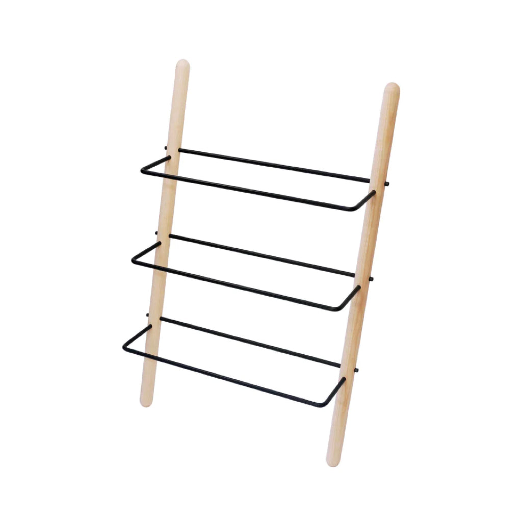 上品な雰囲気のシューズラックです。細い木製のバーと薄い金属のフレームで構成され、軽快でミニマルな印象が美しく玄関スペースを飾ってくれます。お気に入りの靴のディスプレイ用ラックとして、ゲスト用のルームシューズラックとして自由に使用できます。