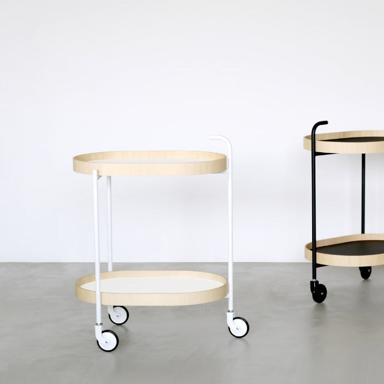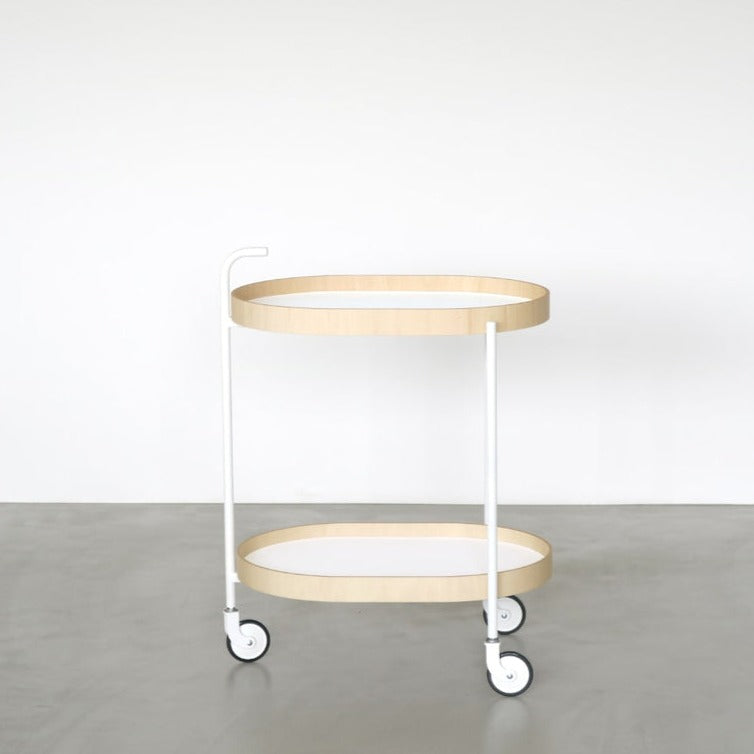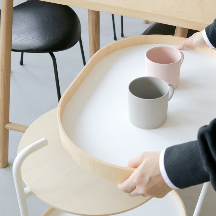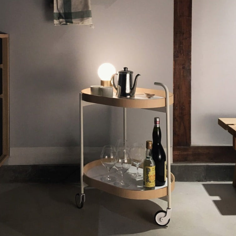 美しい佇まいの可動式2段トローリーです。シンプルなデザインながら、優美な全体の存在感がインテリアの中で自然と引き立てられます。キッチンとダイニングルームをつなぐ便利なトローリーは、上下段とも取り外しができる木のトレーの機能性、日本の居住空間になじみやすく、日常使いにぴったりの少し小さめのサイズが特徴です。