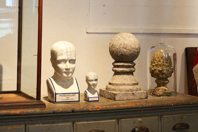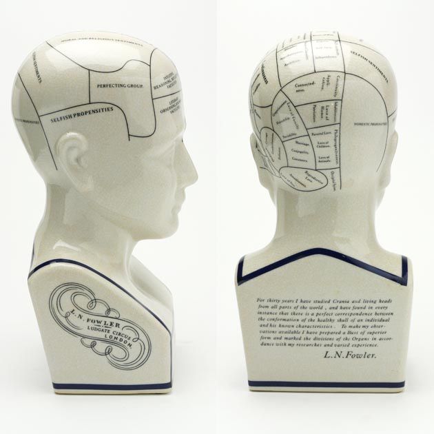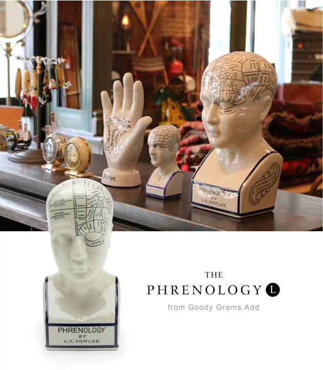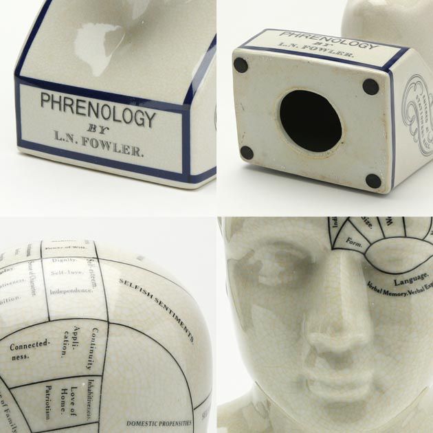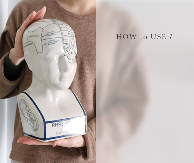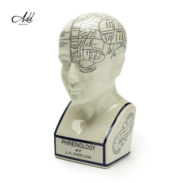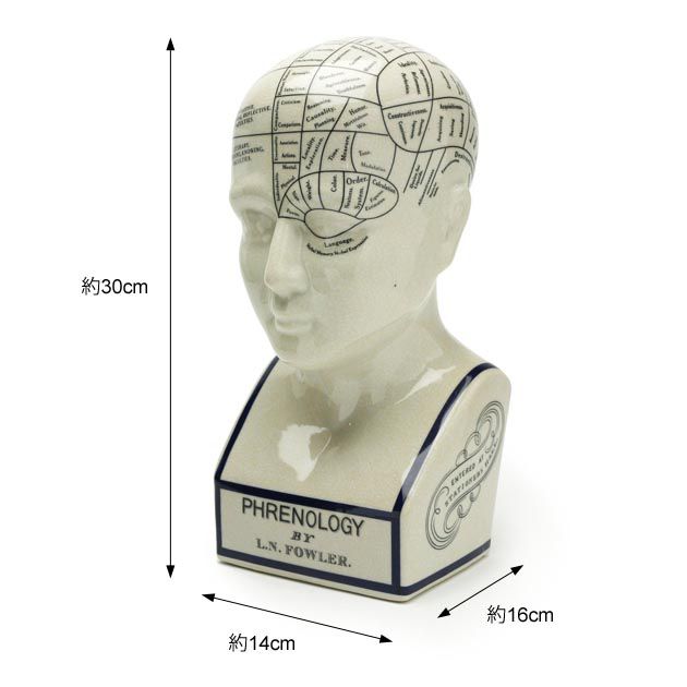 骨相学(phrenology:フレノロジー)で使用されたヘッドモデルがモチーフになったインテリアオブジェ。骨相学とは「頭蓋骨の形から個人の性格がわかる」という考え方で、欧米で19世紀に隆盛を誇りました。現在、骨相学は衰退していますが、当時使用されたヘッドモデルがインテリアオブジェとして登場。ブロック分けされた頭部には私たちが普段考えていることや感じ取っていることが簡単な単語で記されています。ありふれたインテリアオブジェに飽きた人にとっておきの商品。人体模型のような、医療機器のような独特な雰囲気ですが、ヴィンテージ風の家具やモダンなインテリアにオブジェとして合わせると不思議とインテリアのスパイスとなってくれます。アイボリーの磁器でできた本体には貫入(ひびの模様)が入っており、真っ白でないのがポイントです。胸部にはネイビーのパイピングが施されており、側面のロゴは西洋風の雰囲気です。サイズ展開は大小2種類。頭部は直径15cm前後なので少し小さめですが、帽子掛けとしてのご使用もいかがでしょうか。