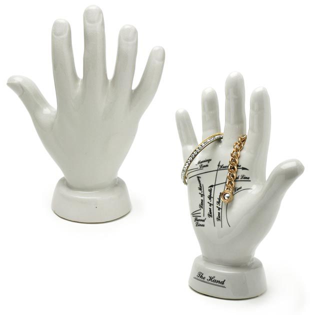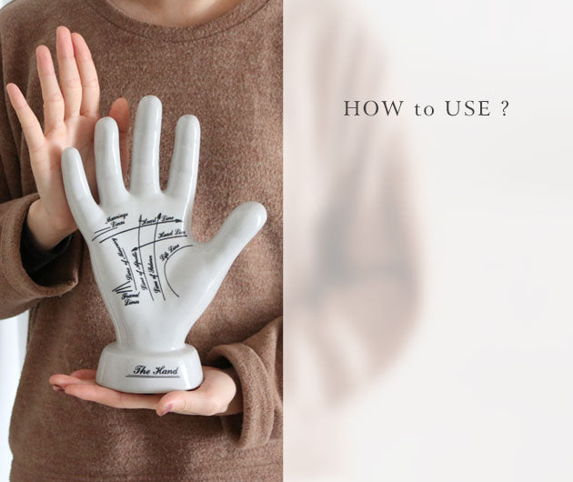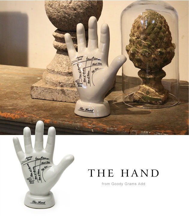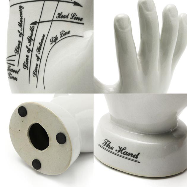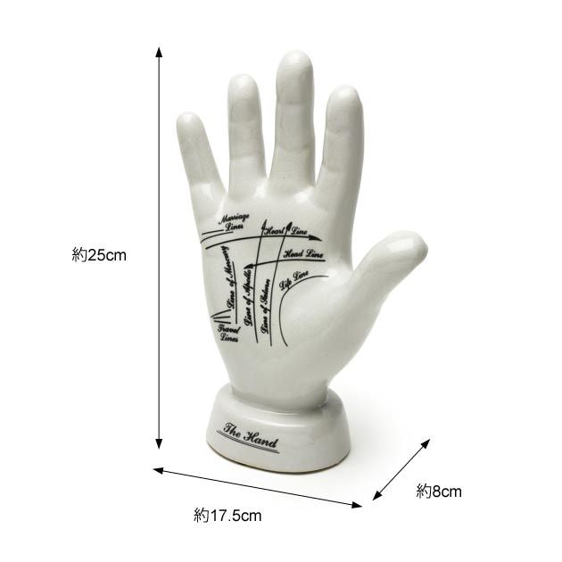 英語で簡単な手相が書かれたハンドオブジェ。Phrenology(骨相学)ヘッドモデルシリーズの手相タイプです。よくみる木製のハンドトルソーなどとは一味違う、人体模型のような、医療機器のような独特な雰囲気です。ありふれたインテリアオブジェに飽きた人にとっておきの商品です。ホワイトの磁器でできた本体には貫入(ひびの模様)が入っており、真っ白でないのがポイントです。筆記体の英字で生命線(Life line)や結婚線(Marriage Lines)などの手相が書かれております。少し大き目の男性の手ほどの大きさです。インテリアオブジェとしてリビングボードや玄関などに置いて個性的な空間を演出するのに役立つほか、ブレスレットやネックレス、キーホルダーがついた鍵などを引っ掛けて使うこともできます。