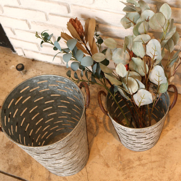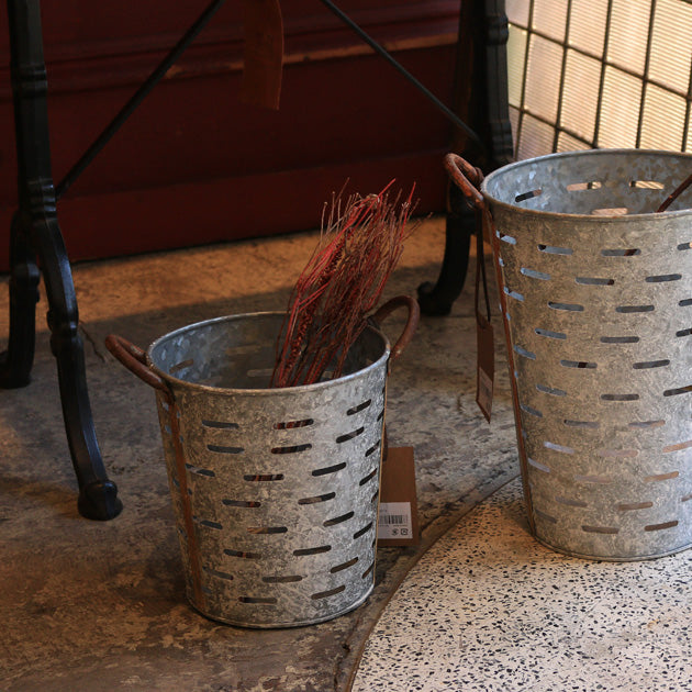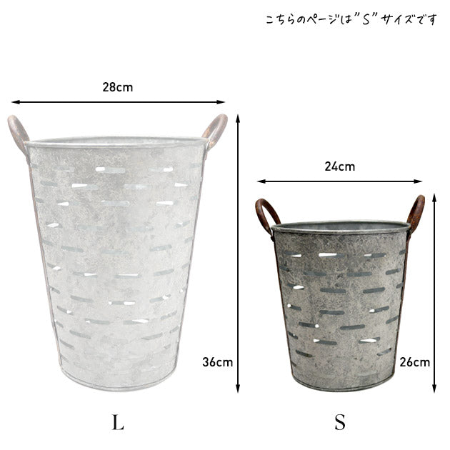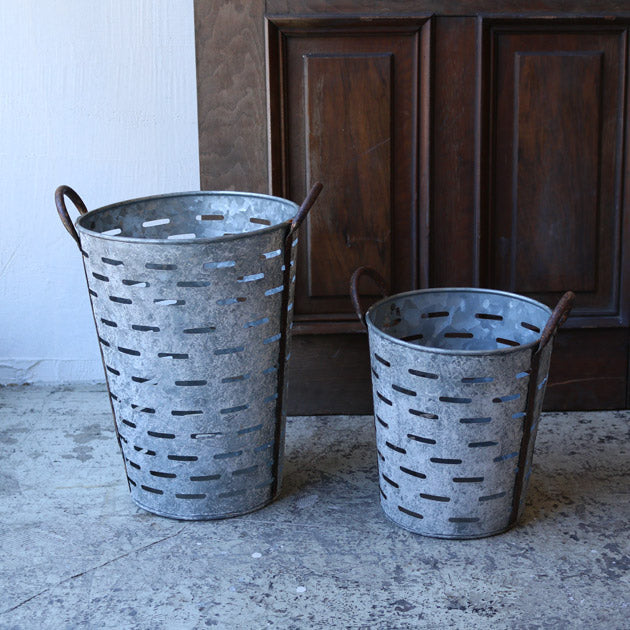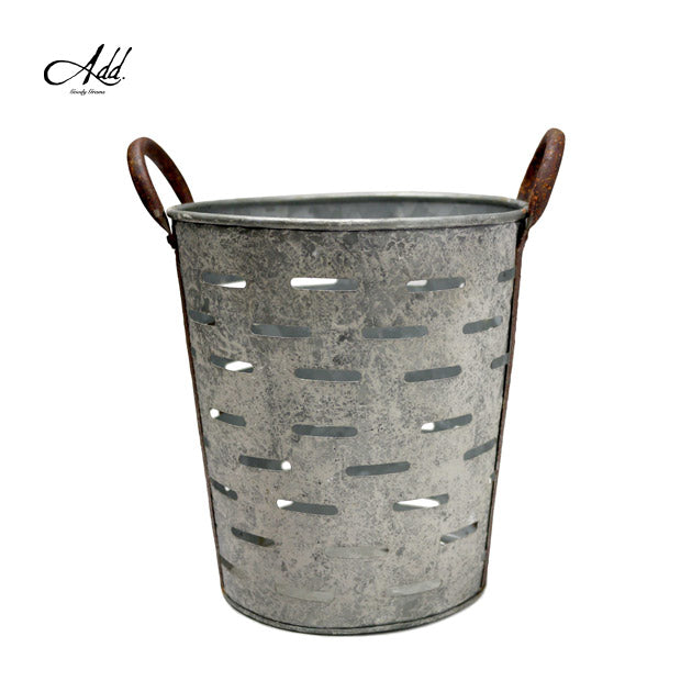 オリーブを収穫する際に使用するバスケット。古びた仕上げによって使用感を演出しております。傘立てやグリーンを飾るときに。