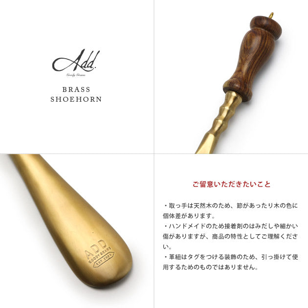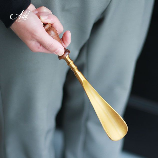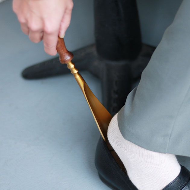雰囲気のあるブラス (真鍮) 製シューホーン。靴べらの歴史は非常に長く、時代とともに使用されてきました。しかし金属製の靴べらが登場するのは1800年代と比較的遅く、逆を言えばこの時期から様々な形状の靴べらが世界に広がることとなったわけです。真鍮という素材もその一つで、使い込むほどに表情と味わいが深まるという特徴は、世代を問わず愛される要因となっています。ヨーロッパでは、真鍮は幸運をもたらす金属として親しまれていて生活に密着する様々なシーンで真鍮を使っています。玄関に一つではなく、一人に一つのアイテムとして、自分に合ったデザイン・サイズの靴べらを選び、長く付き合っていきたいものです。