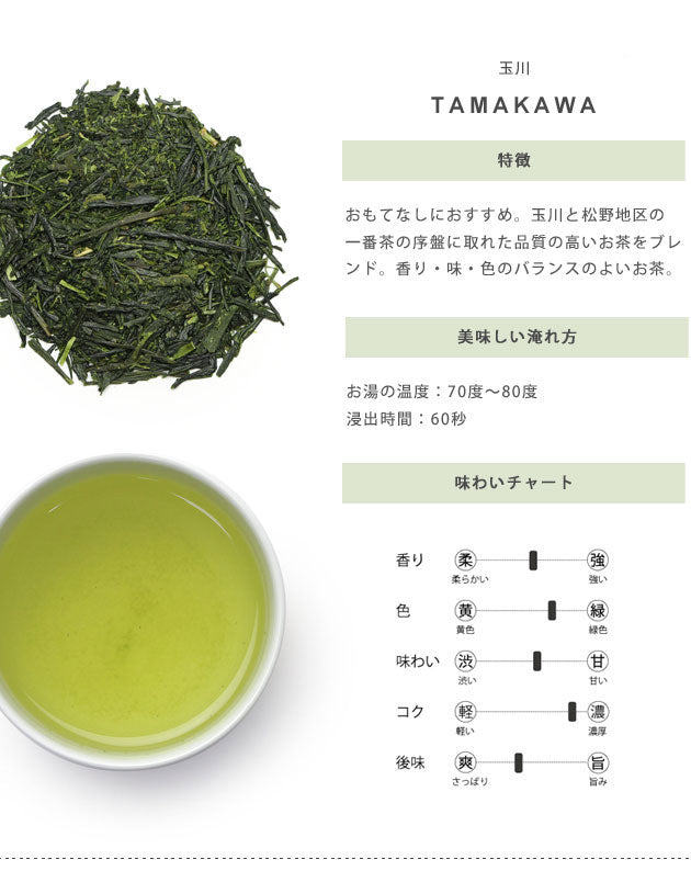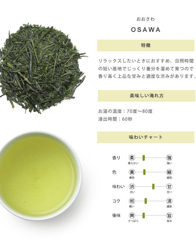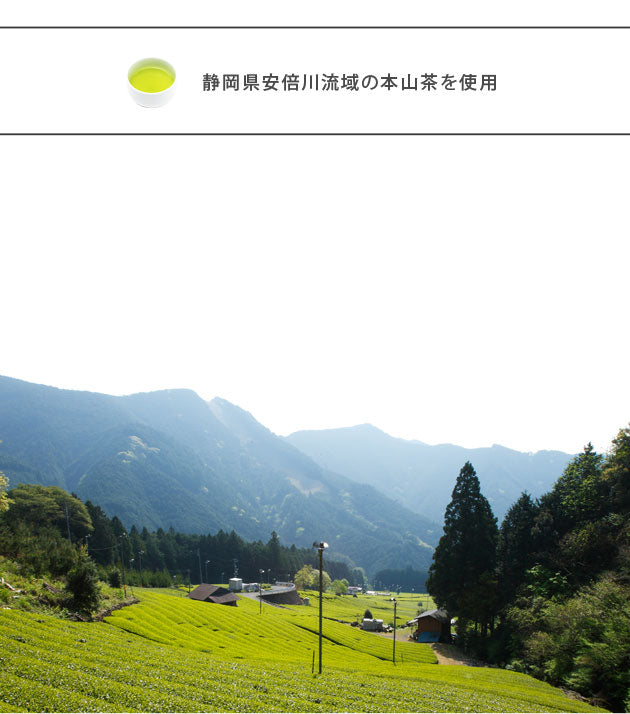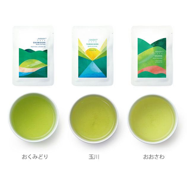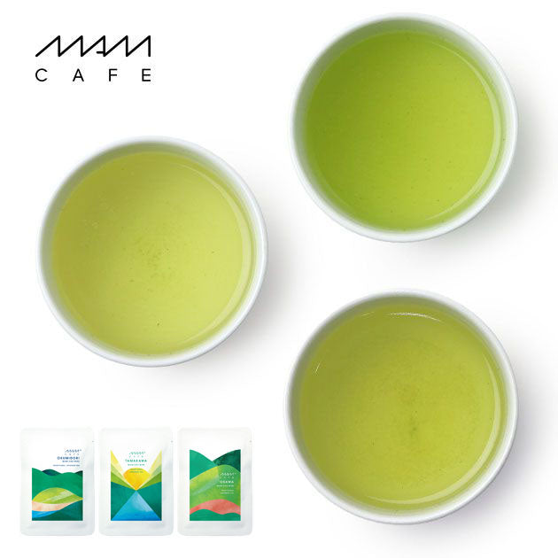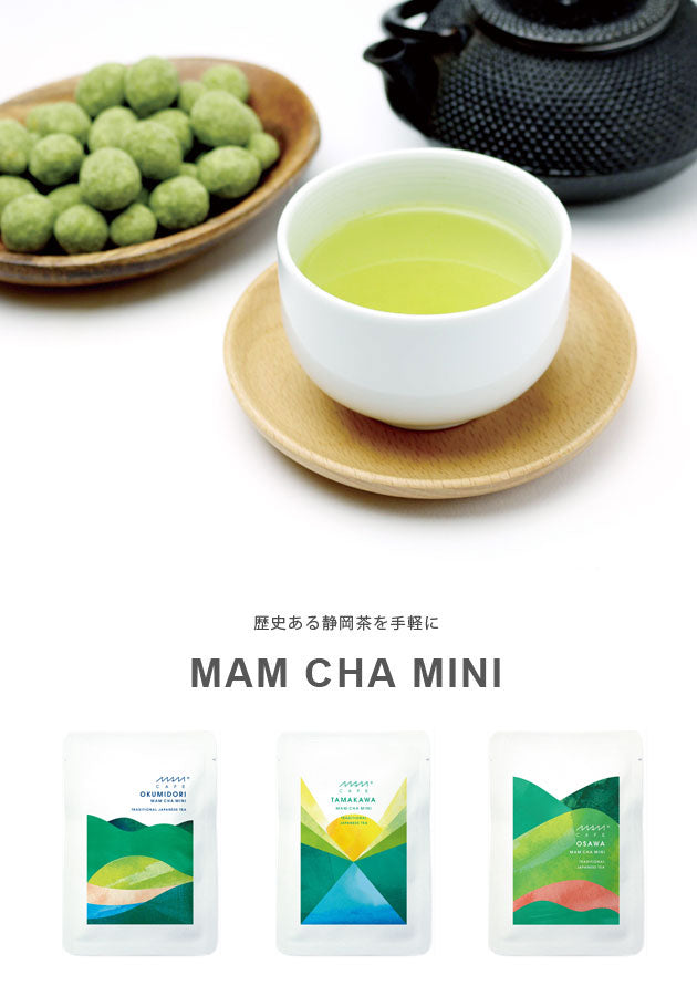 MAM-CHAは、静岡県静岡市安倍川上流にある茶産地で生産されたものです。MAM-CHAは「玉川(たまかわ)地区」と「松野地区」で作られており、この安倍川上流で作られたお茶は業界では、「本山茶(ほんやまちゃ)」と呼ばれています。おくみどり: 鮮やかな水色、スッキリとした味わいが特徴です。松野地区の「おくみどり」は深蒸し茶にすることで、鮮やかな緑色が引き出され、まろやかな口当たり、それでいてスッキリとした味わいがお楽しみ頂けます。玉川: 玉川地区と松野地区の一番茶の序盤に取れた品質の高いお茶を使用しました。心安らぐ優しい香りとまろやかな味わいを持つ玉川地区のお茶と、鮮やかな水色とコクのある味わいを持つ松野地区のお茶をブレンドすることで、お互いの良さを調和させて、香り・味・色とバランスが取れた煎茶に仕上げました。後味は、心地良い渋味があり、サッパリとお飲み頂ける為、飲み飽きないお茶としてお楽しみいただけます。おおさわ: 柔らかく心安らぐ香りときめ細やかで透明感のある味わいをもつ「大沢」は、リラックスしたいときにおすすめのお茶です。熱湯を少し冷ましたお湯で入れると柔らかい香りが立ち、甘味や旨みが出てきます。その上質で心安らぐ香りや、味わいから、オフィスでの休憩時や、家事が終わってリラックスしたいときにおすすめです。