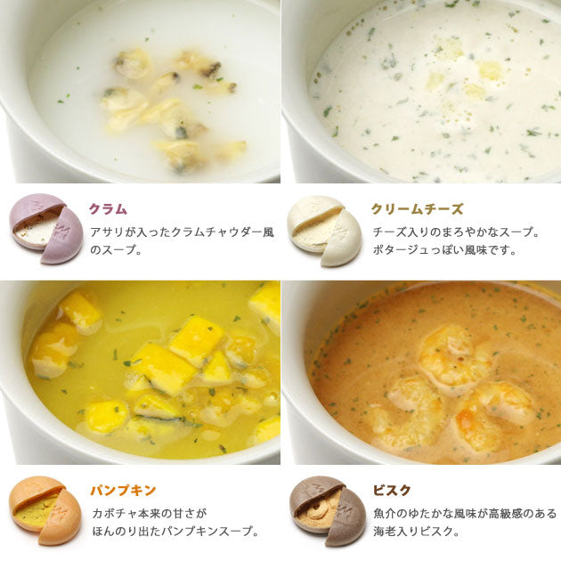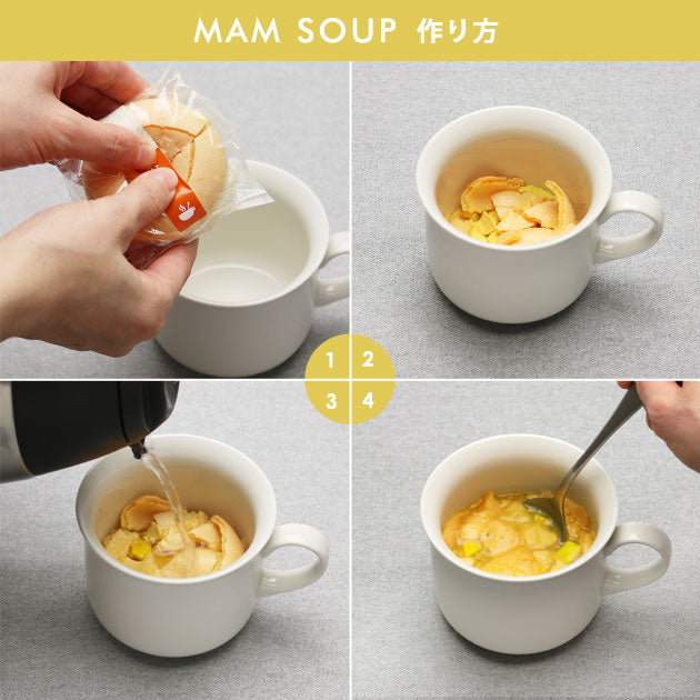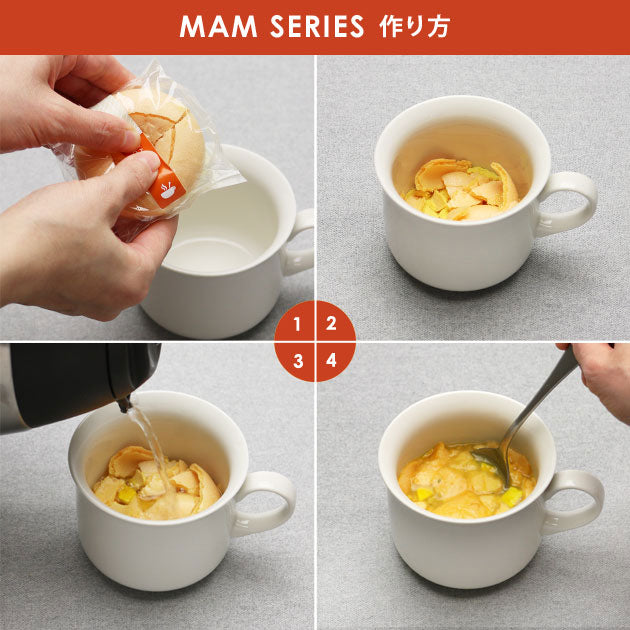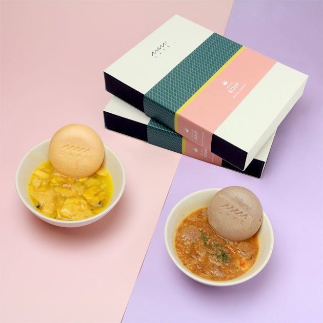 もち米を使用して1つ1つ手作りで作られた最中の中に、美味しいスープを閉じ込めました。マカロンのような可愛らしい見た目で、ギフトを選ぶ人、そしてそれをもらって食べる人、みんなが「どれにしようか?」と楽しい悩みに頭を抱えます。「MAM SOUP 06」シリーズはクリーミーな優しいスープシリーズ。アサリ入りのクラムスープ、チーズがまろやかなクリームチーズスープ、ほっくりしたカボチャ入りのパンプキンスープ、魚介の豊かな風味が楽しめるビスクをご用意しました。