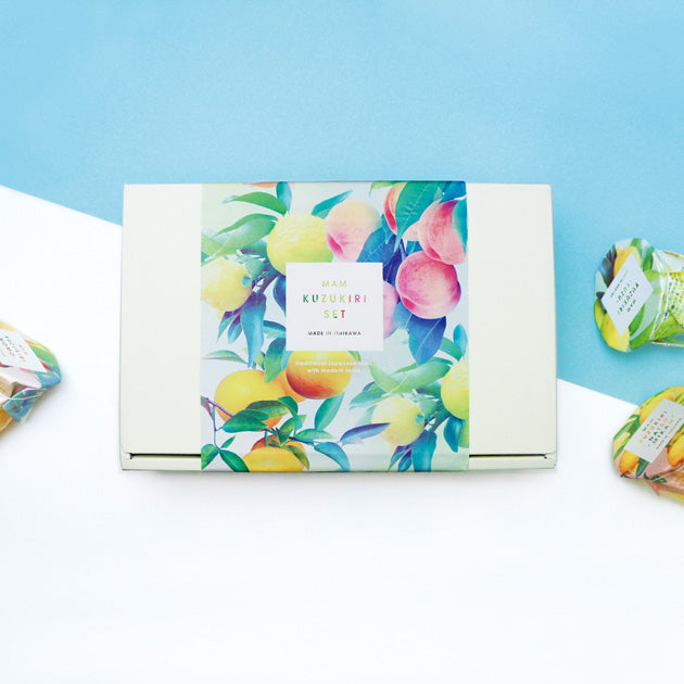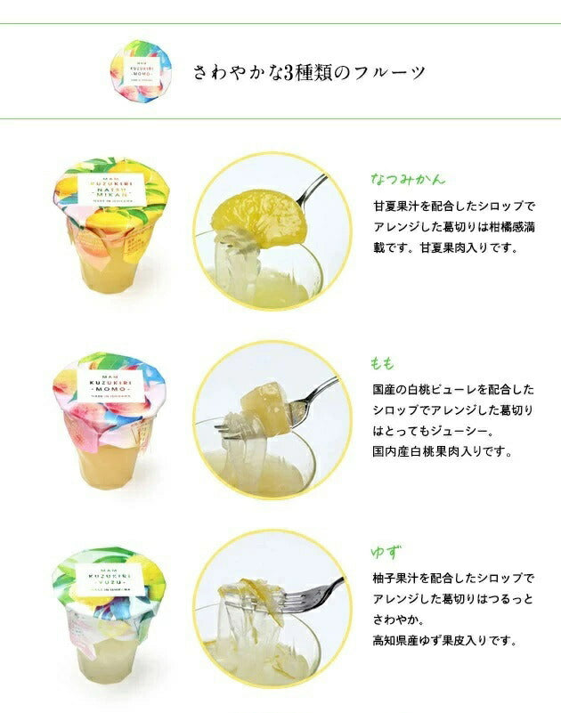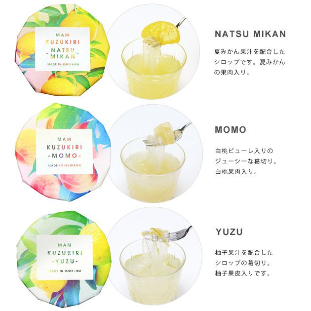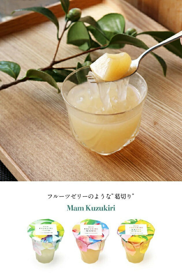 つるんとした喉越しと、透きとおるような見た目。まさに夏の“涼”を呼ぶ葛切り。「MAM KUZUKIRI」はフルーツ果汁に果肉入りで昔ながらの葛切りとは一味違う、フルーツゼリーのような葛切りです。すべて国産果肉、国産果汁。