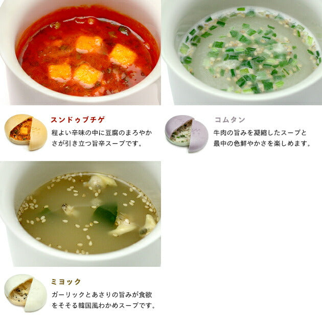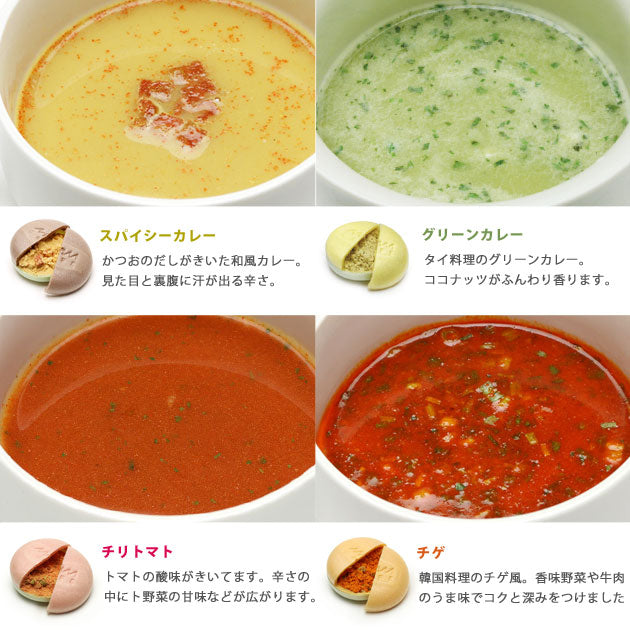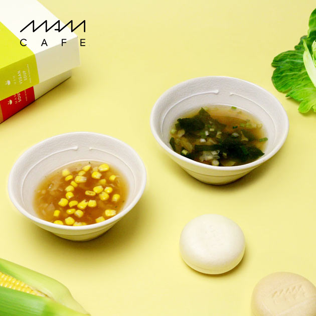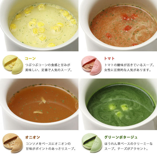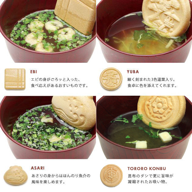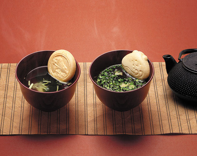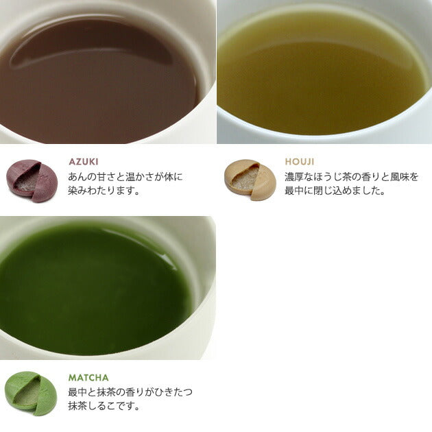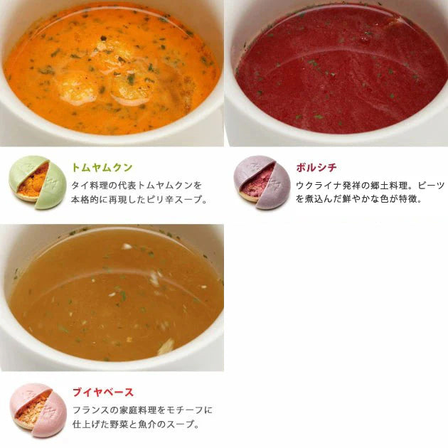 もち米を使用して1つ1つ丁寧に作られた最中の中に、おいしいスープとお吸い物を閉じ込めました。味ごとに異なる可愛らしい見た目は「選ぶたのしさ」を、手軽に作れるのに本格的な味わいは「食べるよろこび」をご提供します。